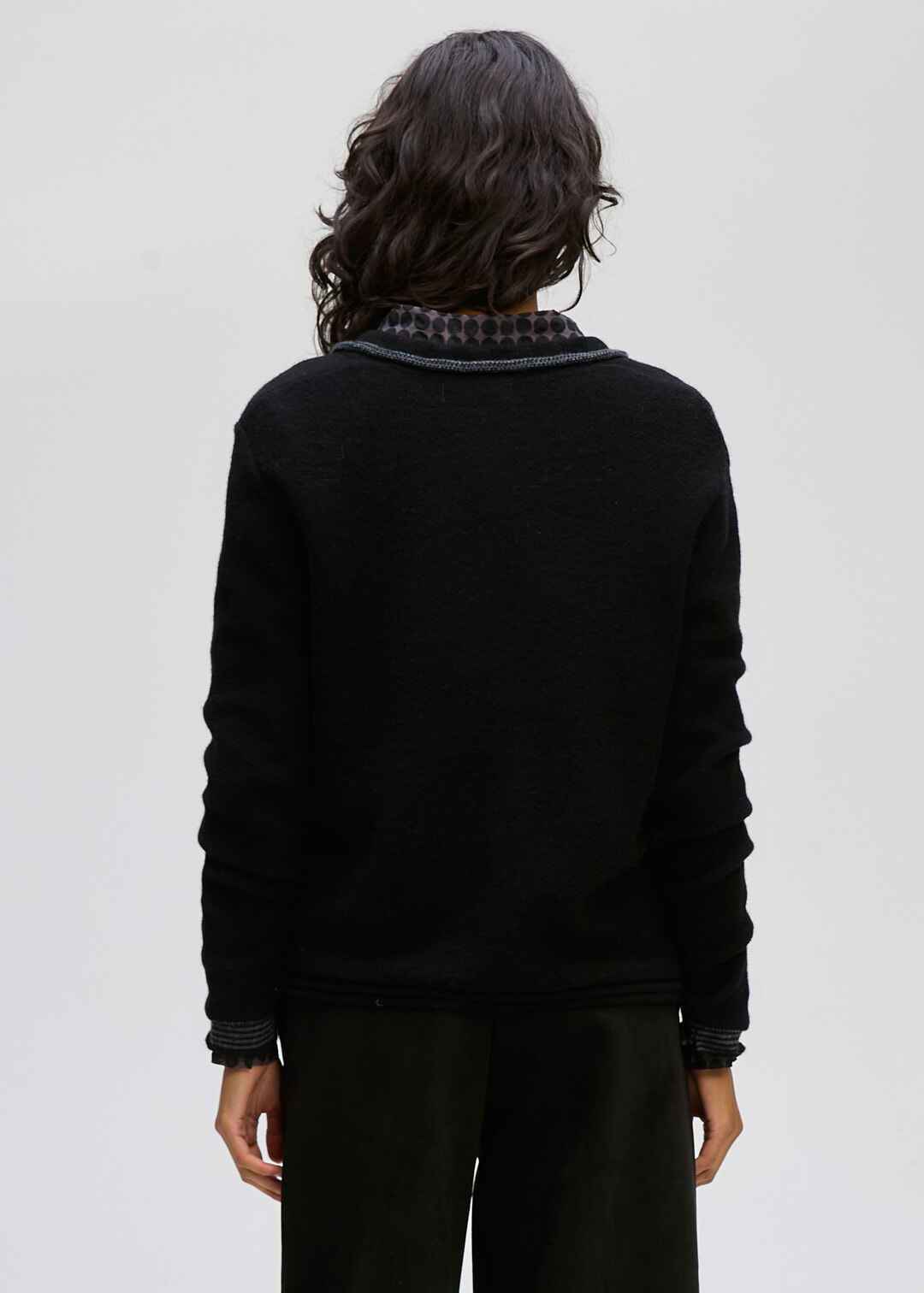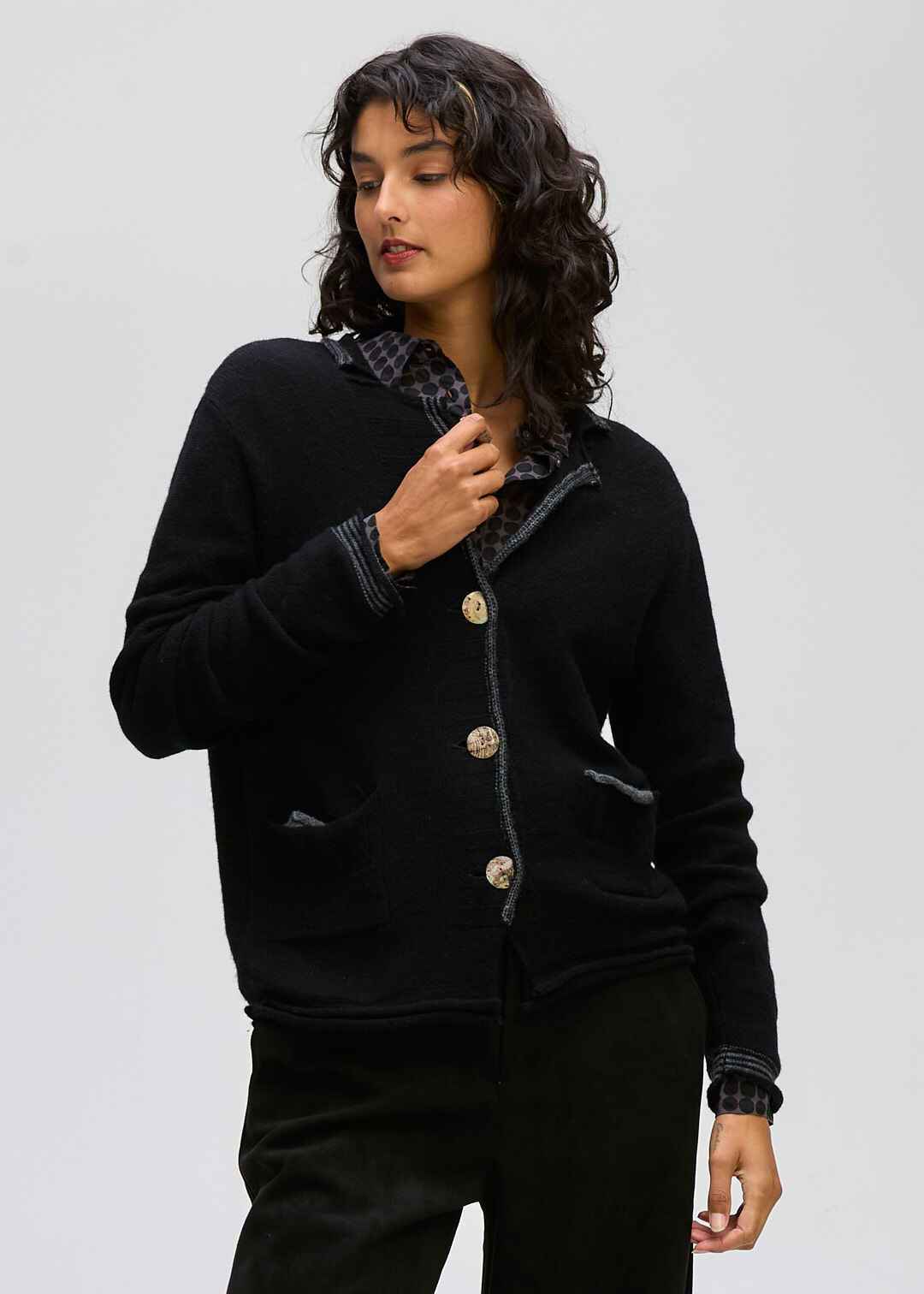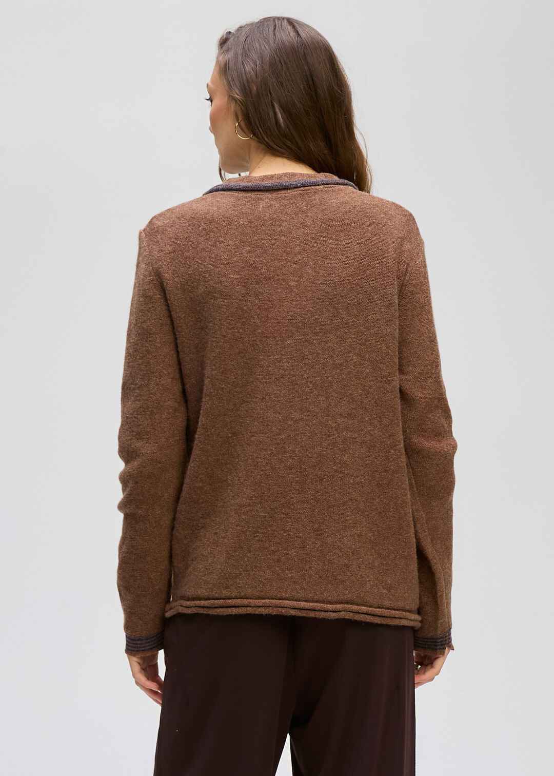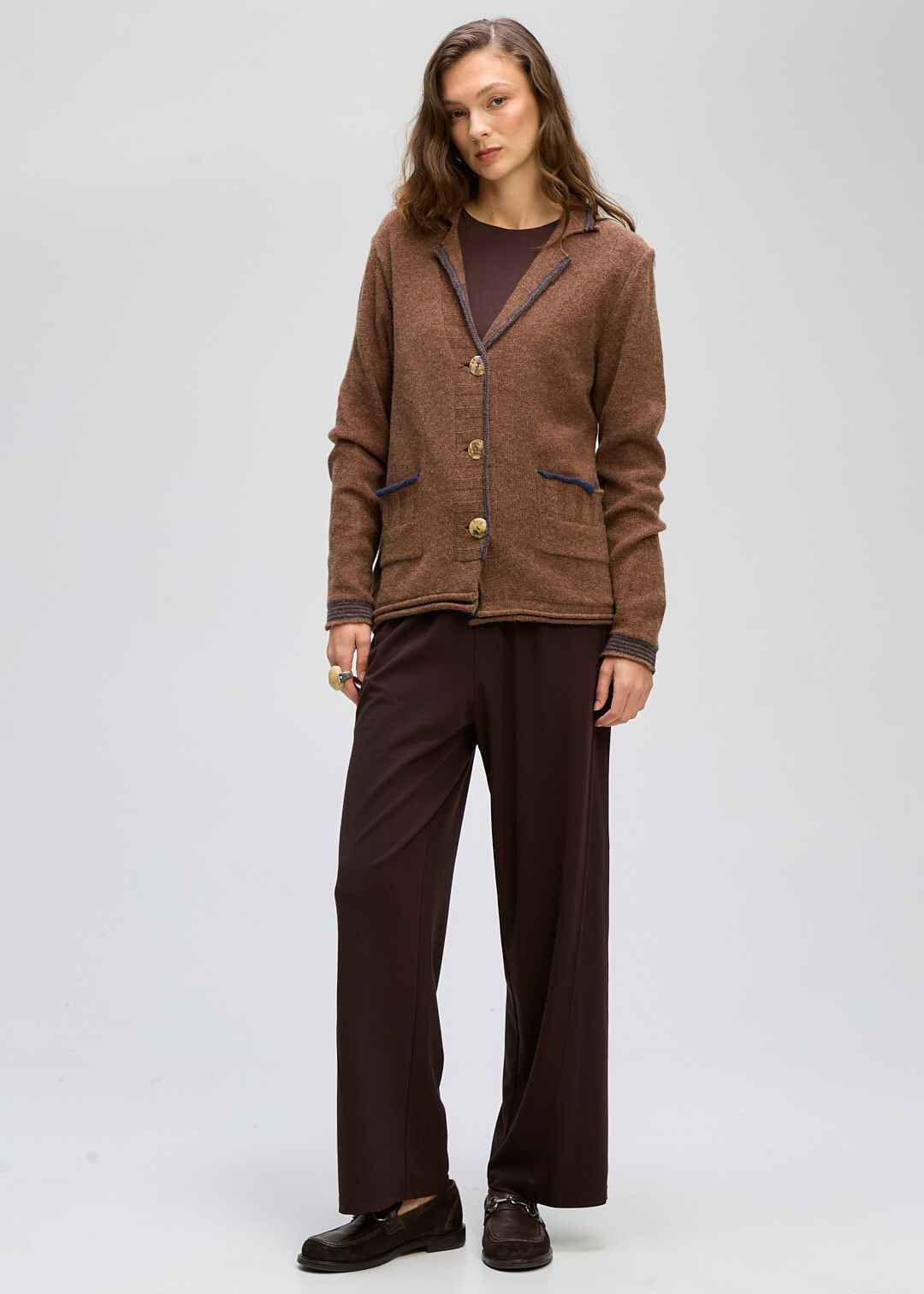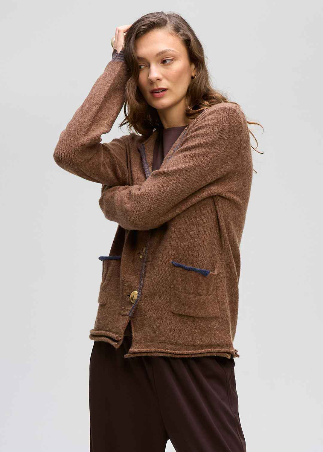 A refined layering piece with subtle detail. This soft knit cardigan features a classic button-front design, relaxed fit, and functional front pockets. Finished with contrast trim along the edges and cuffs, it adds a modern touch to a timeless silhouette. Perfect for layering over shirts or tees, available in classic black and warm brown tones.