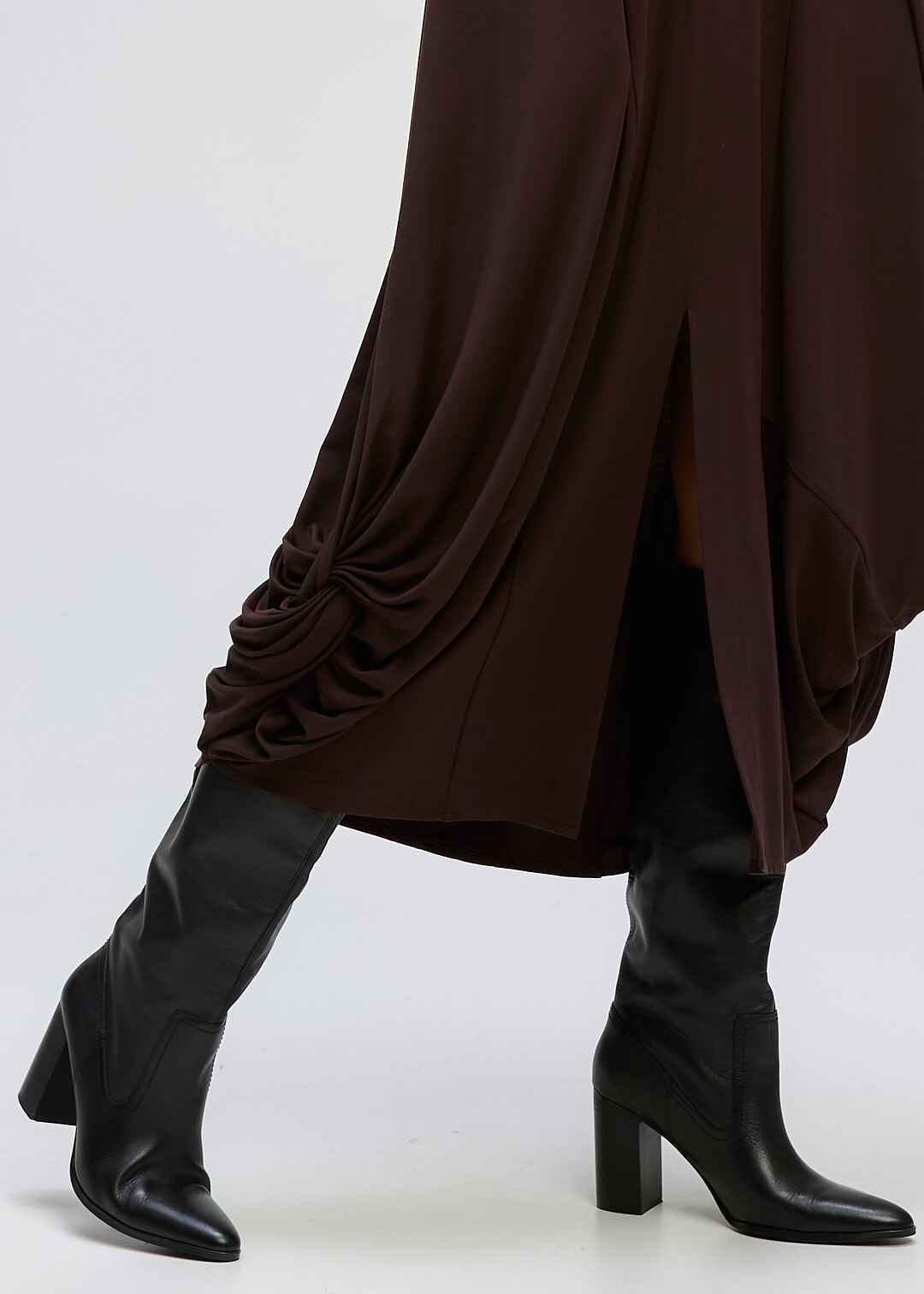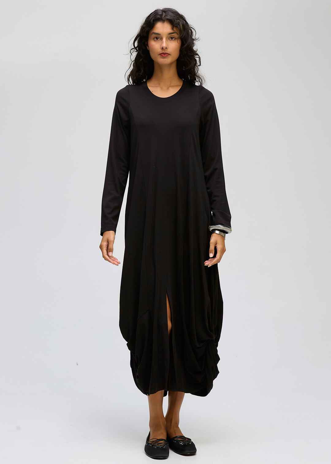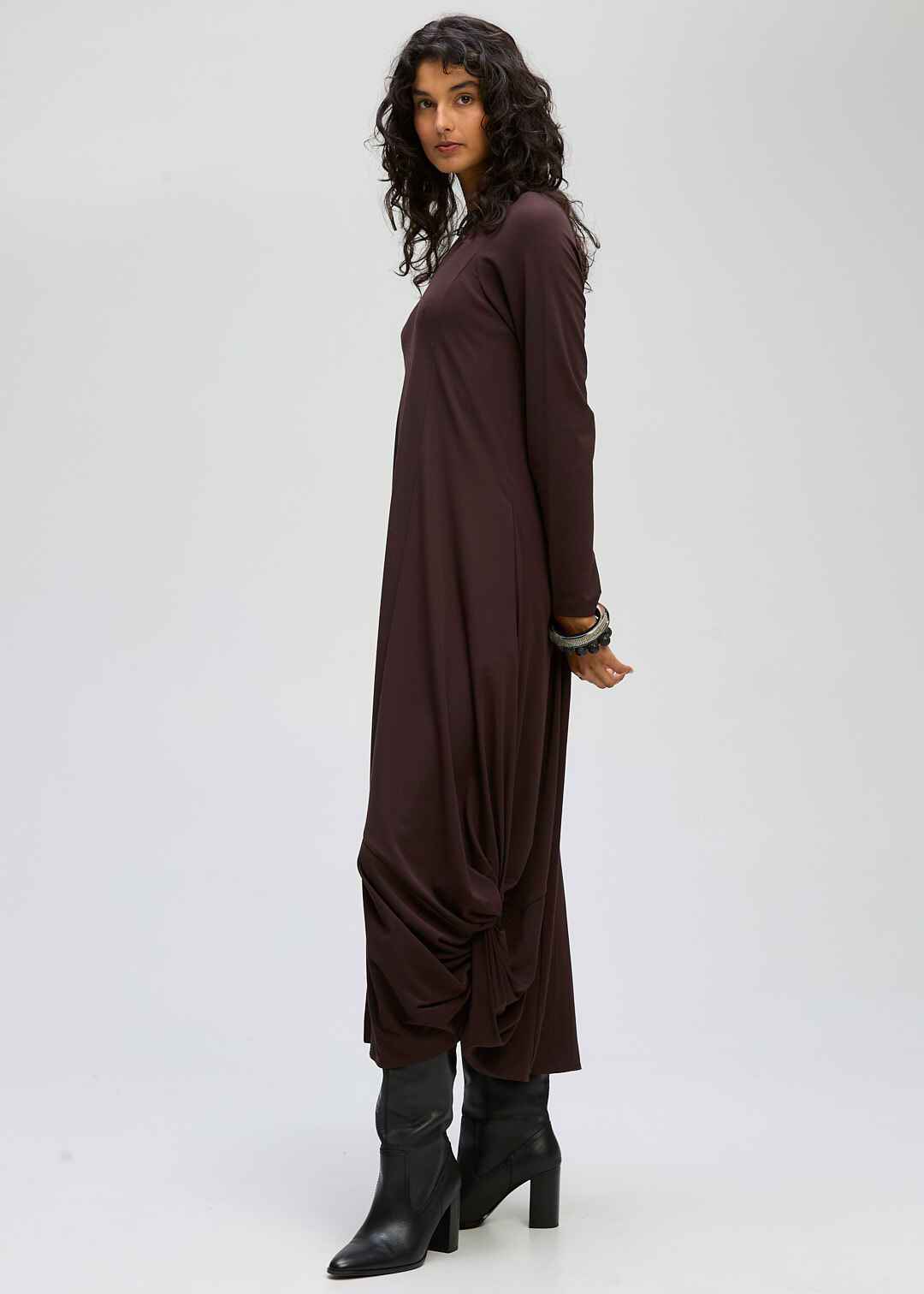 A modern essential with effortless movement, this long sleeve midi dress features a relaxed silhouette and soft draped detailing at the sides for added shape and flow. Designed with a classic round neckline and subtle front split, it offers both comfort and understated elegance. Perfect for everyday wear or elevated styling, available in timeless black and rich chocolate tones.