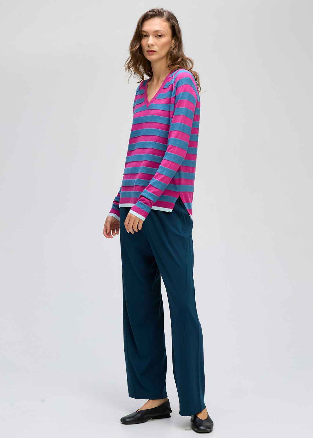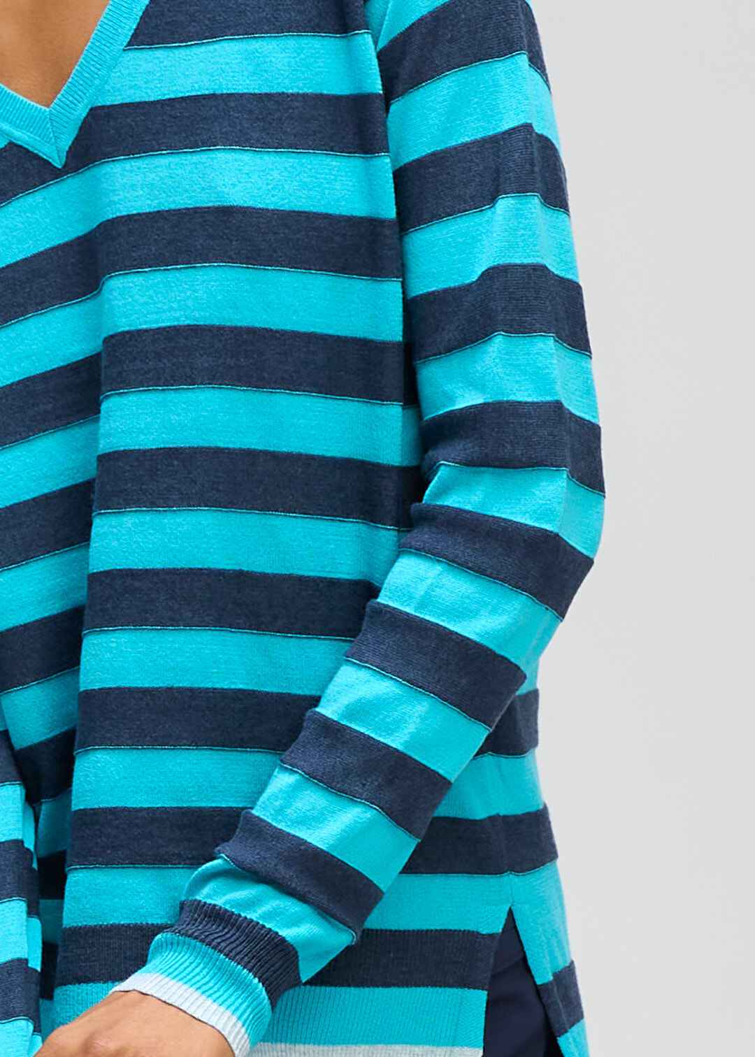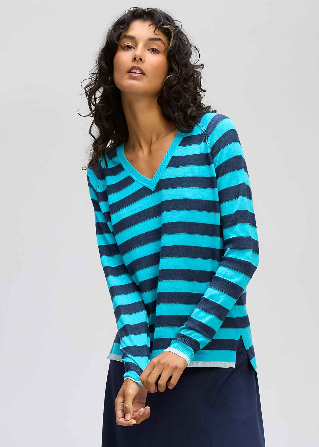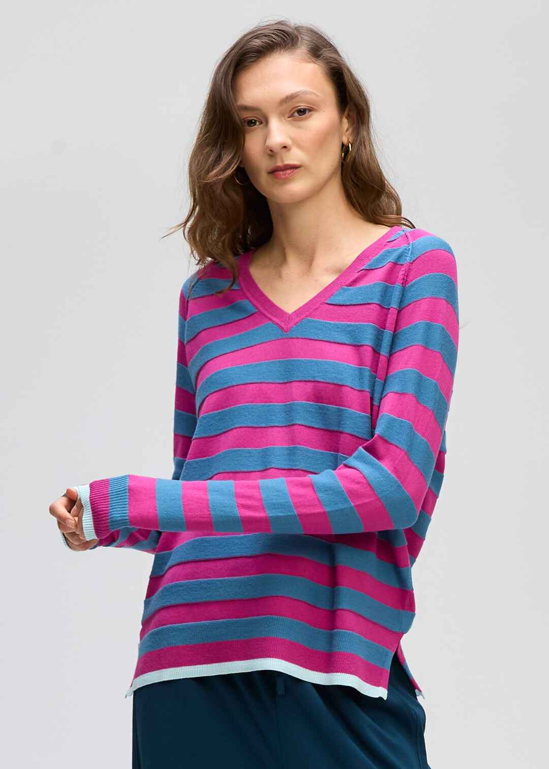 A timeless wardrobe staple with a fresh, modern feel. This lightweight V-neck knit features bold horizontal stripes and a relaxed, easy fit for everyday comfort. Designed with long sleeves and a flattering neckline, it’s perfect for layering or wearing on its own. Available in a range of vibrant colour combinations to brighten your seasonal style.