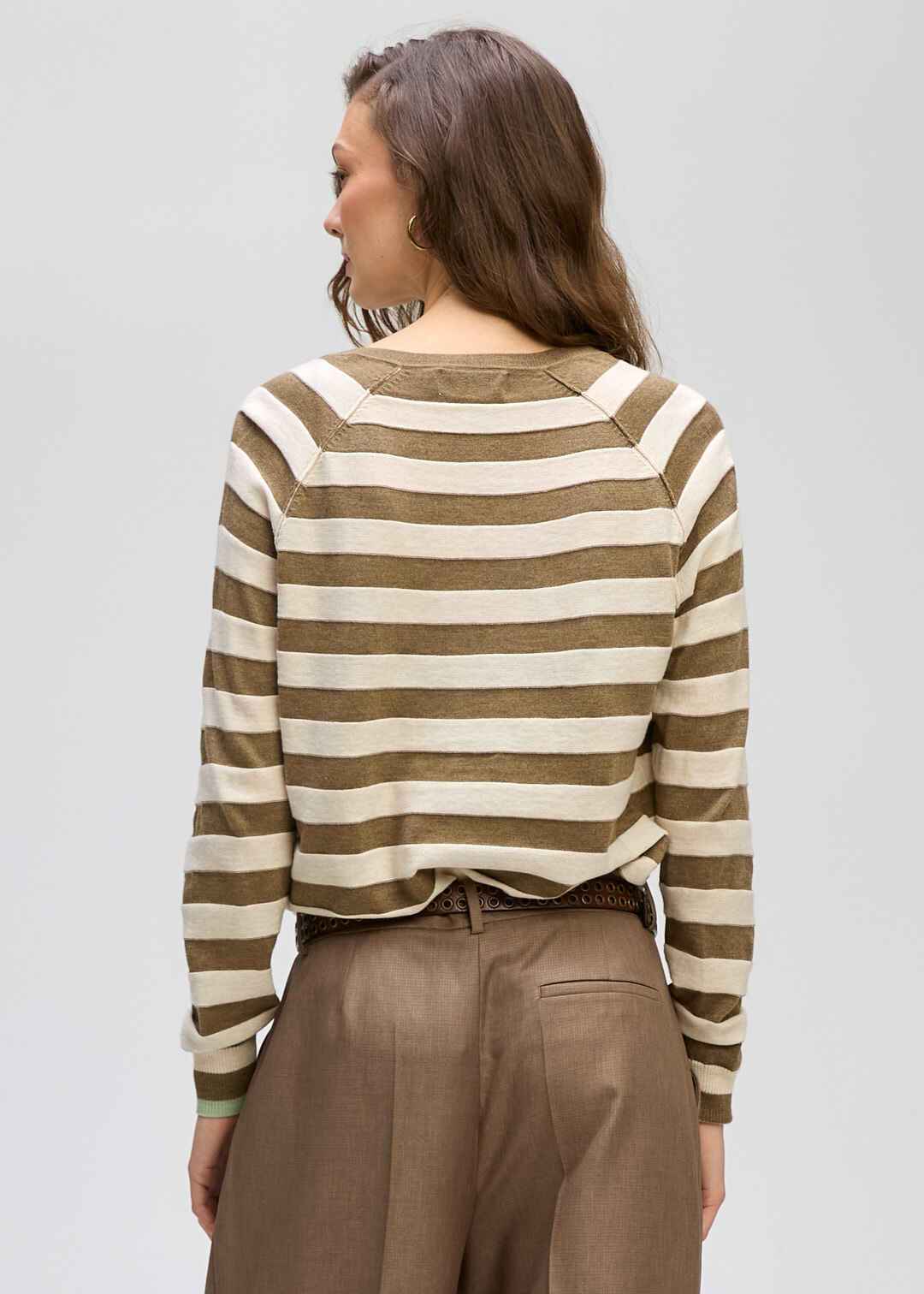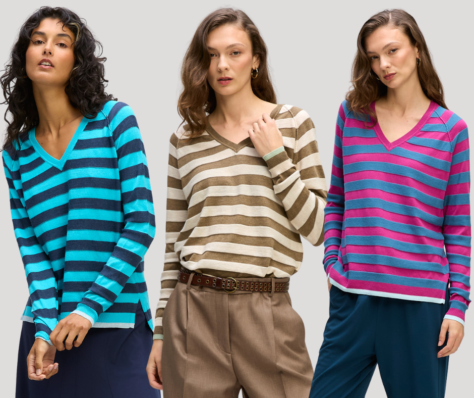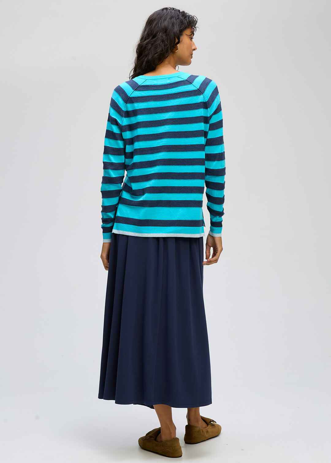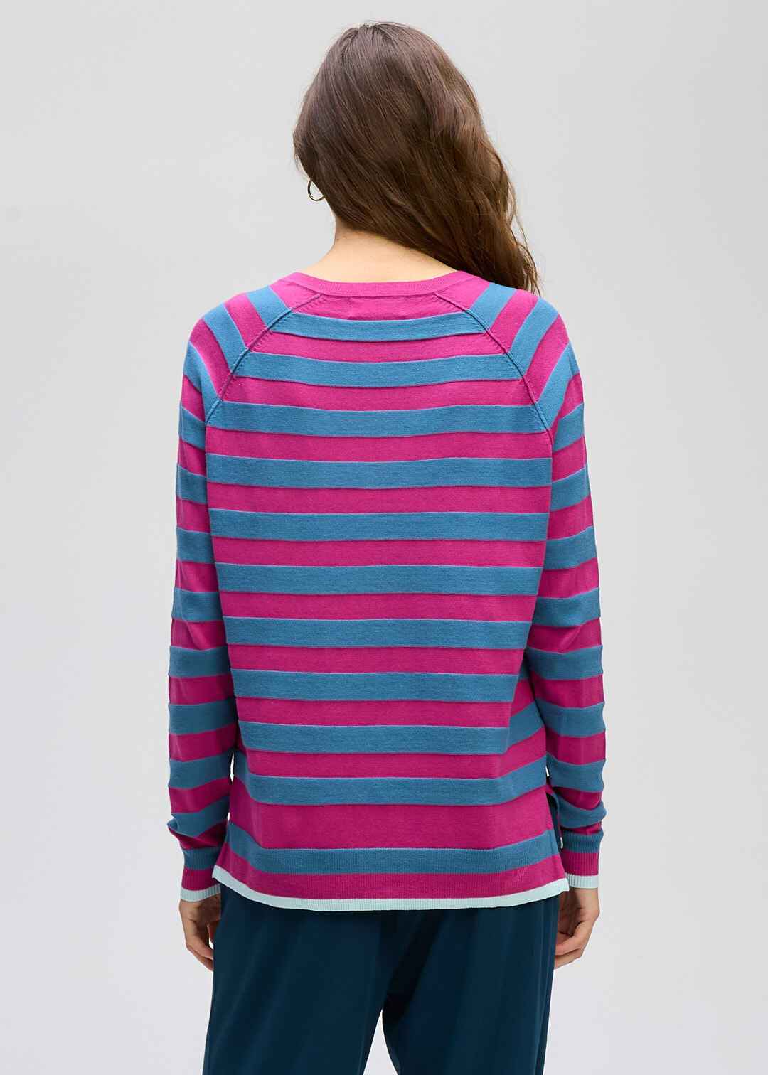 A timeless wardrobe staple with a fresh, modern feel. This lightweight V-neck knit features bold horizontal stripes and a relaxed, easy fit for everyday comfort. Designed with long sleeves and a flattering neckline, it’s perfect for layering or wearing on its own. Available in a range of vibrant colour combinations to brighten your seasonal style.
