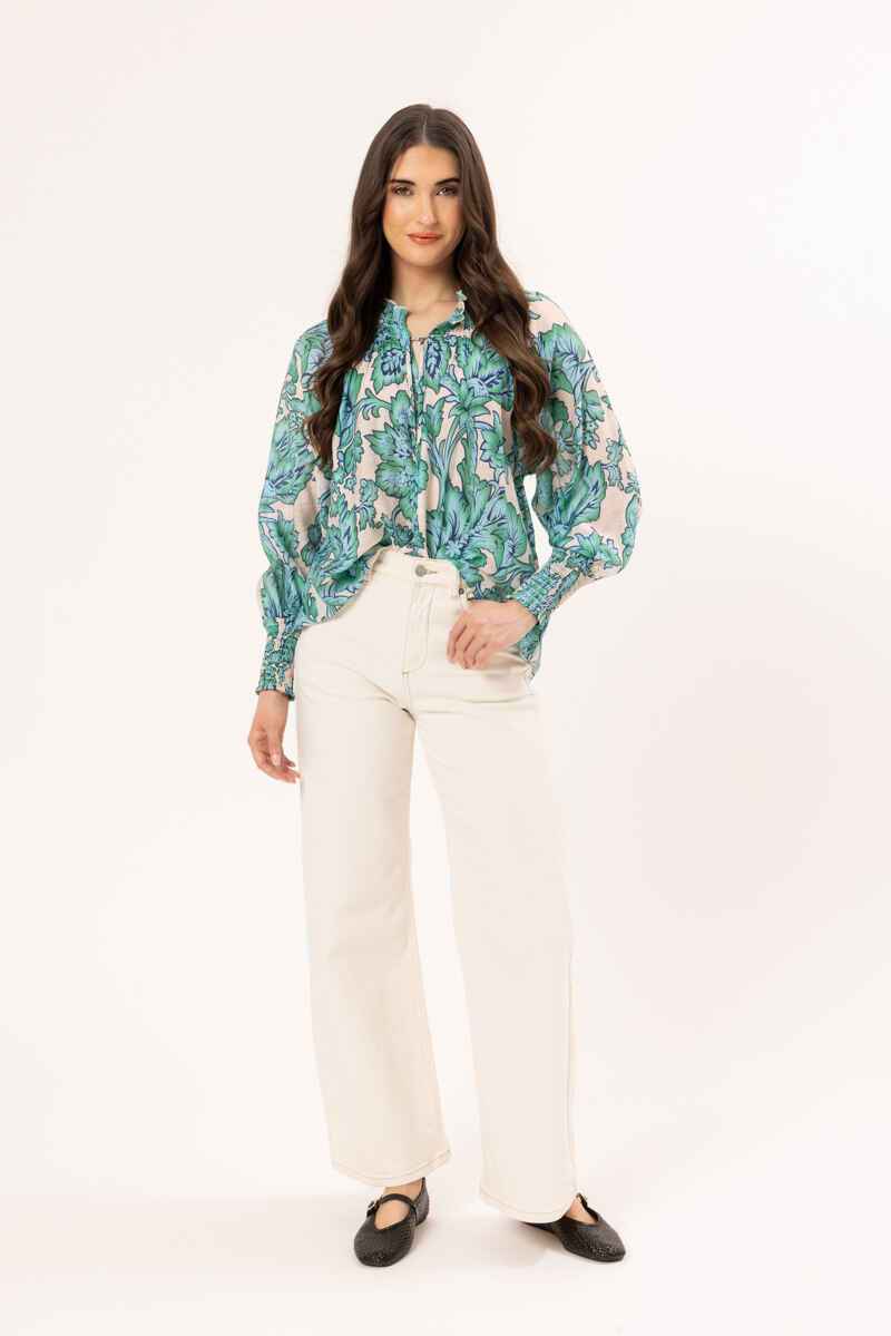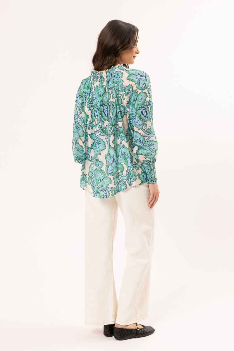 The Encourage Top in Aqua Charm is a fresh, feminine blouse featuring a vibrant aqua and green botanical print on a soft neutral base. Designed with a gathered neckline and delicate tie detail, it’s finished with long sleeves and elegant shirred cuffs for a flattering, relaxed fit. Perfect styled with tailored trousers or your favourite denim.