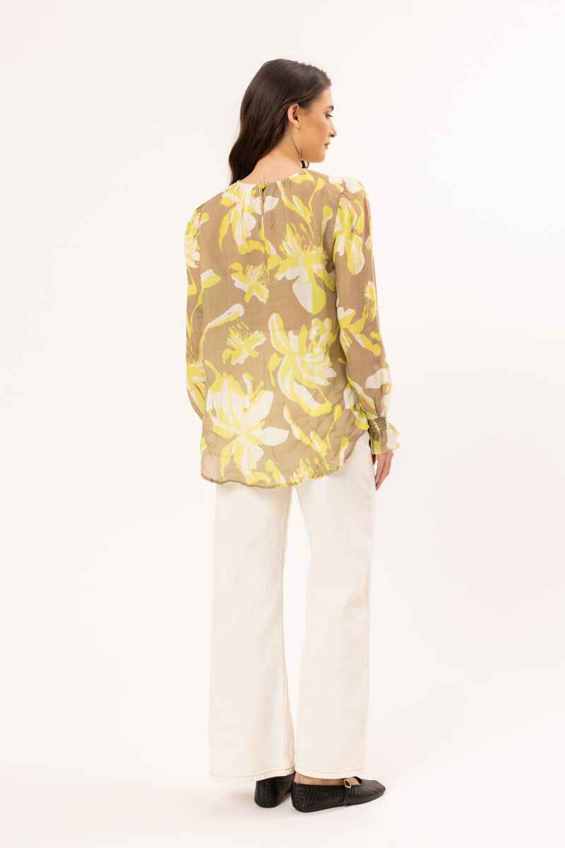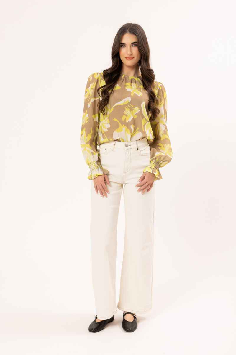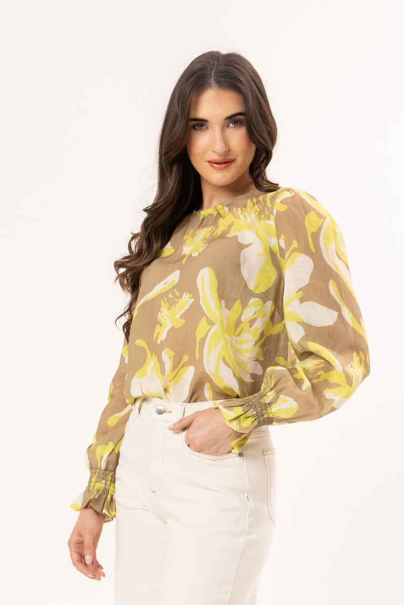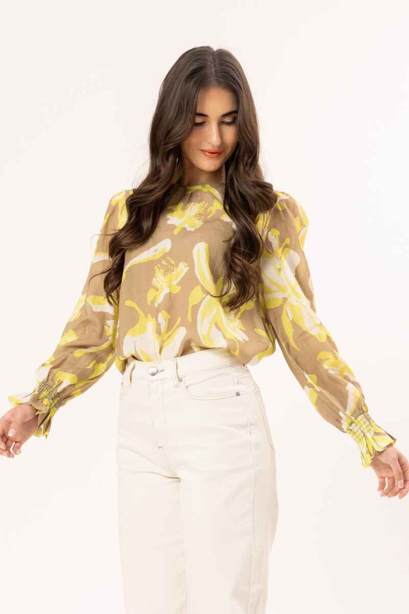 A soft and sophisticated blouse featuring a warm taupe base adorned with an abstract floral print in vibrant yellow and white tones. Crafted from a lightweight, semi-sheer fabric, it offers an airy, elegant feel while gently draping over the body. The high neckline adds a refined touch, while the long sleeves are finished with delicate shirred cuffs that create subtle volume and texture. Effortlessly versatile, this piece pairs beautifully with tailored pants or denim for a polished yet relaxed look.