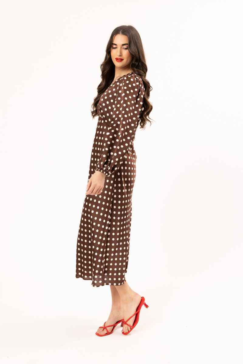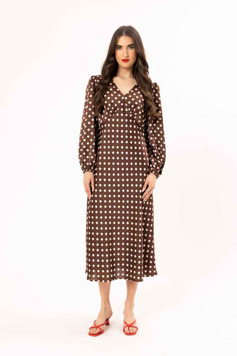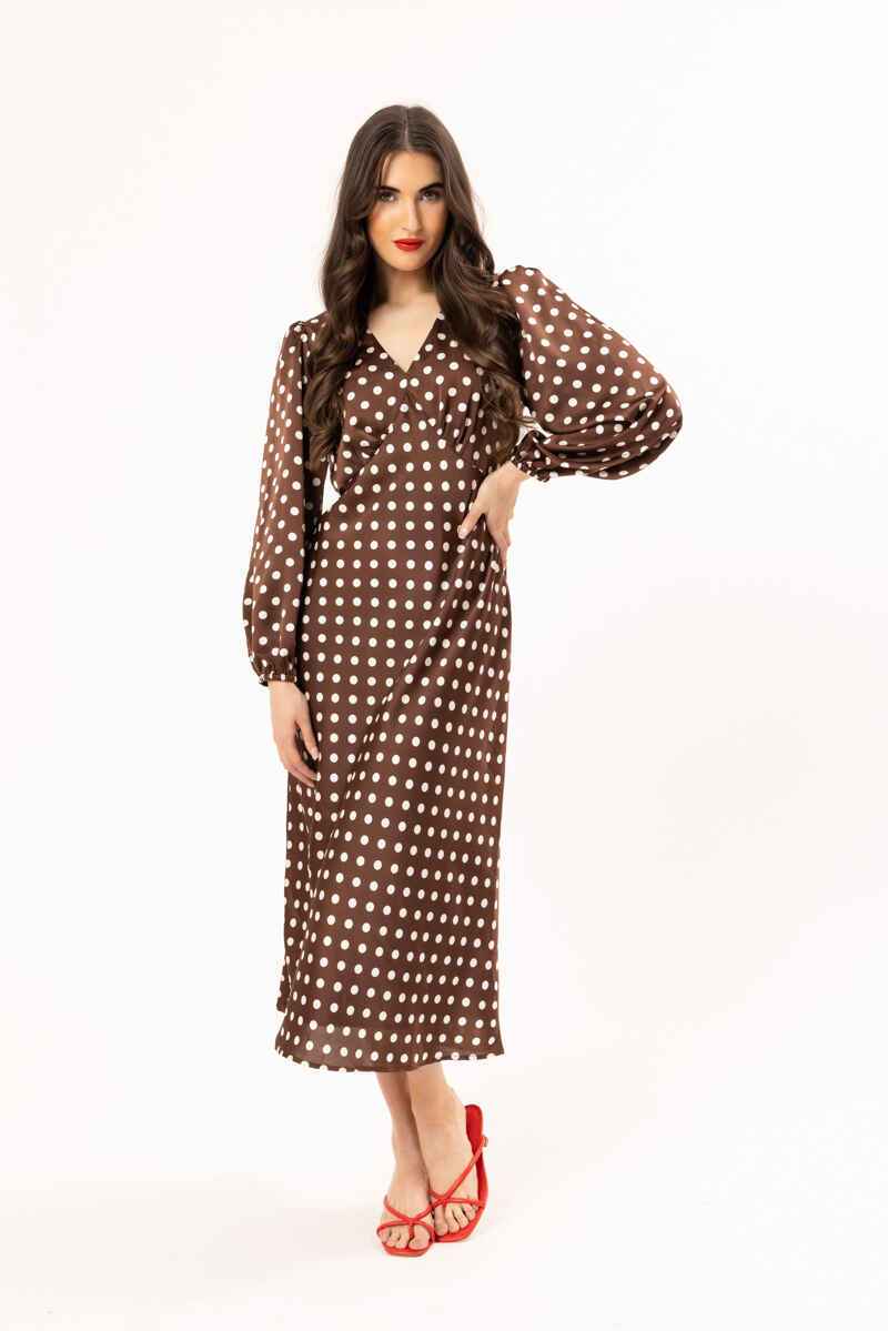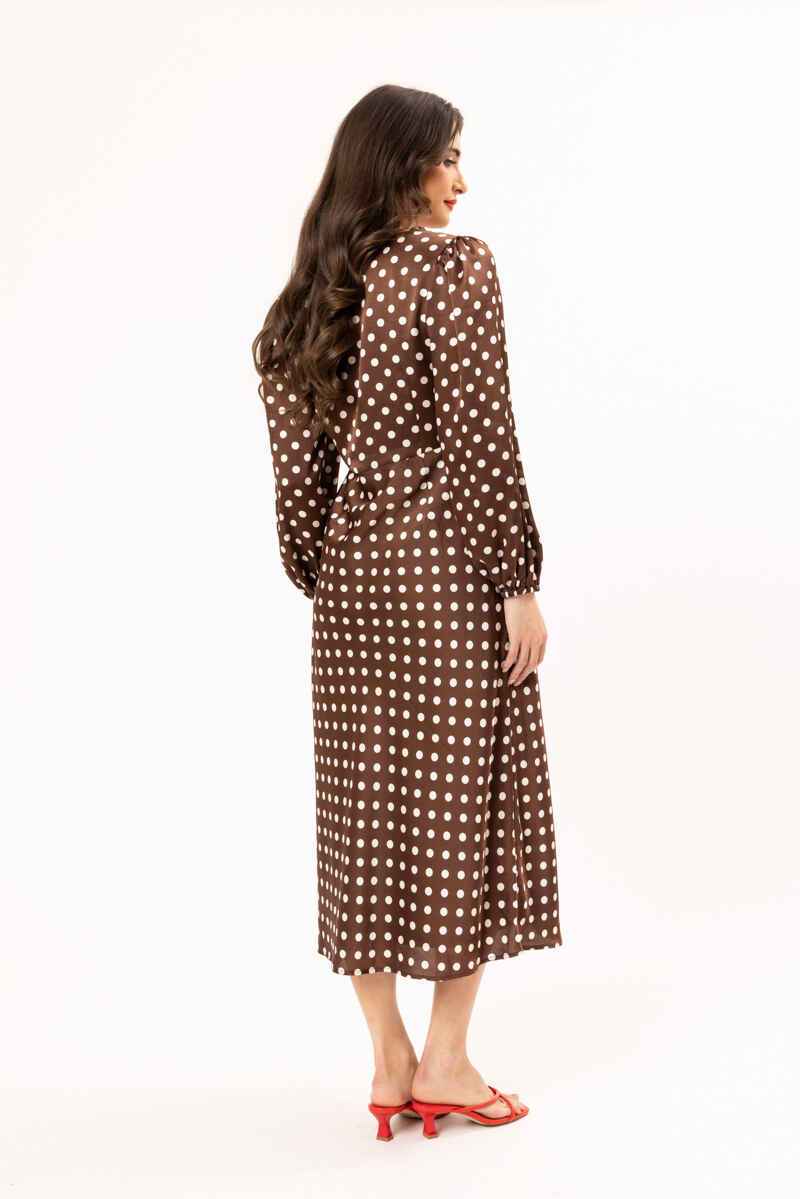 A feminine and effortlessly elegant midi dress in a warm walnut-brown tone, featuring a classic white polka dot print. Designed with a flattering wrap-style V-neckline and softly structured waist, it drapes beautifully into a flowy skirt that moves with ease. The long, slightly voluminous sleeves are finished with gathered cuffs, adding a touch of romantic detail. Perfect for both casual days and dressed-up occasions, this piece blends timeless charm with modern versatility.100% PolyesterCare Instructions:Wash inside out, cold gentle wash with similar colours. Do not soak or bleach. Line dry in shade, do not tumble dry. Dry cleanable. Always check the label.