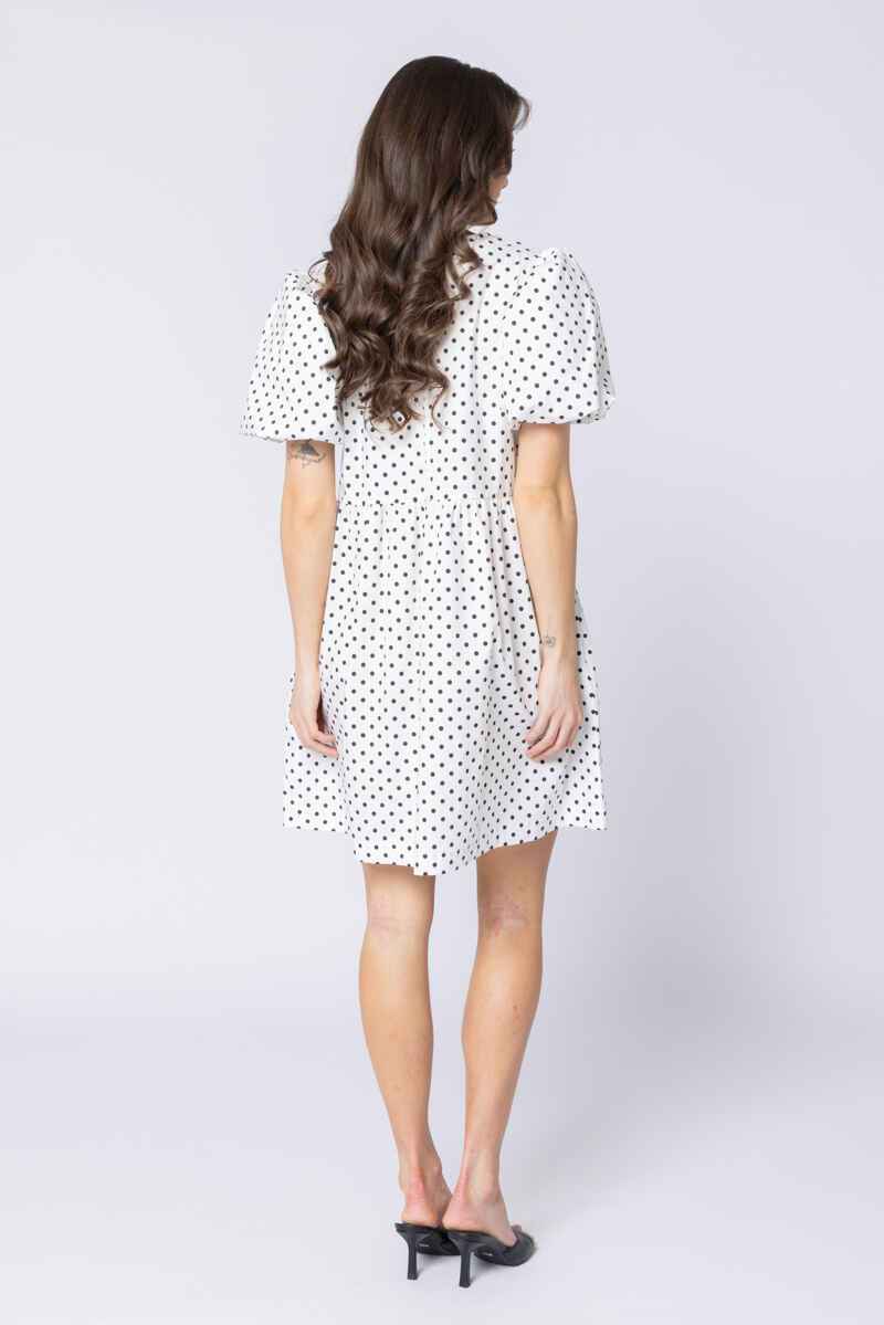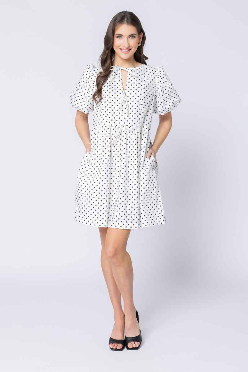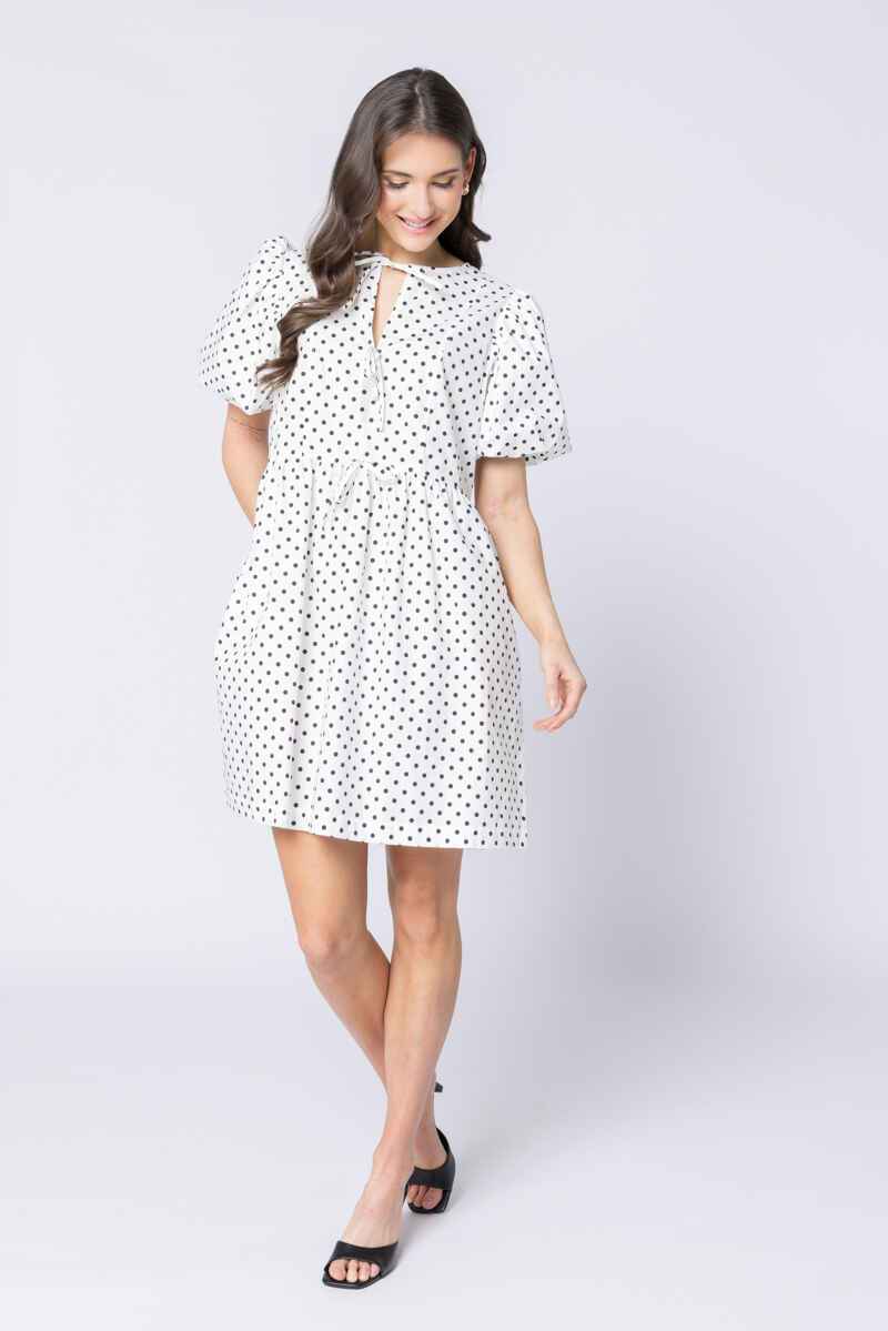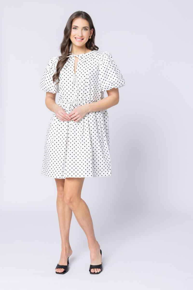 Playful yet beautifully polished, the Belle Bow Dress brings a fresh twist to a timeless favourite. Made from crisp cotton in a classic black-and-white spot, it features a sweet tie-neck detail and softly structured bodice that adds charm without feeling fussy. The voluminous puff sleeves create a flattering, modern silhouette, balanced by a relaxed, easy-to-wear shape through the waist and skirt. Falling to a breezy above-knee length, this dress is perfect for warm days, weekend outings, and effortless everyday style. A light, feminine piece that pairs easily with sandals, sneakers, or heels for instant chic.Main: 50% Cotton, 50% PolyesterLining: 100% Polyester