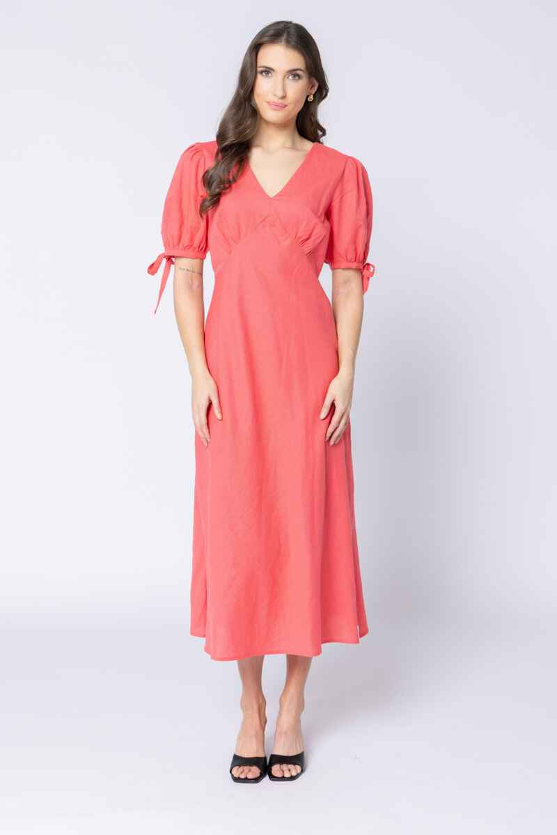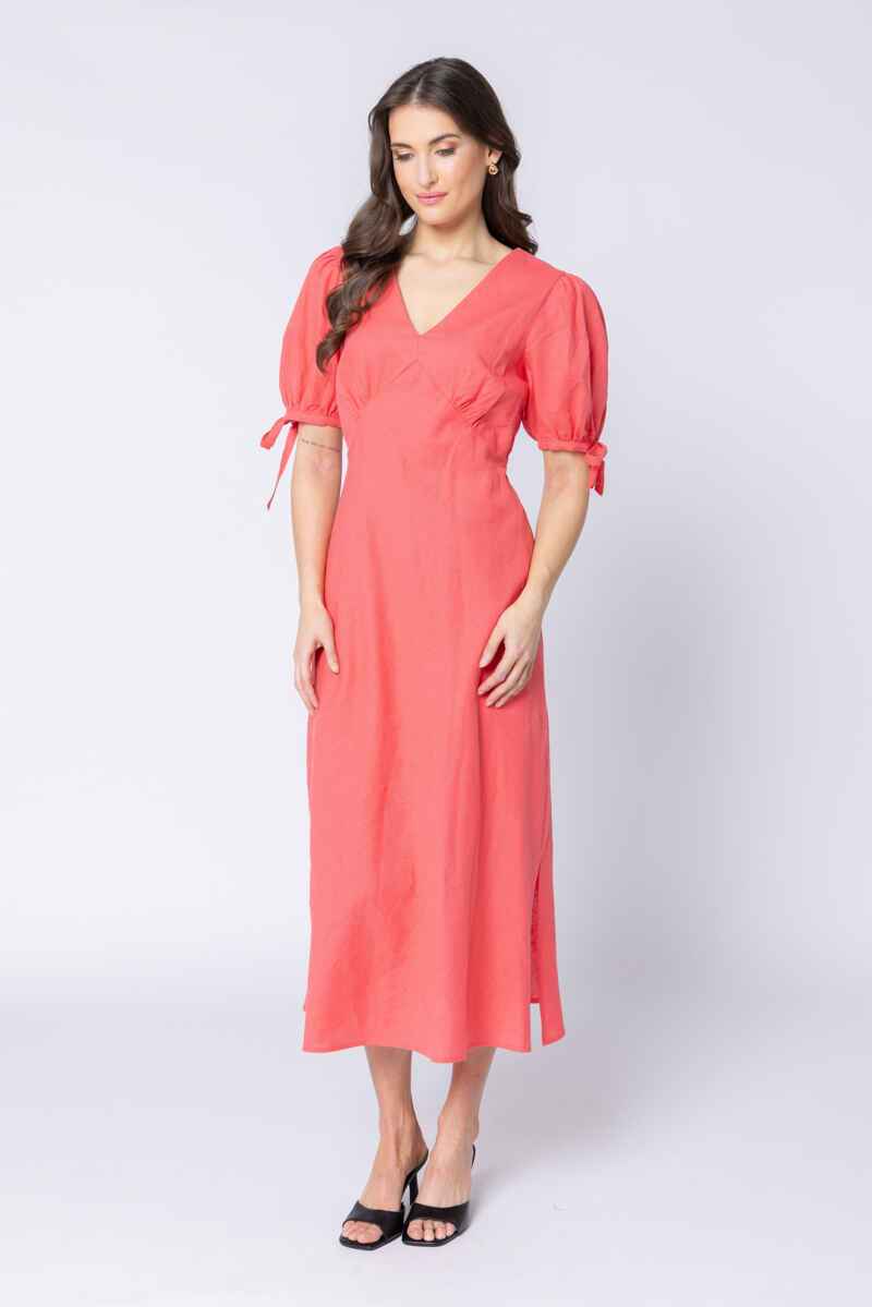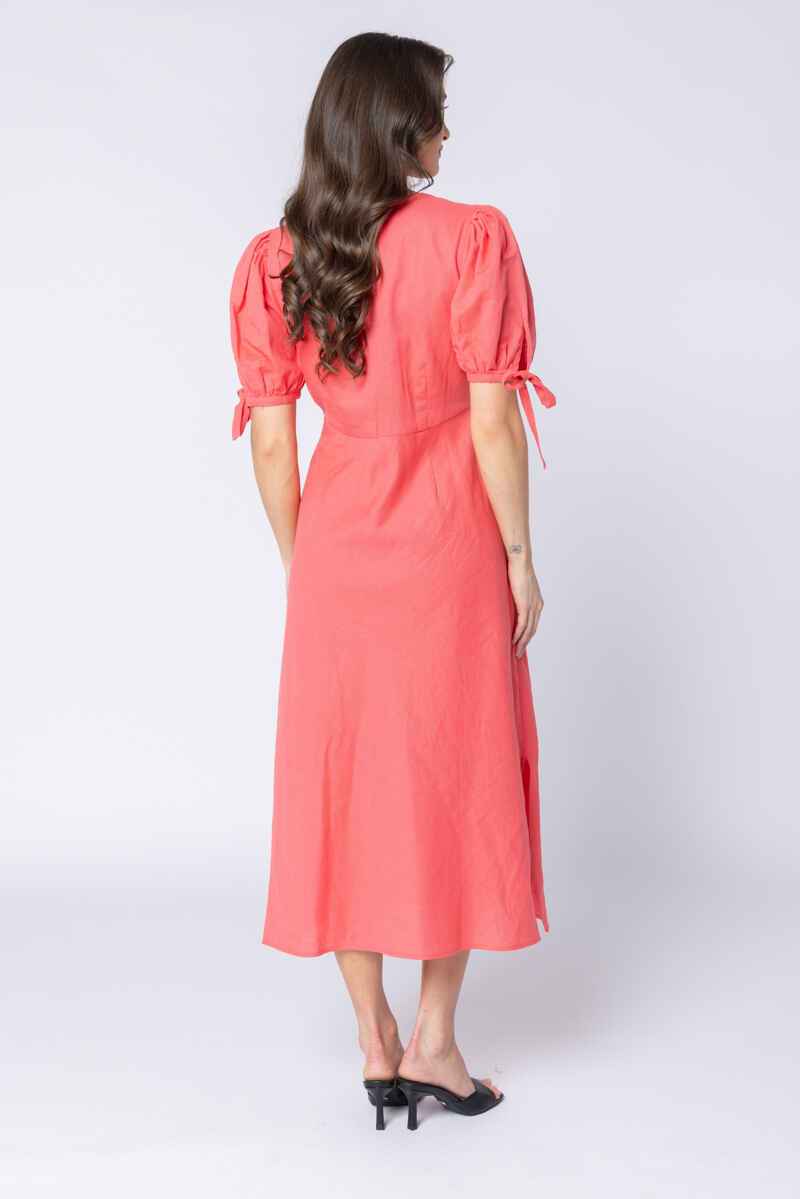 Bright, fresh, and beautifully feminine, the Gerbera Dress brings effortless elegance to any occasion. Crafted in a vibrant coral hue, it features a flattering V-neckline and softly shaped bodice that skims the figure in the most flattering way. The puff sleeves add a romantic touch, finished with delicate tie details for adjustable comfort and charm. Falling to a graceful midi length, the skirt includes a subtle side split that enhances movement and gives the dress an easy, modern feel. Perfect for sunshine-filled days, special events, or simply bringing colour to your everyday wardrobe, this dress blends simplicity and sophistication with ease.