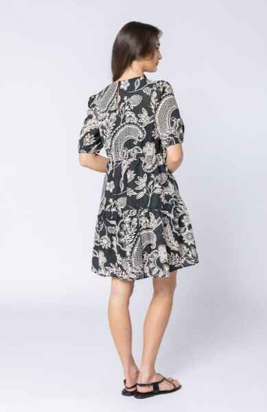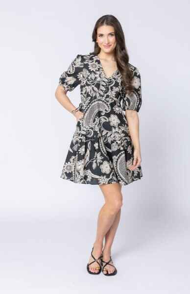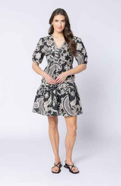 Playful yet sophisticated, this paisley print mini dress is a timeless addition to your wardrobe. Crafted from a lightweight, flowy fabric, it features a flattering v-neckline, short puff sleeves, and a relaxed A-line silhouette that falls beautifully above the knee. The monochrome paisley design adds a chic, modern touch that’s easy to dress up or down.
