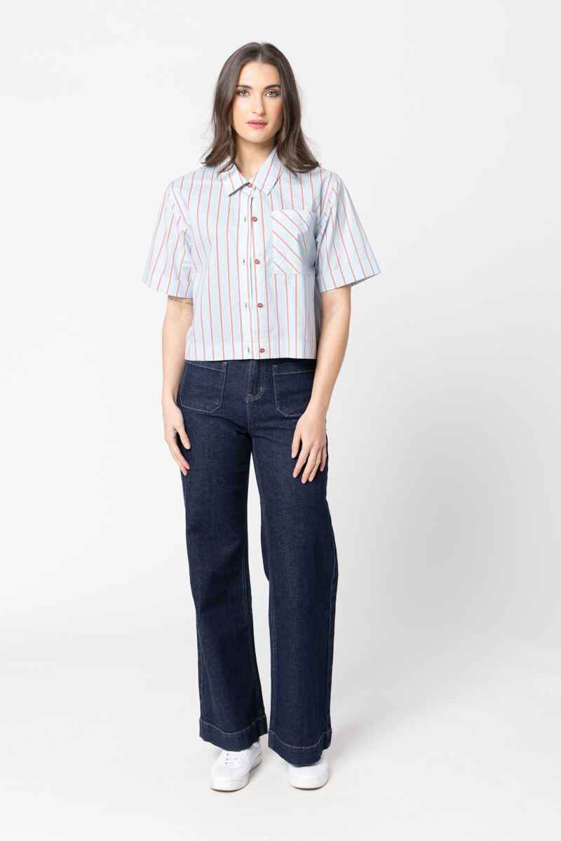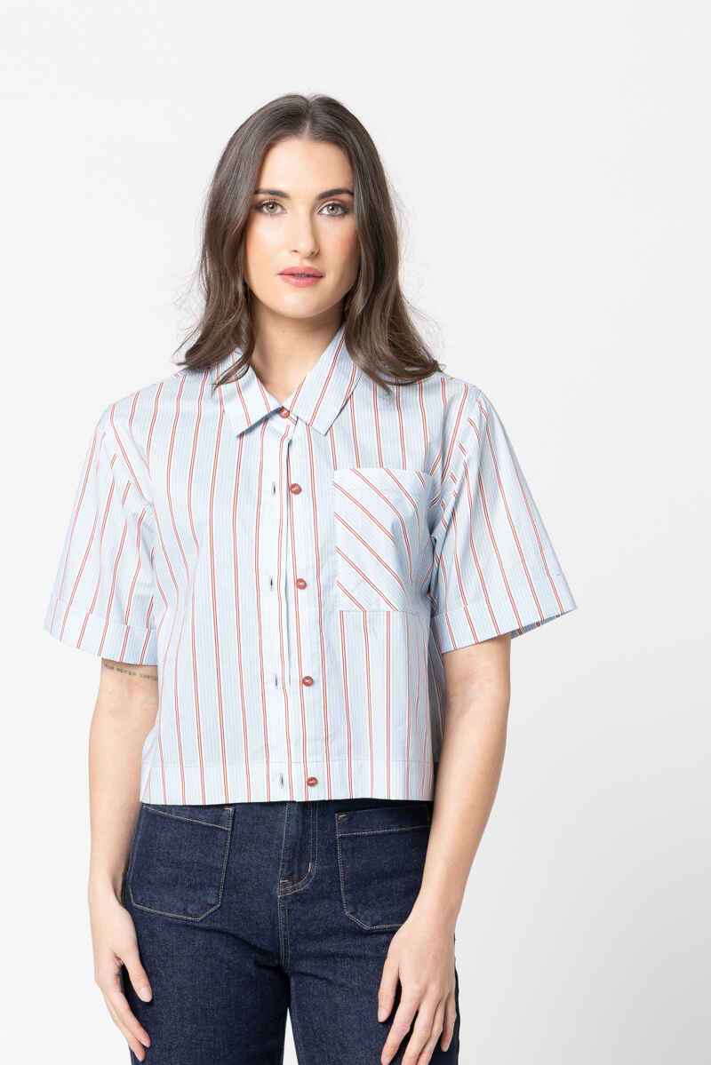 Elevate your casual wardrobe with this stylish cropped shirt, designed in a fresh powder blue base with vertical red and white stripes. Featuring short sleeves, a classic pointed collar, and a front button-down closure, this piece blends timeless tailoring with a modern cropped silhouette. The chest pocket, cut on the diagonal, adds a playful contrast to the striped pattern for a unique touch.