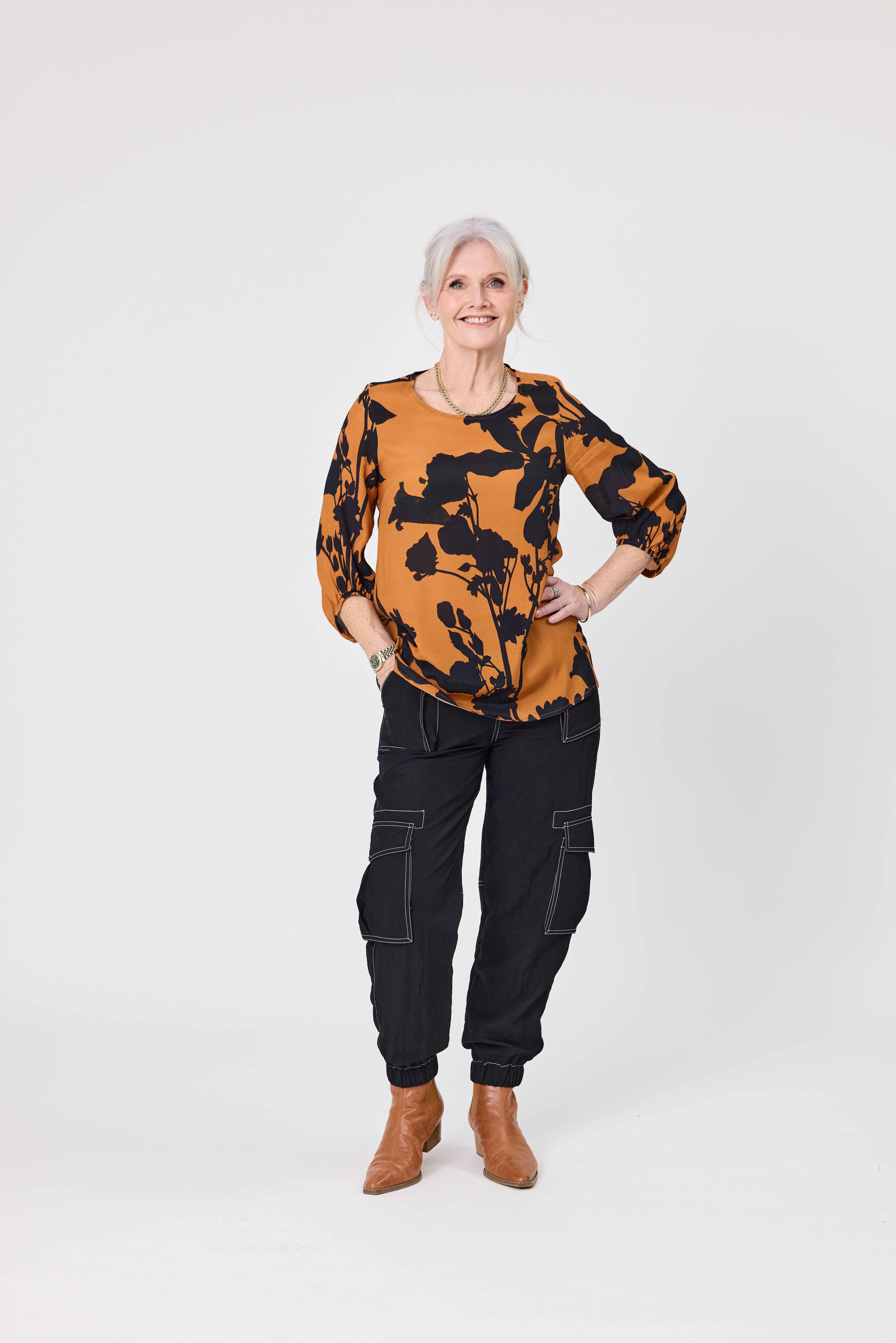 • It features a bold, 2-tone print of large black floral silhouettes on a rich Toffee background.