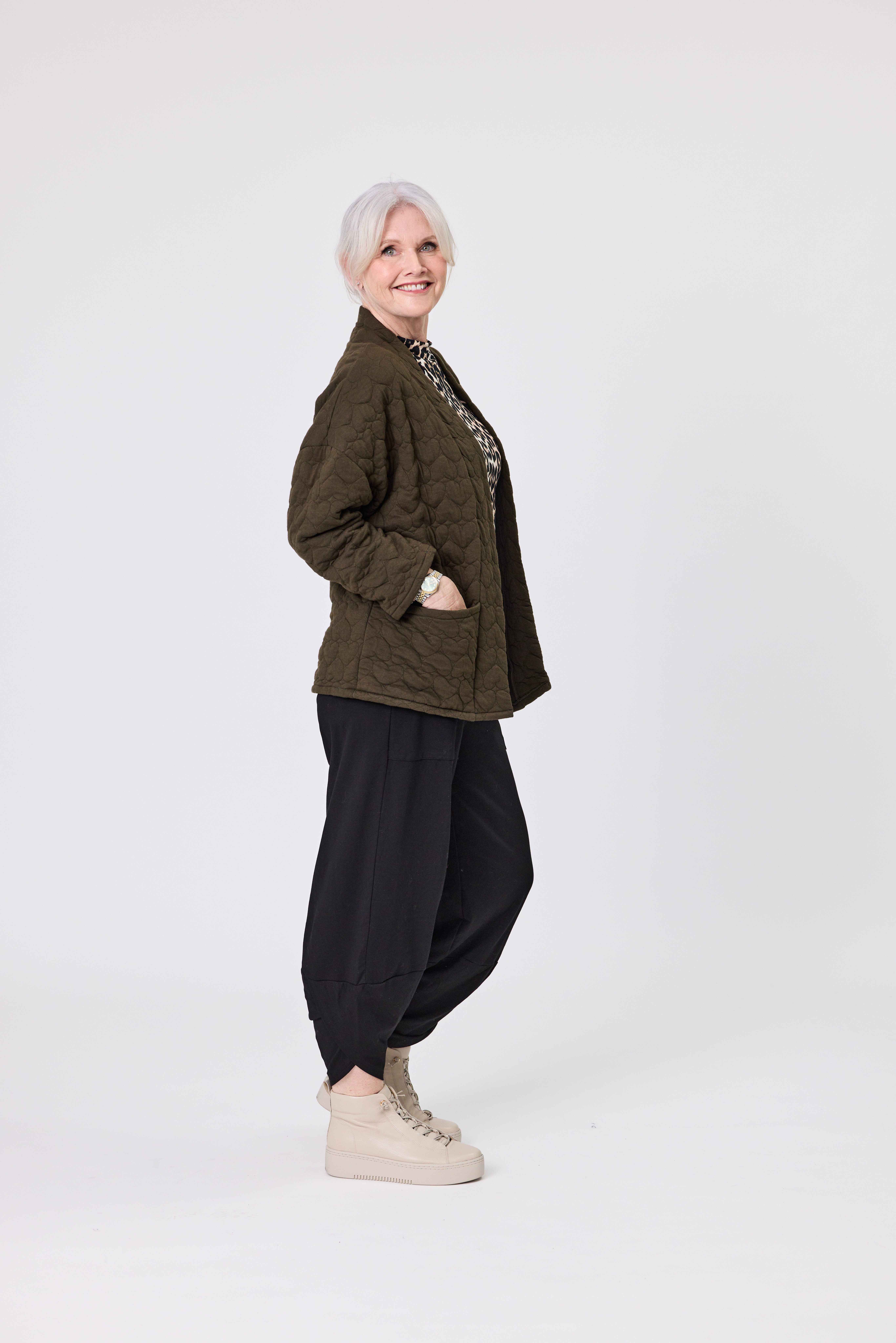 • Quilting heart pattern, and is available in Khaki, Cream, and Black.