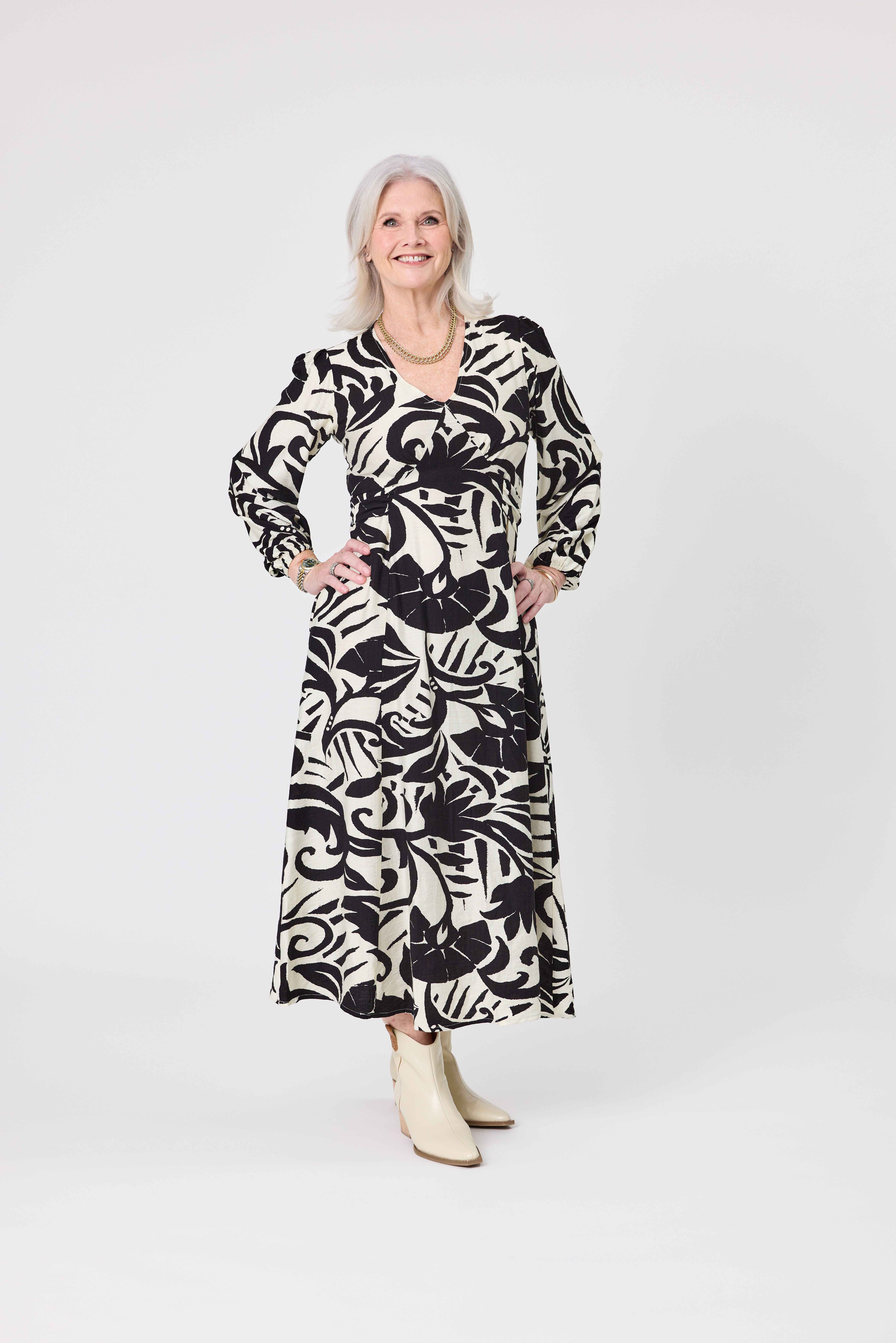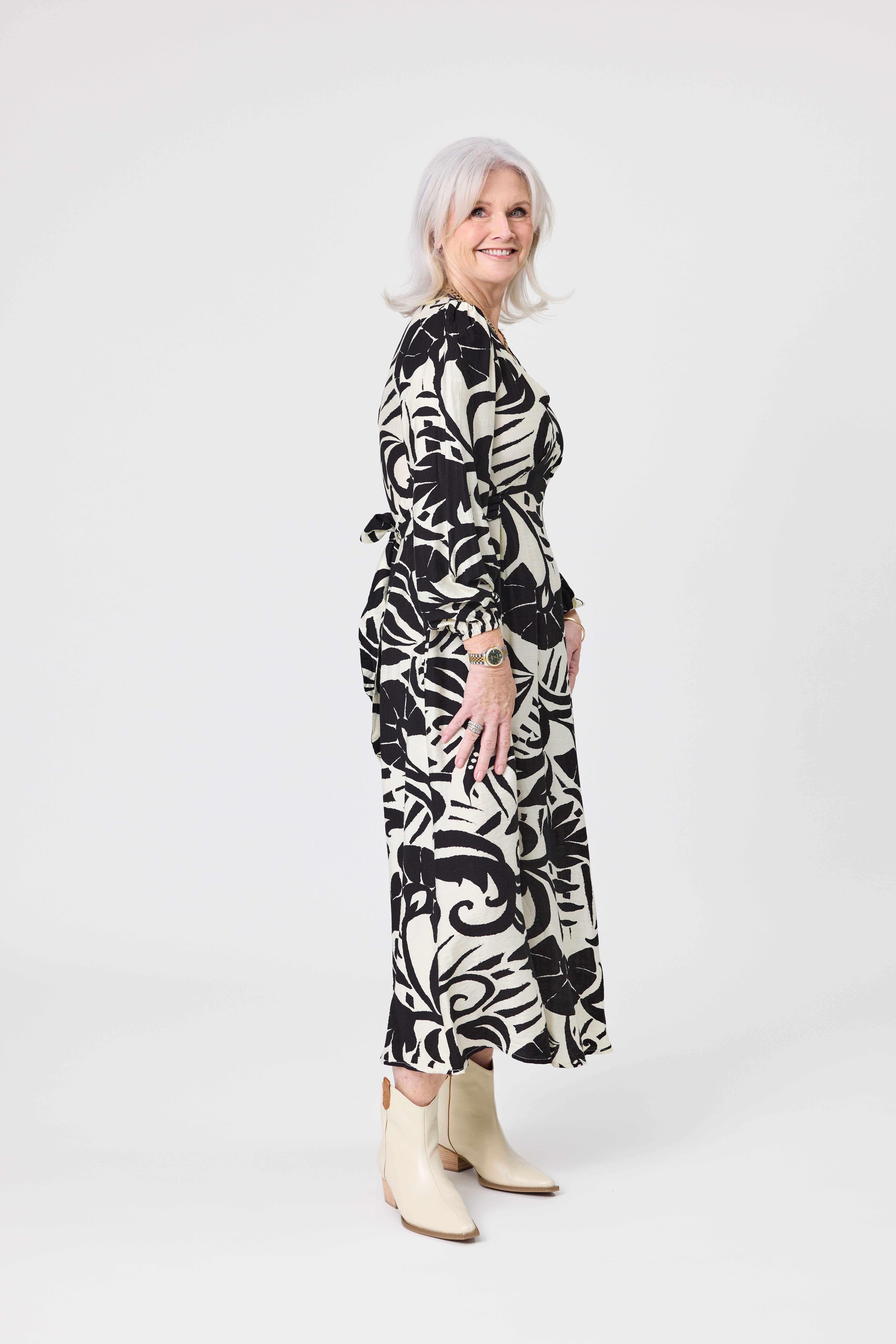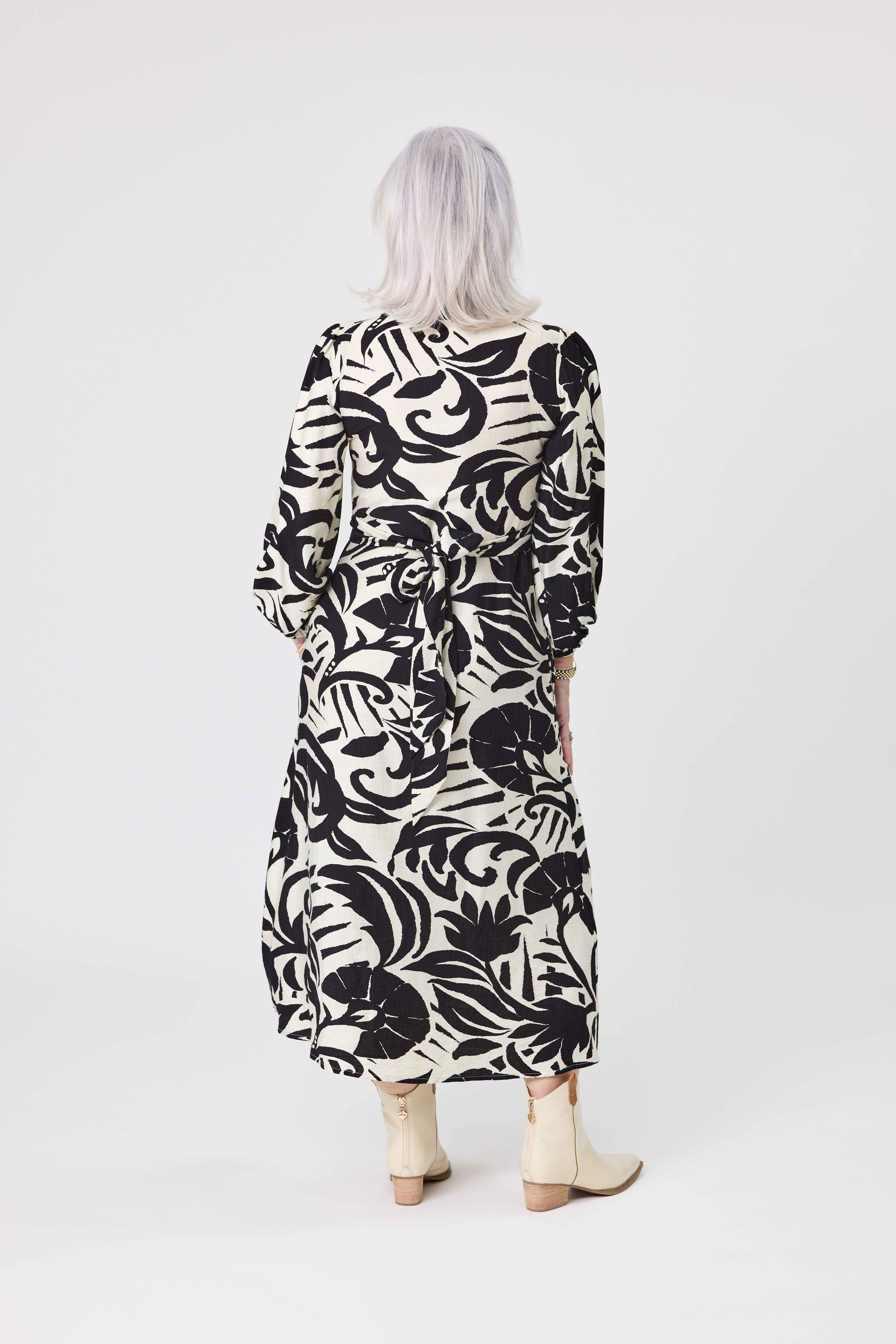 • Flattering V-neckline, and waist ties to play with.