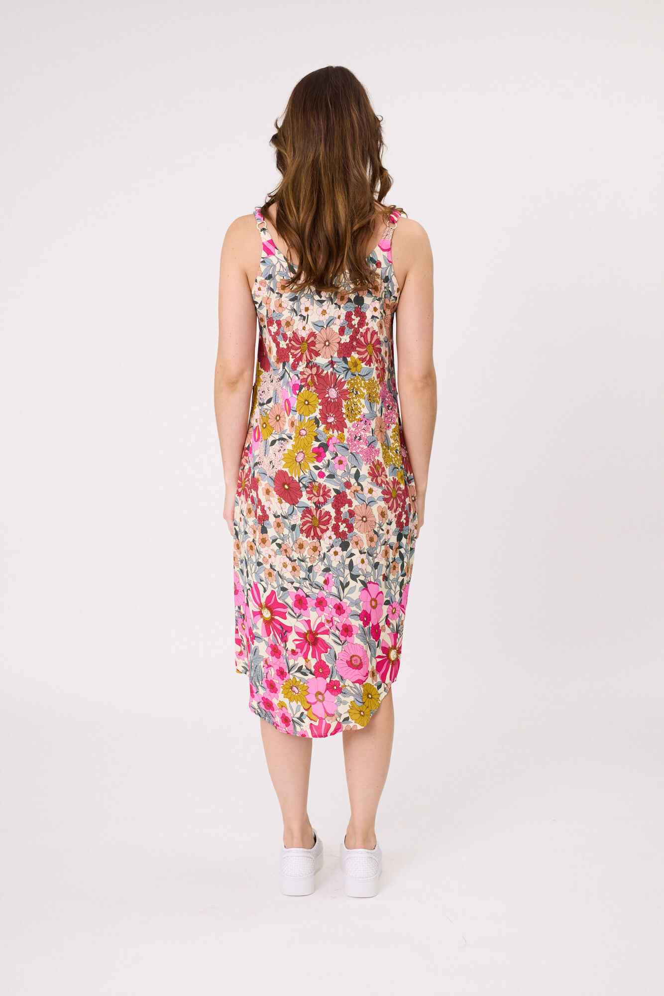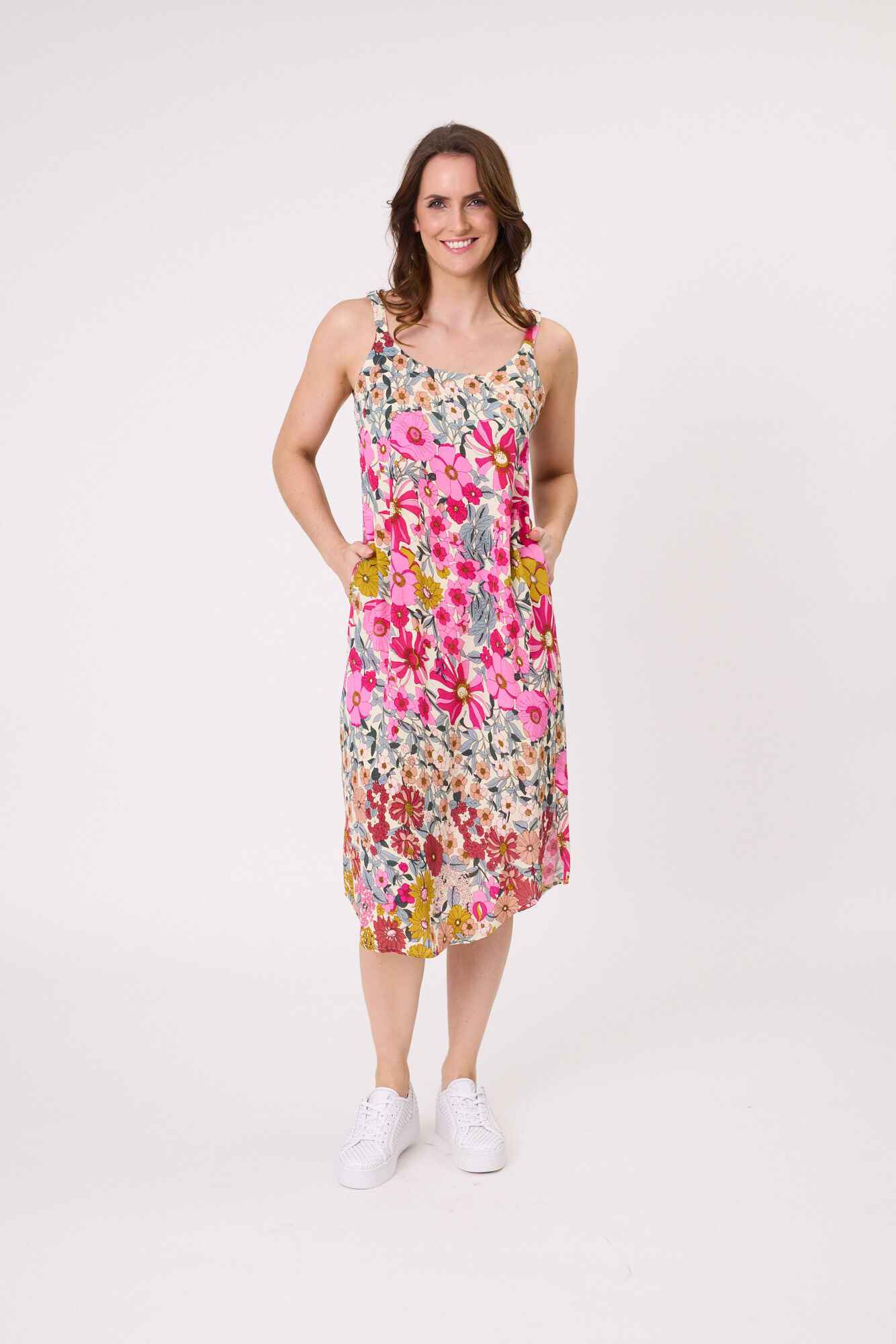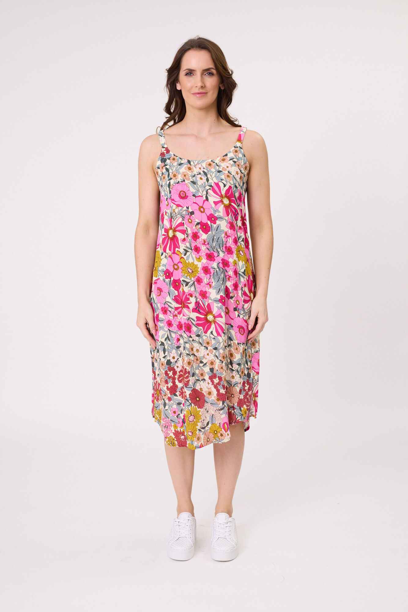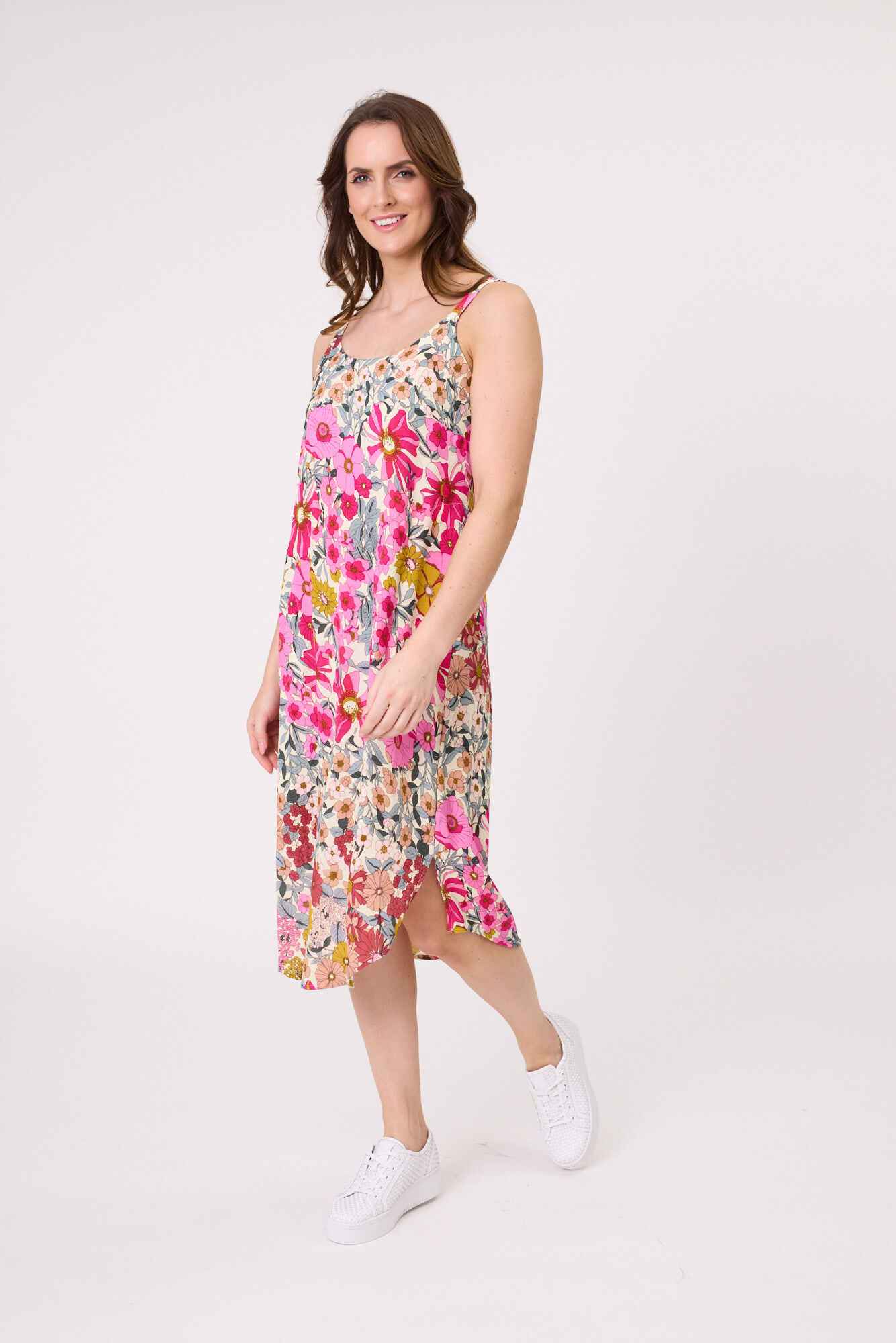 • Adjustable straps and a length that falls just below the knee with side slits.