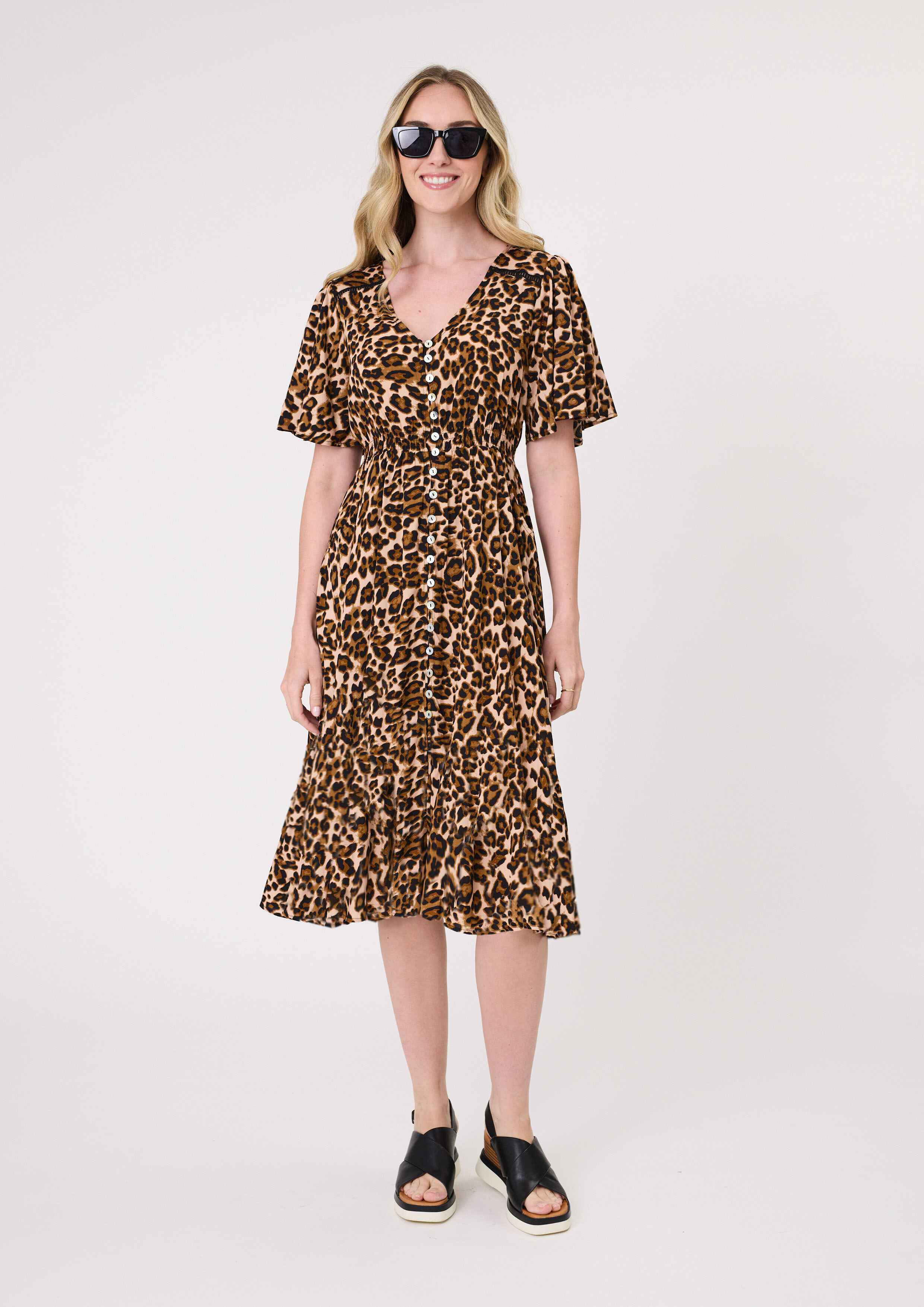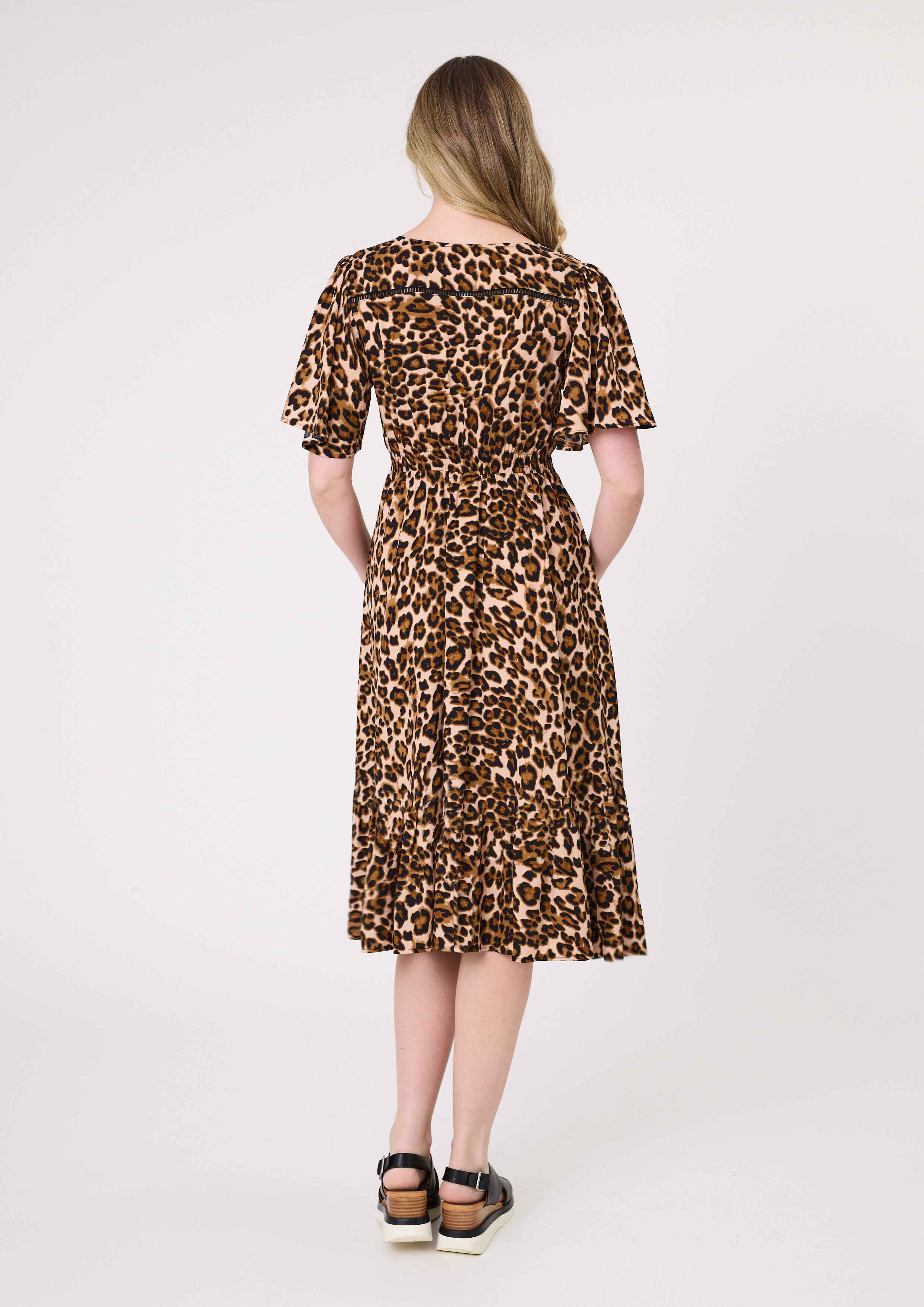 • All-over leopard printed dress, with a flattering V-neck and short flutter sleeves.