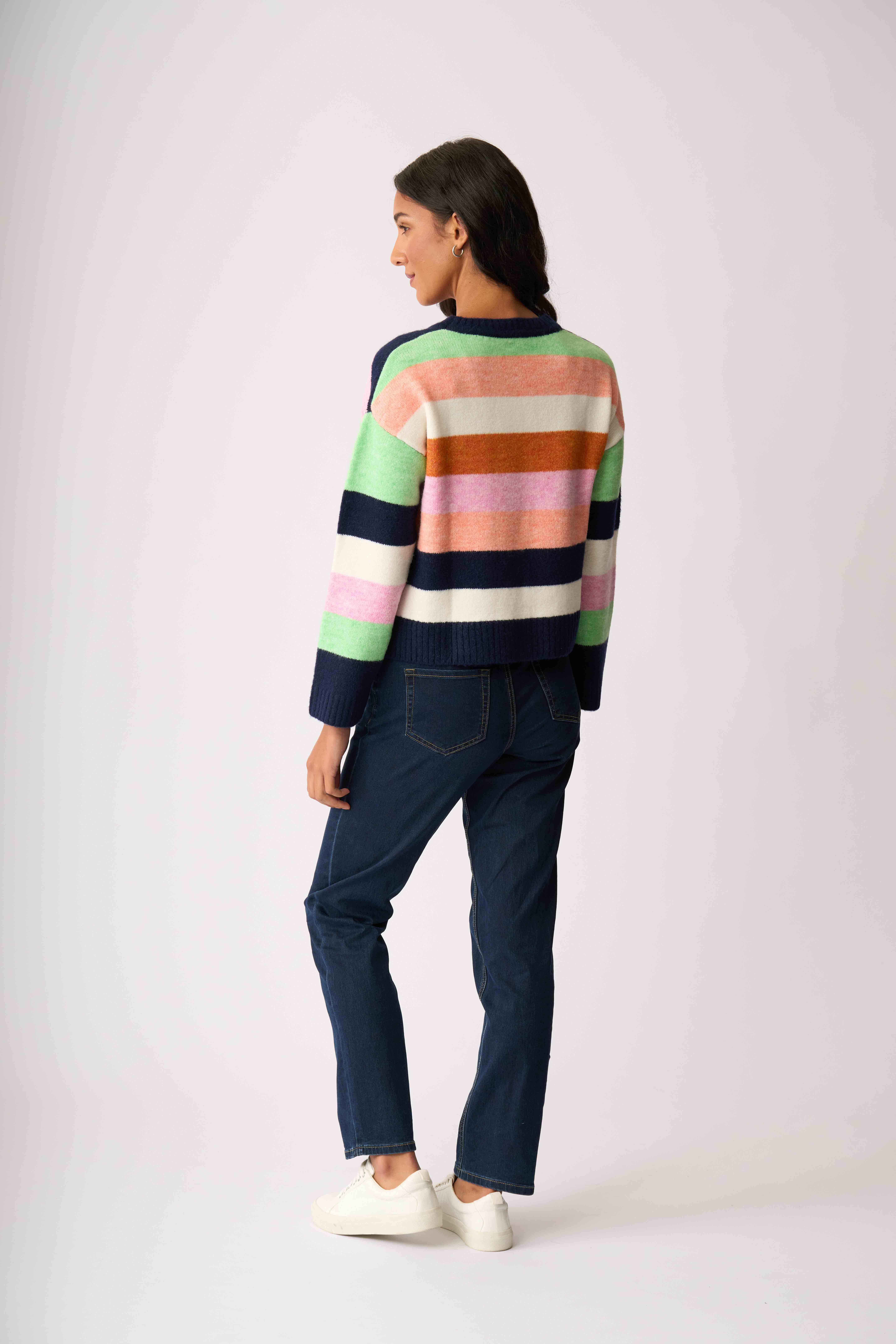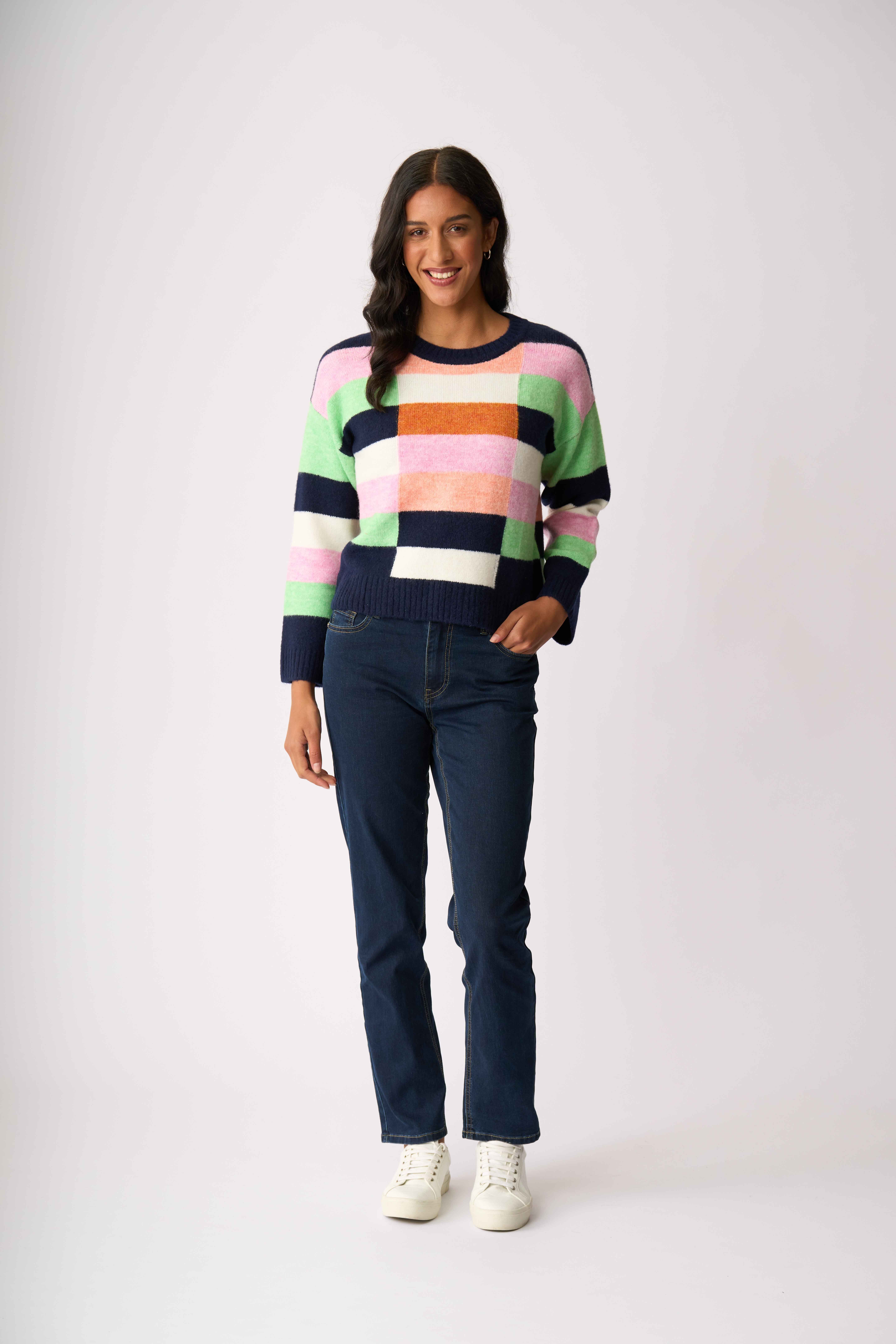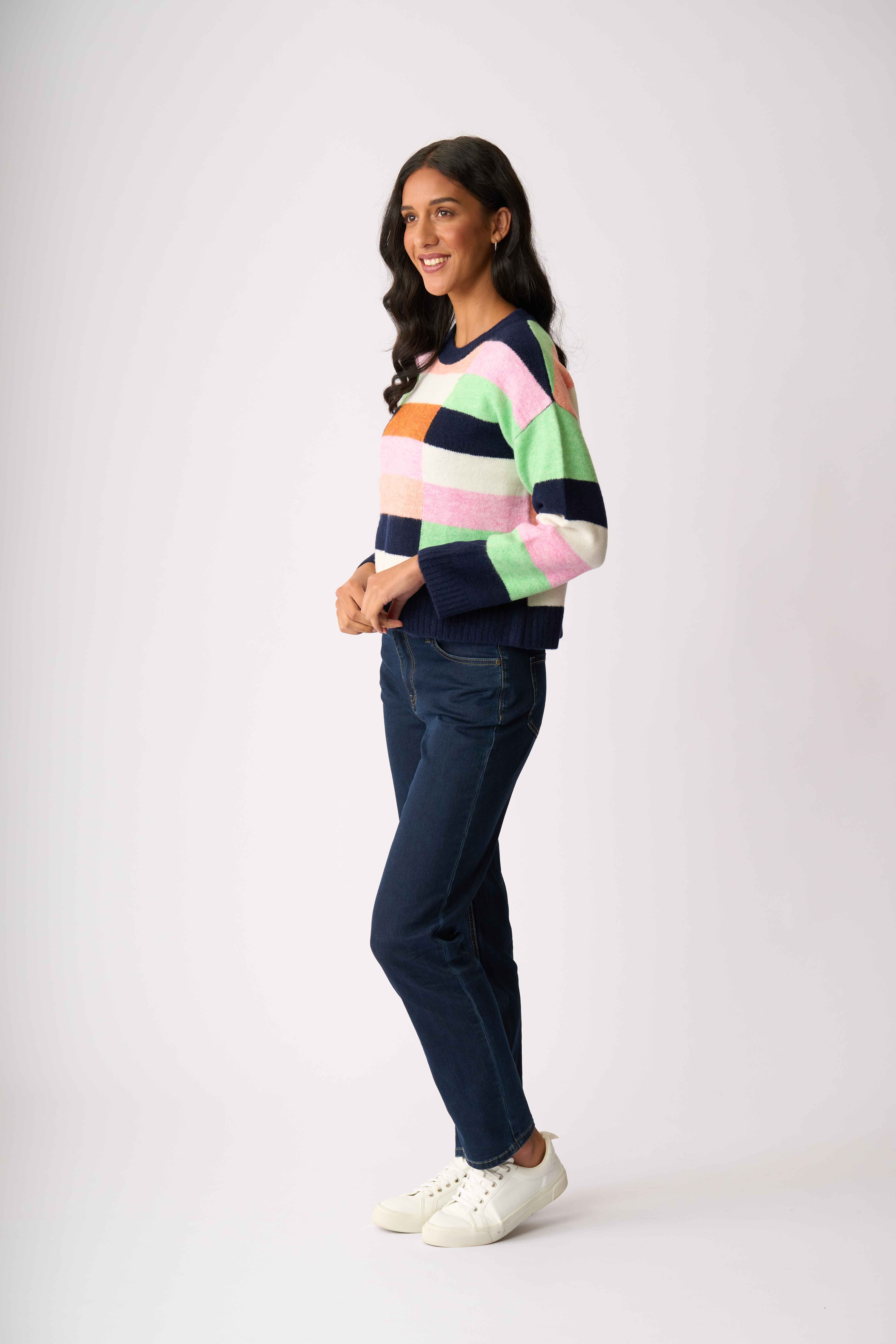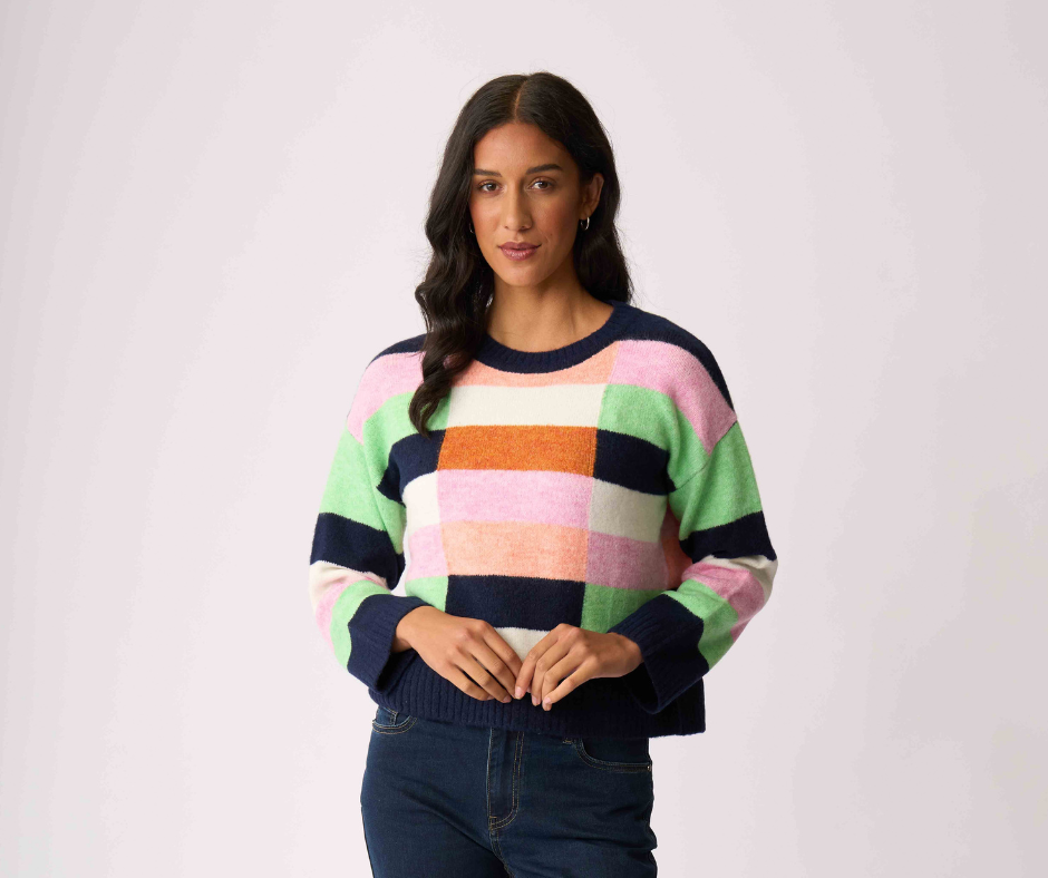 This fun sweater will be sure to keep you warm, while bringing a pop of colour to your outfit.Colour block designFull Length sleeves2x2 Rib detail on the neckline, sleeve and hemBody length from shoulder to the hem is approx. 53.5cm (size small)