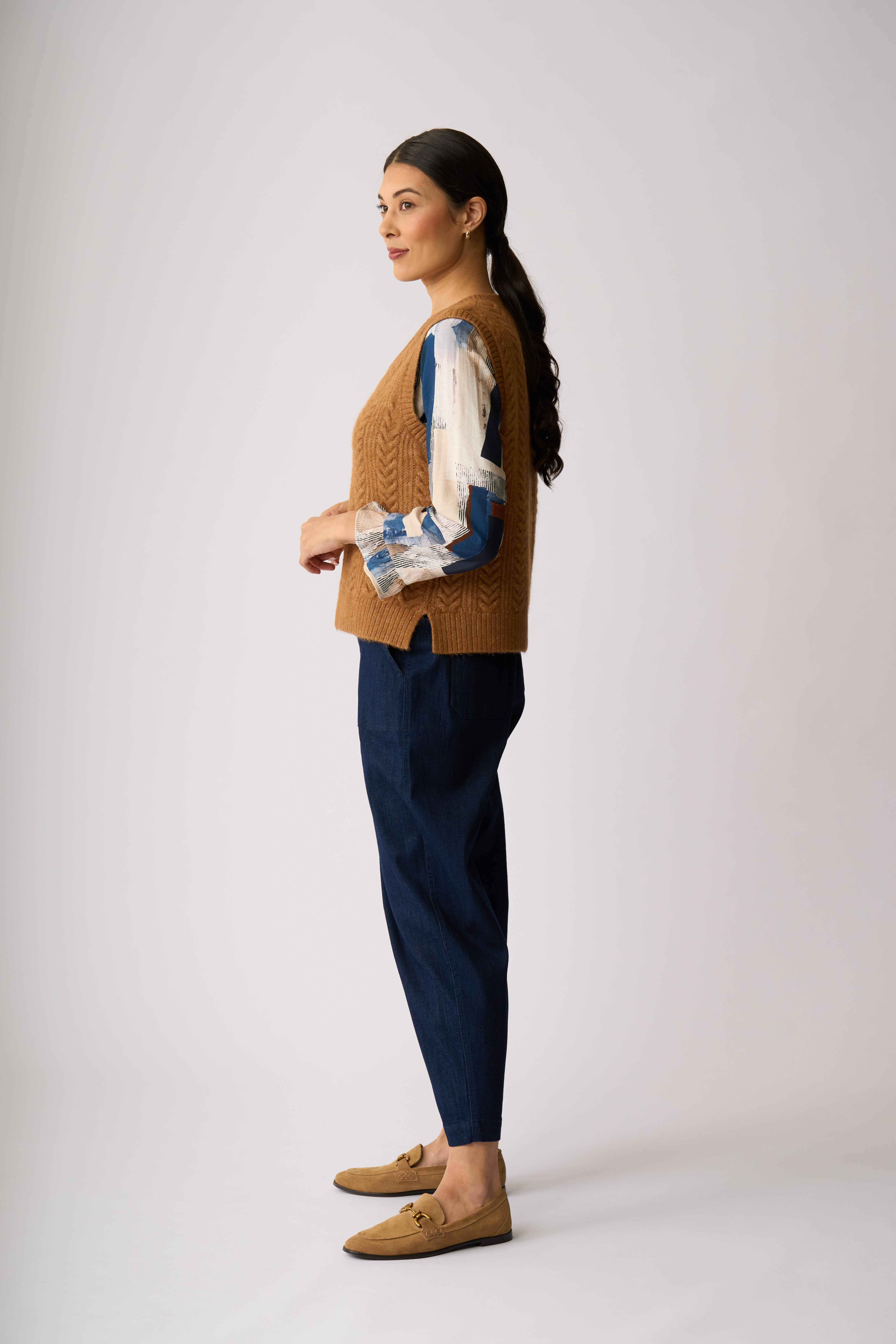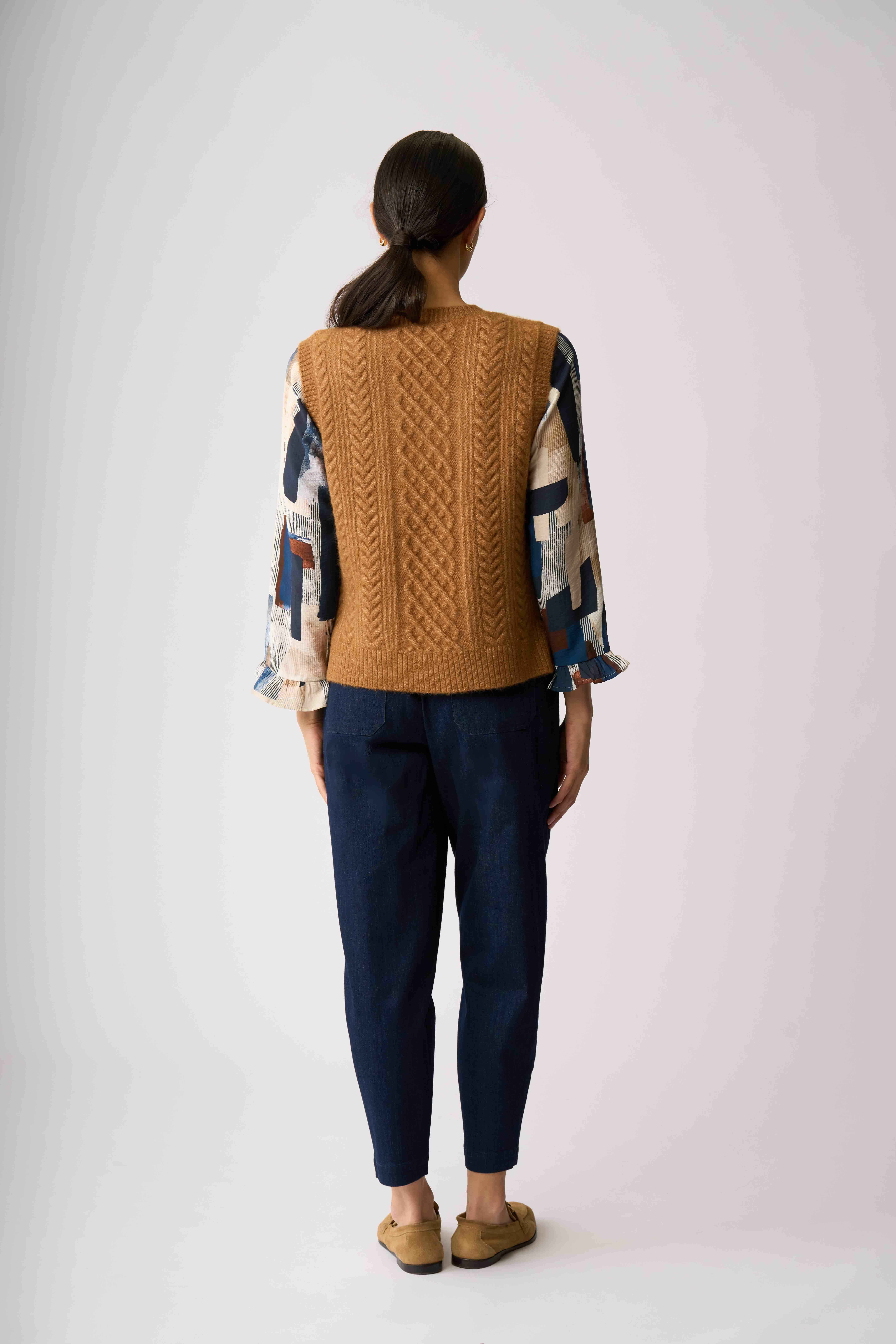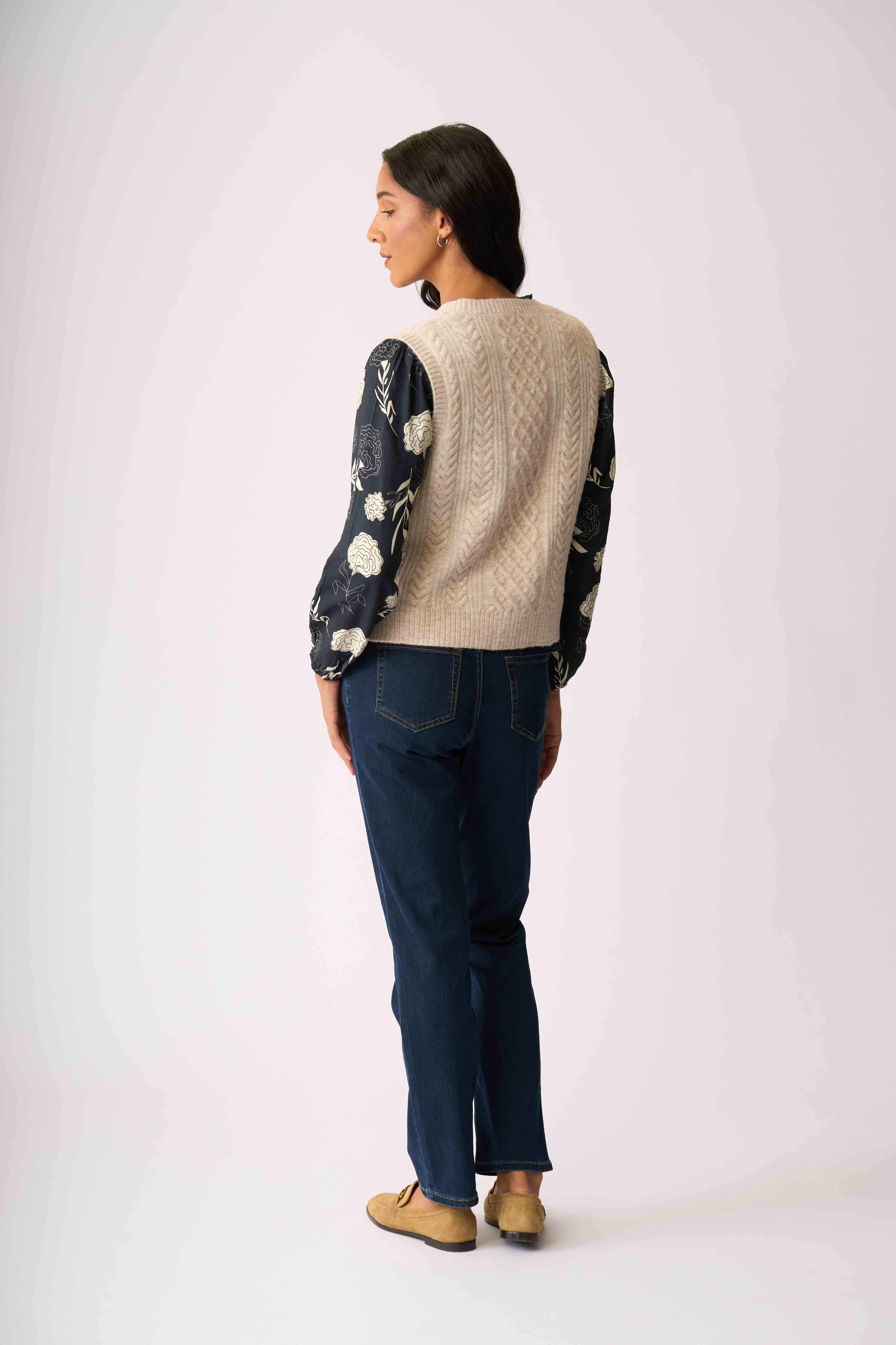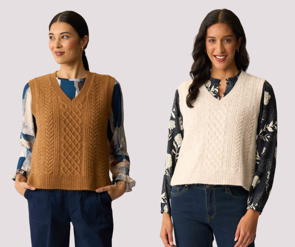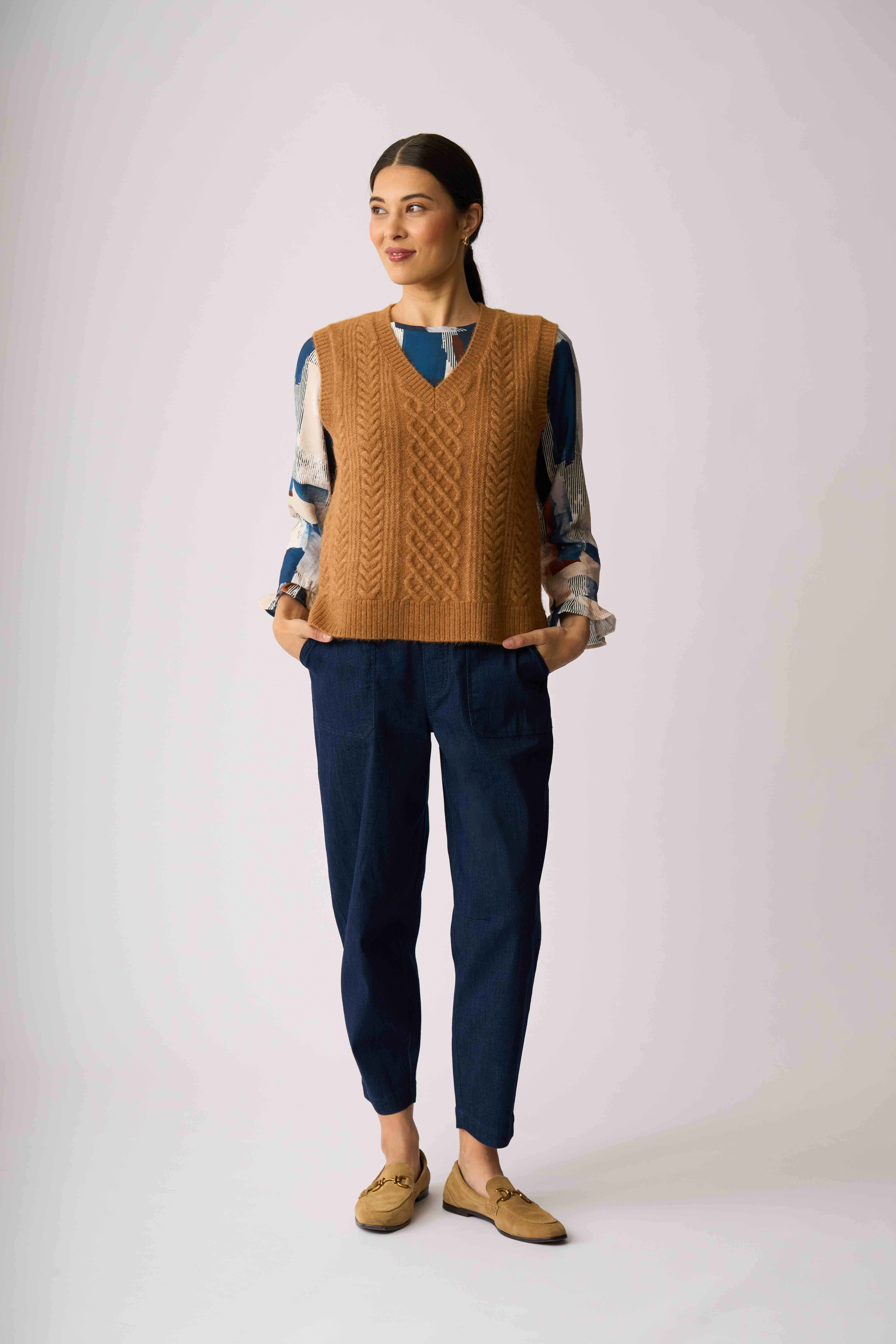 The perfect layering vest!V neckline, easy fit through the body Cable knit detailBody length from the shoulder to the front and back hem approx. 51cm (size small)