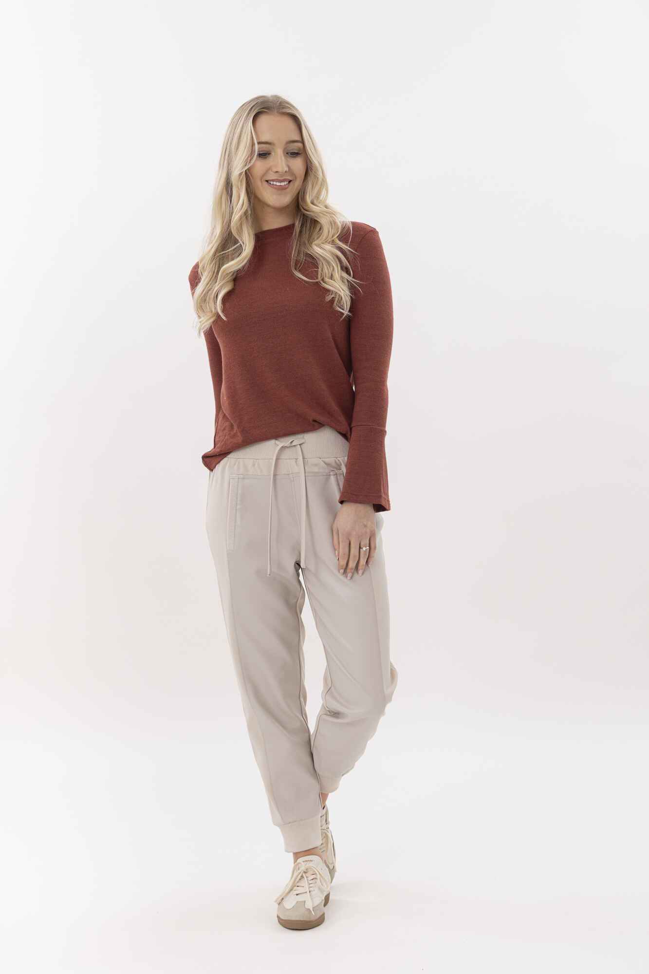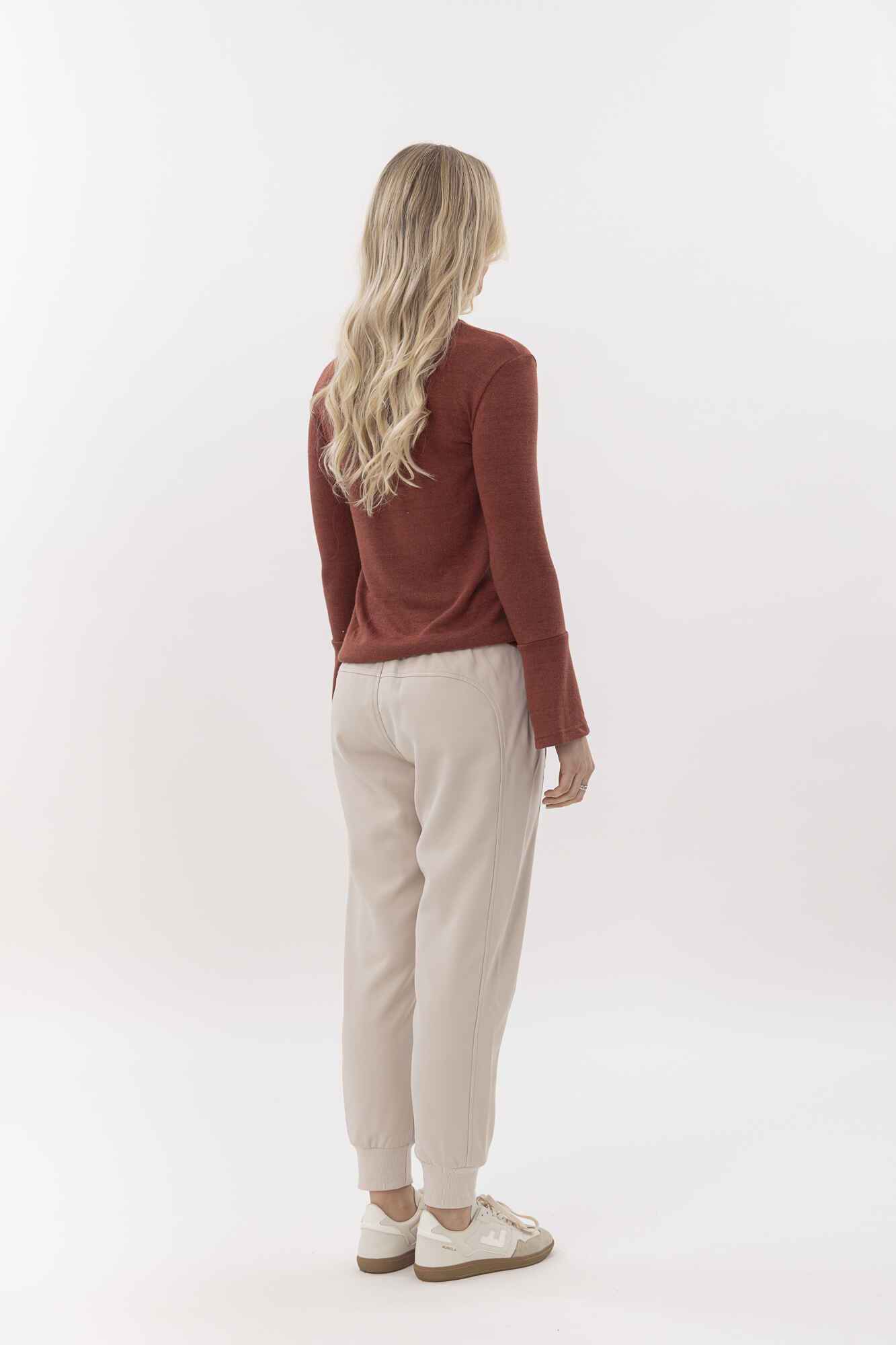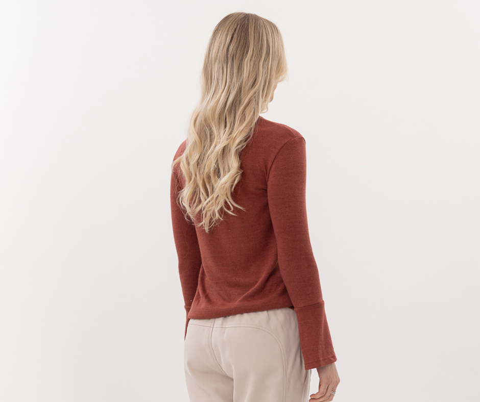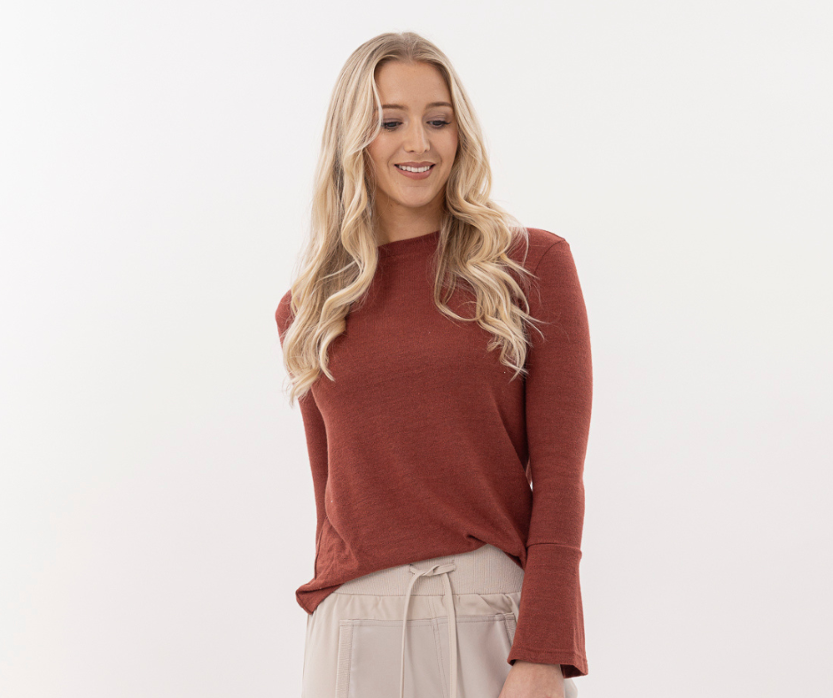 The Ava Top in Burnt Rust features elegant fluted sleeves, making it a versatile addition to your wardrobe. Ideal for layering or wearing on its own, this top combines style and comfort effortlessly. Its rich burnt rust hue adds warmth and depth, perfect for elevating any outfit with a refined touch.
