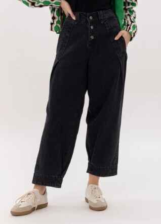 Make a statement in these effortlessly cool high-rise jeans, designed with a flattering wide-leg silhouette and modern cropped length. Crafted in a deep black wash, they feature a bold button-front closure that adds a vintage-inspired touch while enhancing the structured fit through the waist.