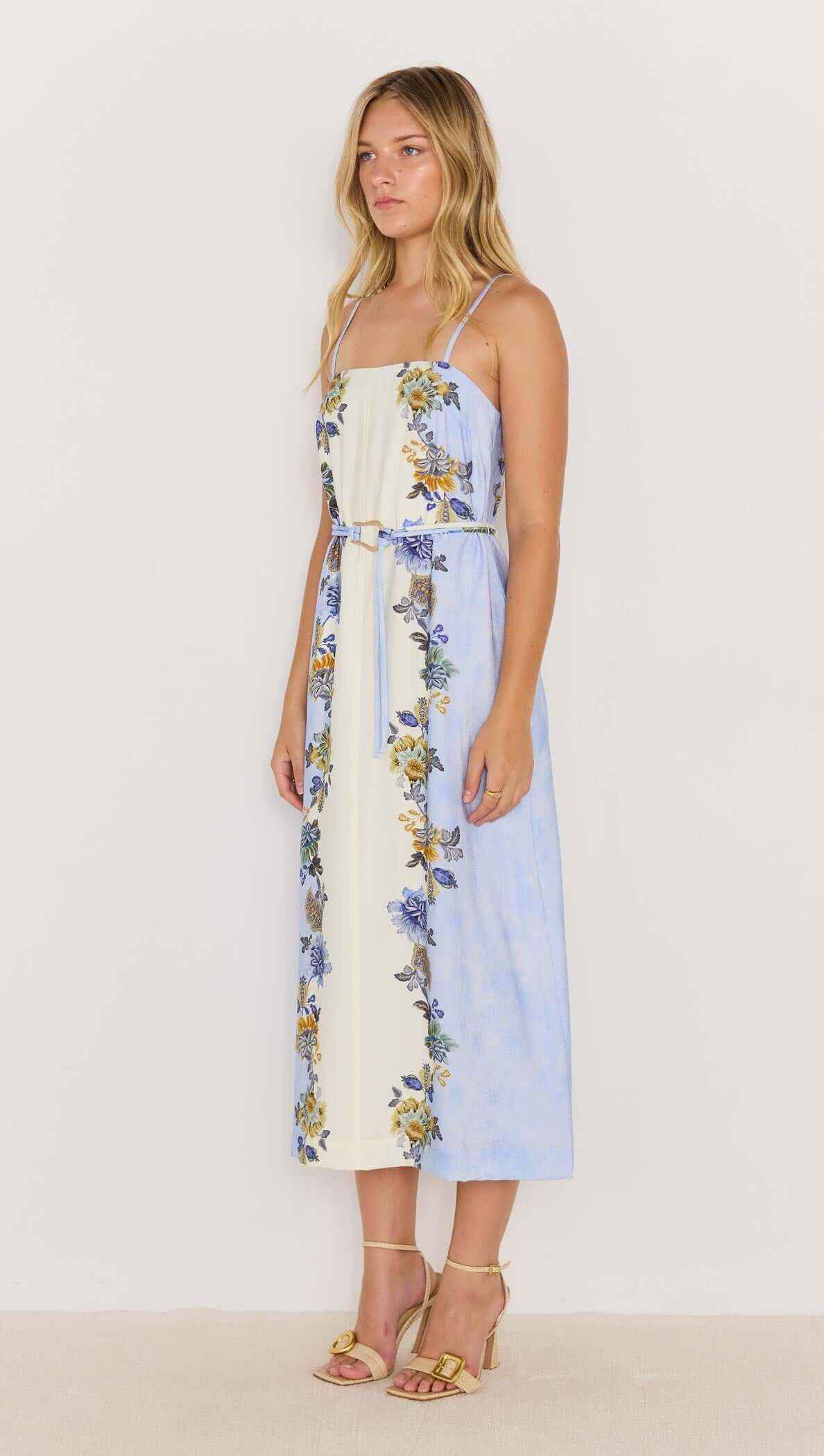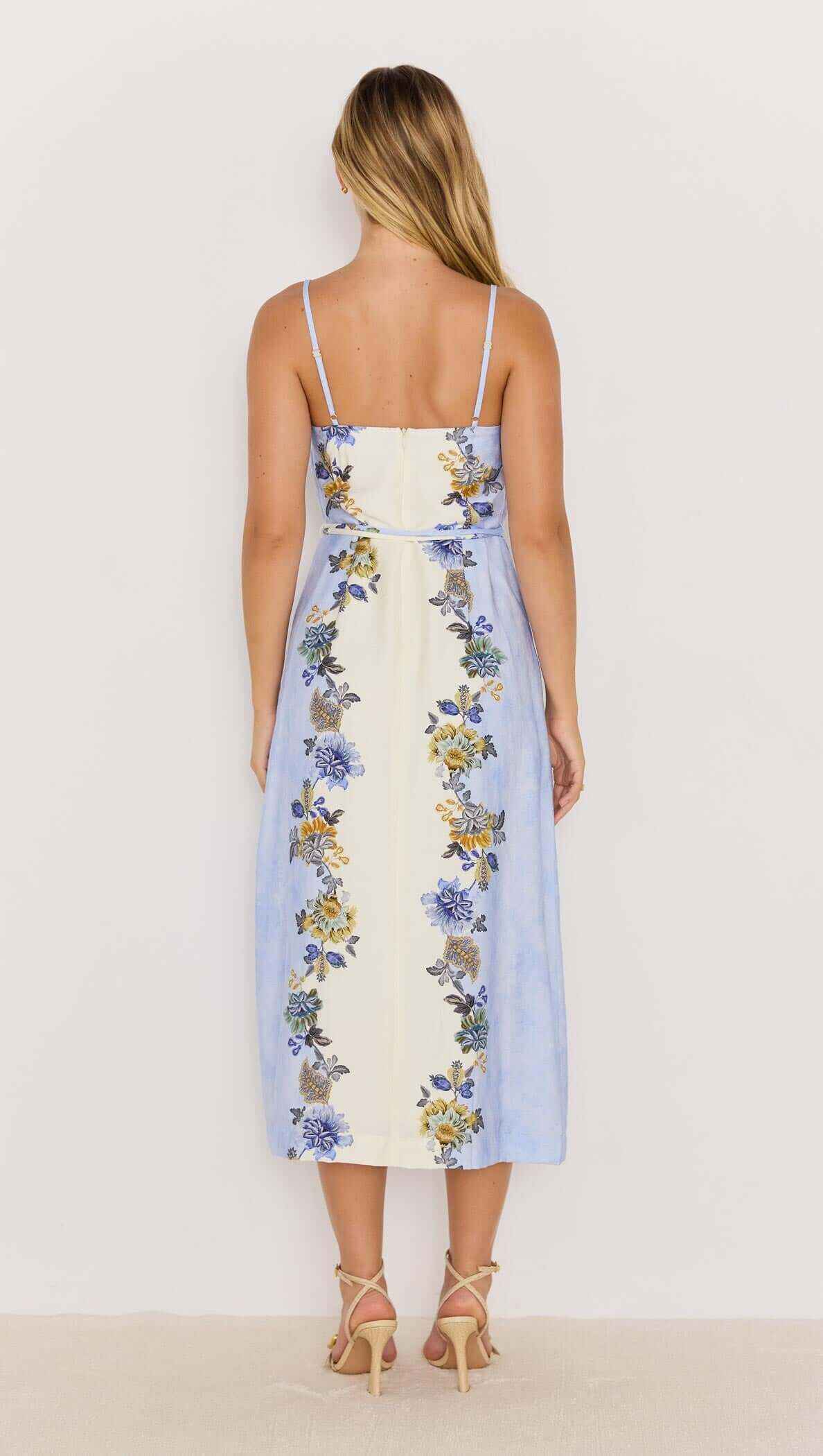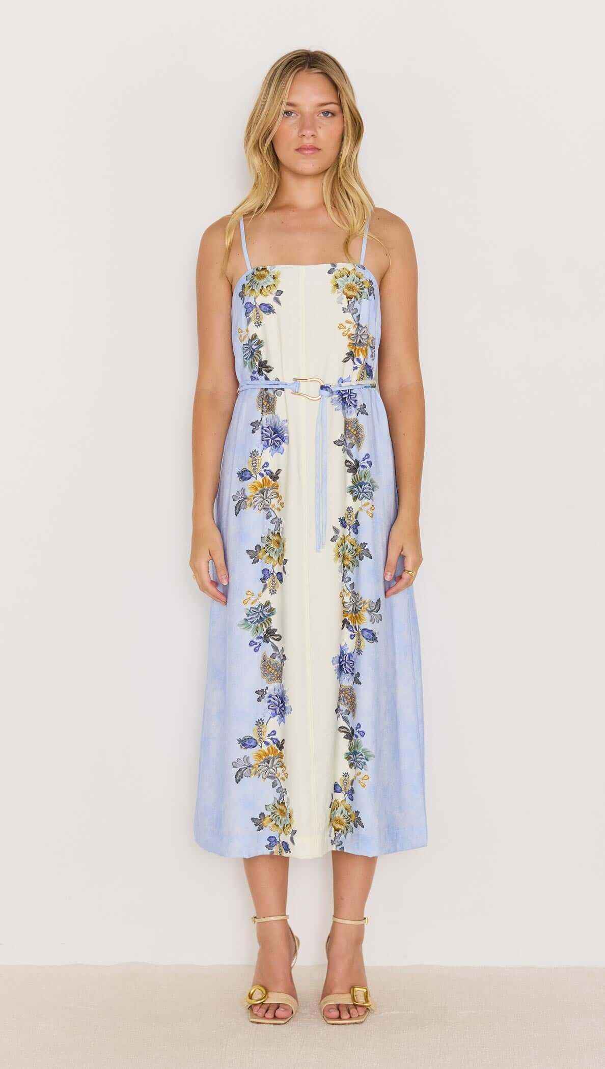 The Lucia Blue & Cream Floral Midi Dress is a breezy, romantic style made for sunny days and balmy nights. Featuring a watercolour blue and cream base with vibrant floral prints, it’s designed with slim spaghetti straps, a square neckline, and a detachable belt to define the waist. The flowing midi skirt adds an effortlessly elegant touch, perfect for garden parties or seaside escapes.