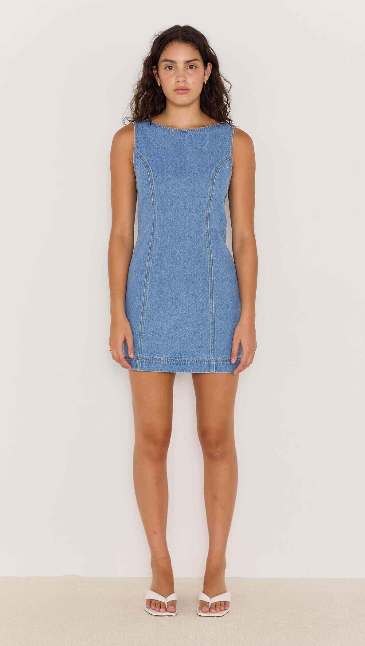 The Miles Blue Denim Scoop Back Mini Dress is a fresh take on a classic, blending clean lines with a flattering fit. Crafted from 100% cotton denim, it features a sleeveless design, crew neckline, and subtle panel seam detailing to contour the shape. The low scoop back with an exposed zip adds a touch of edge, making it perfect for both casual days and dressed-up nights.