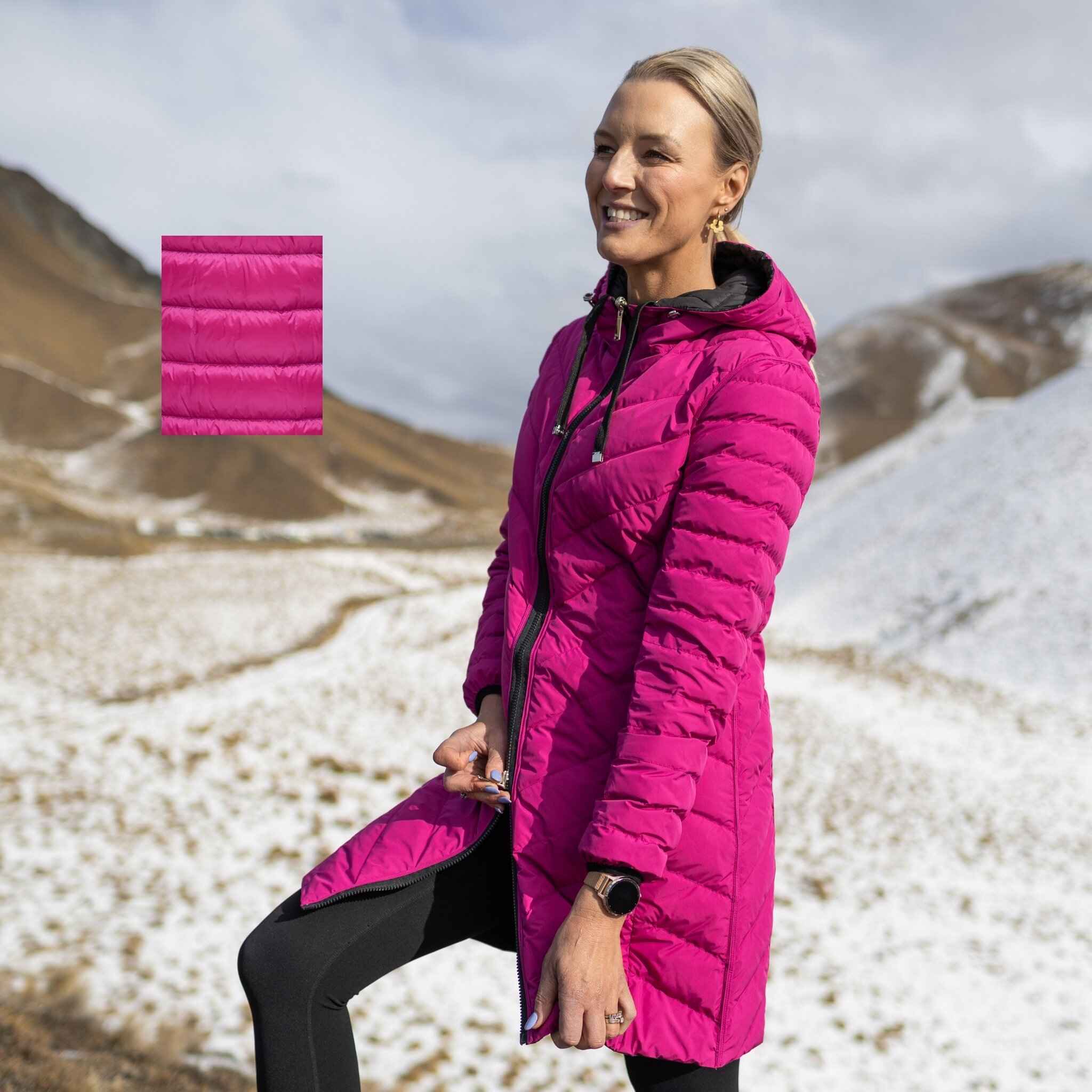 I am the fully reversible lightweight packable down coat bound to be your new favorite winter investment. Like all MOKE packable down styles, I have a fantastic warmth to weight ratio, meaning you get all the warmth without the bulk. My beautiful chevron quilt design flatters all shapes and sizes and my shiny hardware and luxurious fabric dress up any outfit. Being fully reversible you can match me with just about any outfit!