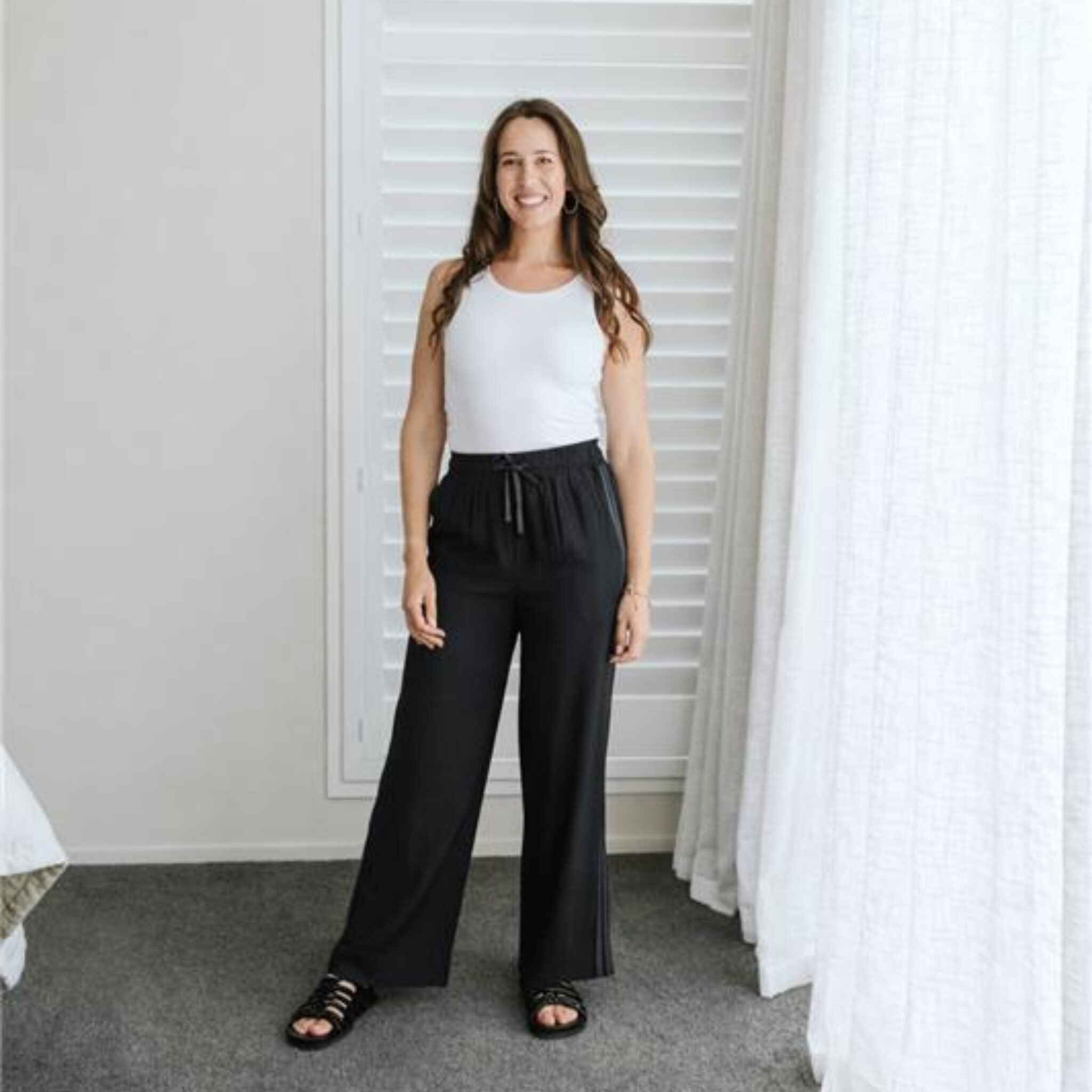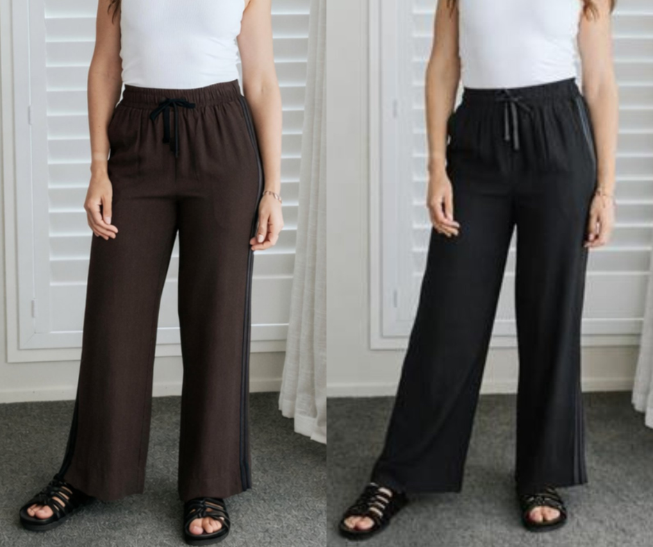 Chic cream contrast stripes running down each leg add a contemporary, sport-luxe edge, while subtle side splits at the hem introduce movement and an effortlessly modern finish. Thoughtfully designed to flatter, these pants balance comfort with style in a way that feels both current and timeless.