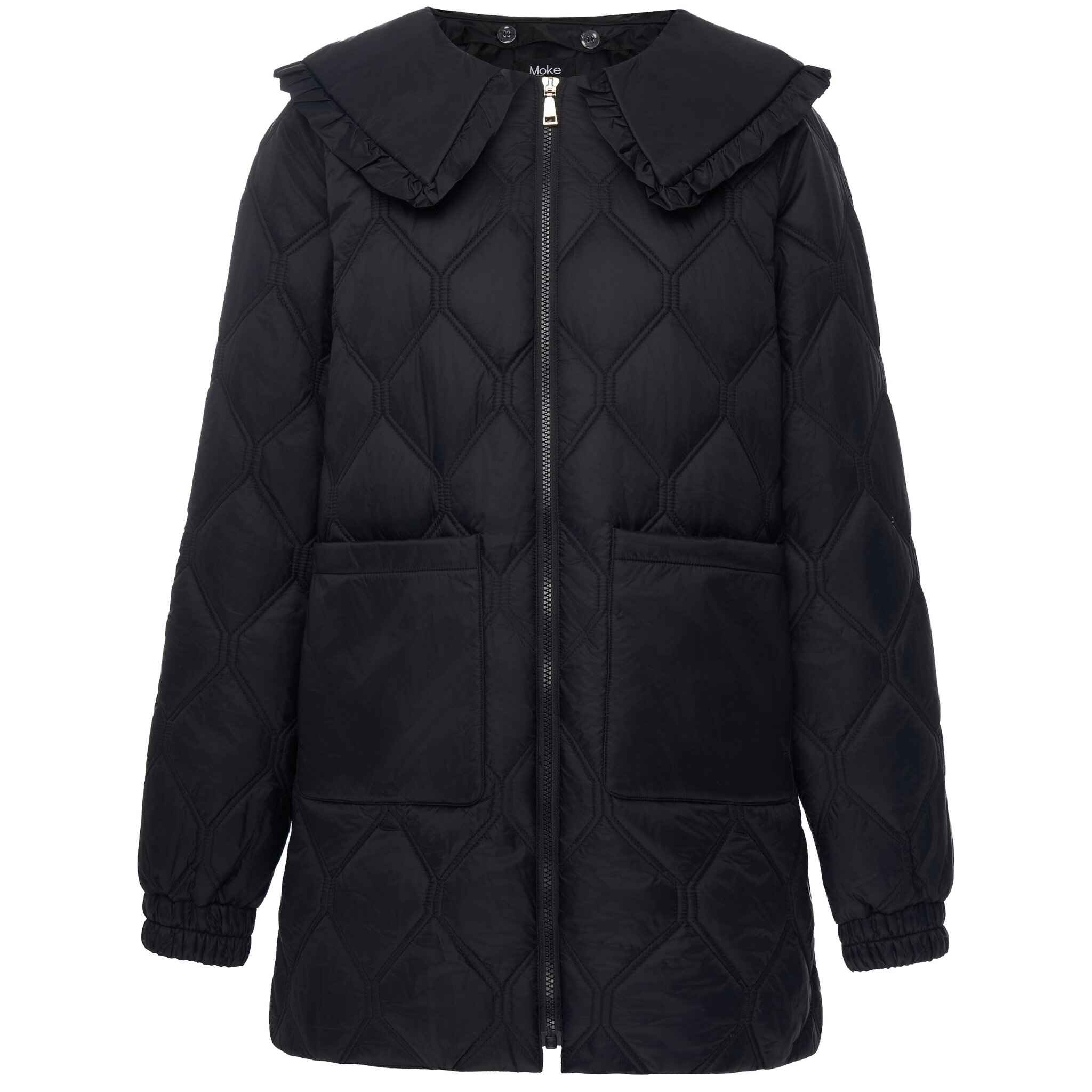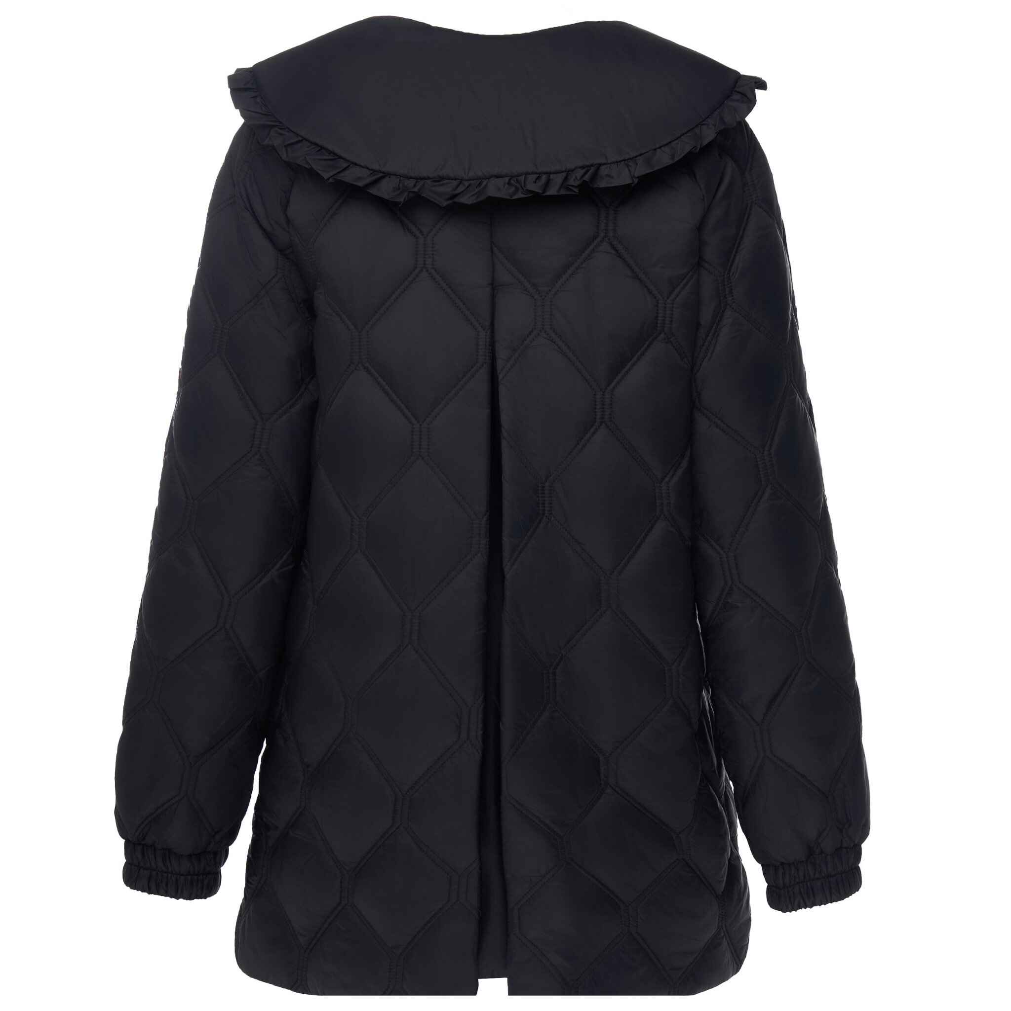Lightweight women’s quilted jacketDouble-needle diamond quilted design for added texture and structureDurable nylon outer for everyday wearVegan padded fill for warmth without bulkOversized fit for a modern, fashion-forward silhouetteDistinctive scalloped collar for statement stylingDetachable collar for versatile wearShaped back dart for enhanced fit and movement