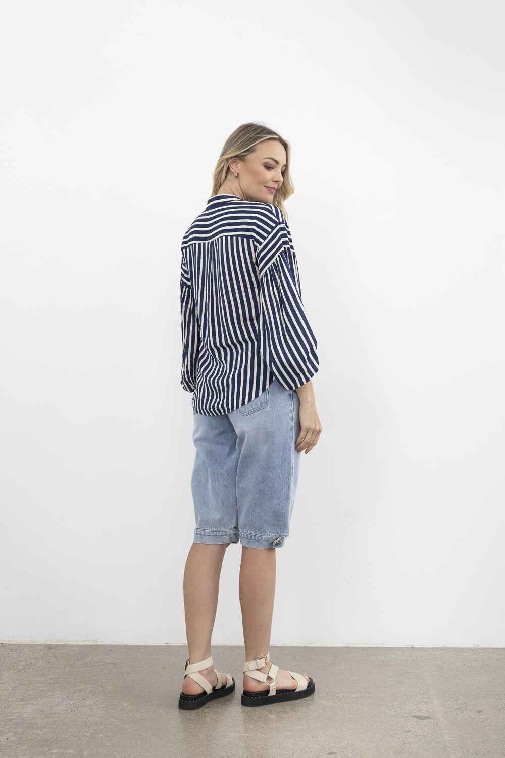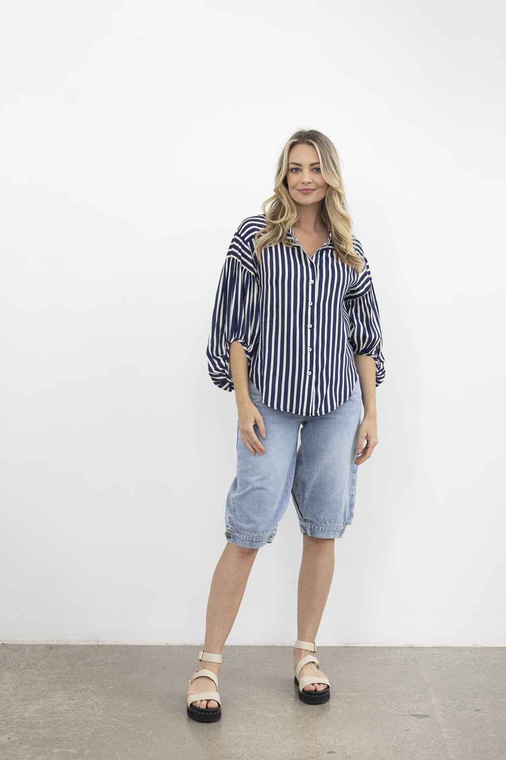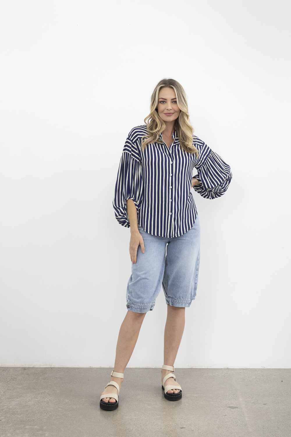 Add a touch of effortless sophistication to your wardrobe with the Moss Bronte Shirt. Designed with bold navy and white vertical stripes, this relaxed-fit shirt offers a timeless yet contemporary look. The soft, lightweight fabric drapes beautifully, while the billowed 3/4 sleeves with gathered cuffs add volume and style. Featuring a classic button-down front and a curved hem, it’s perfect for both casual and polished outfits. Pair it with denim for everyday ease or tailored pants for a chic, modern finish.