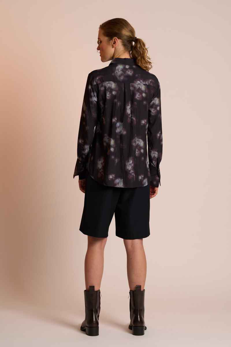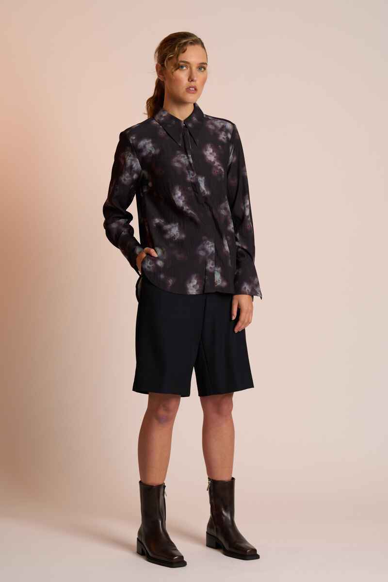 The Luna Shirt by Neris is an elegant, refined style featuring a sharp pointed collar and wide cuffs that fasten with a single button. The front buttons are concealed beneath a clean placket for a sleek, minimalist finish. Crafted from an understated smoky-print fabric with a beautiful drape, this slim-fit shirt balances structure with softness. The curved hem makes it effortless to wear tucked or untucked, depending on your style preference.