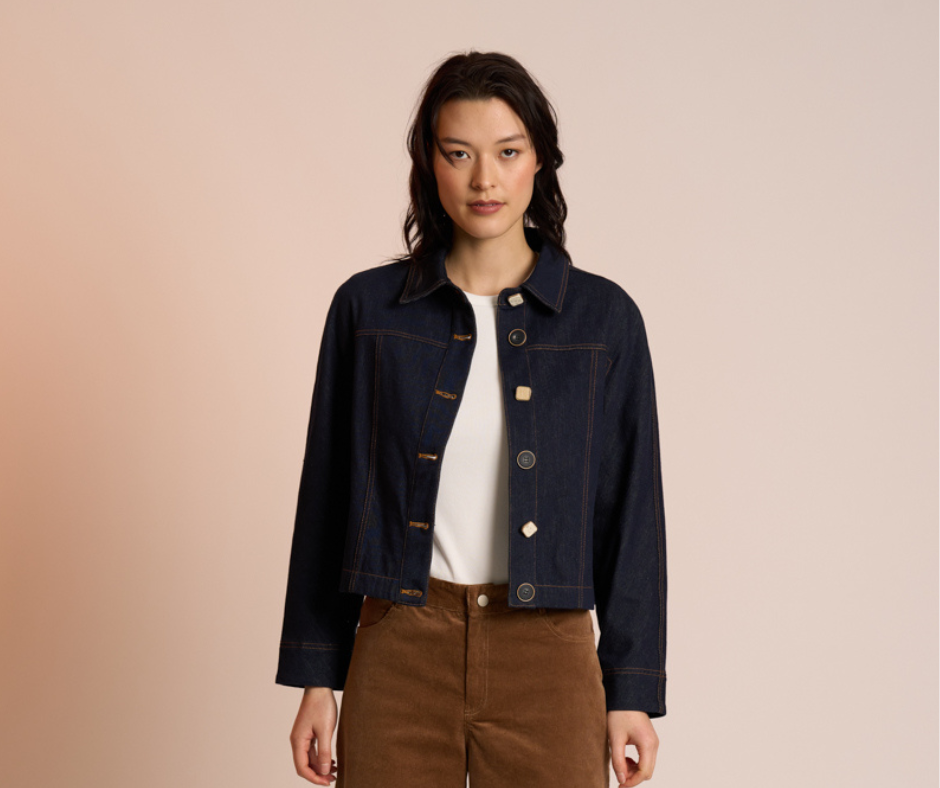 The Ora Jacket by Neris is a timeless wardrobe staple, elevated with playful mismatched buttons along the front. Crafted from deep indigo denim in 100% cotton, it features contrast tan topstitching and functional side pockets. A classic piece with a modern, character-filled twist.