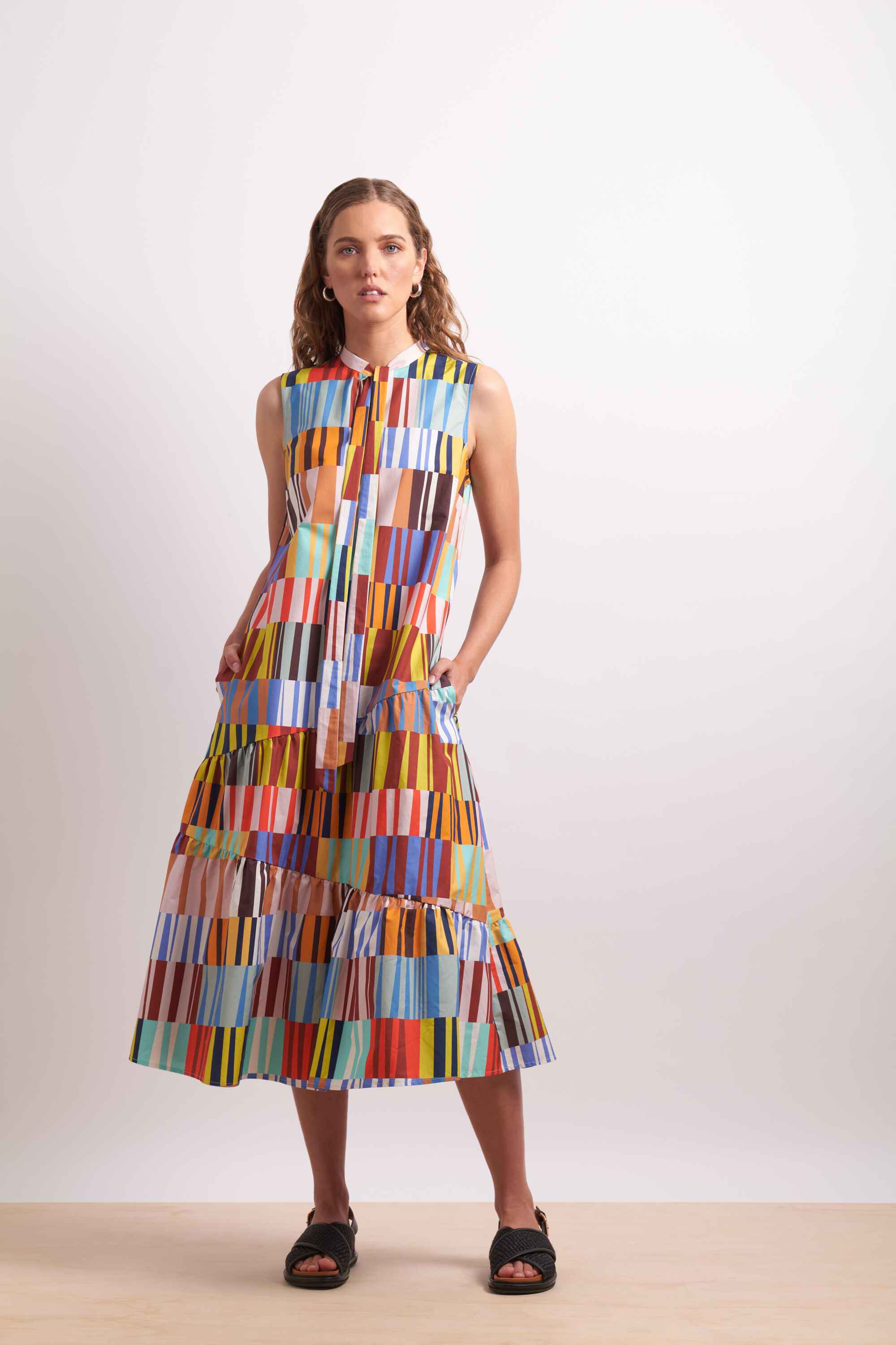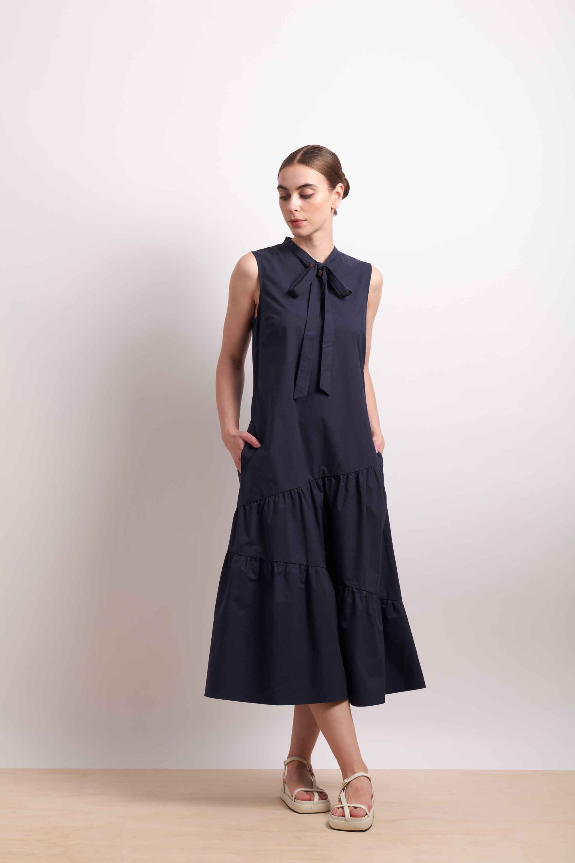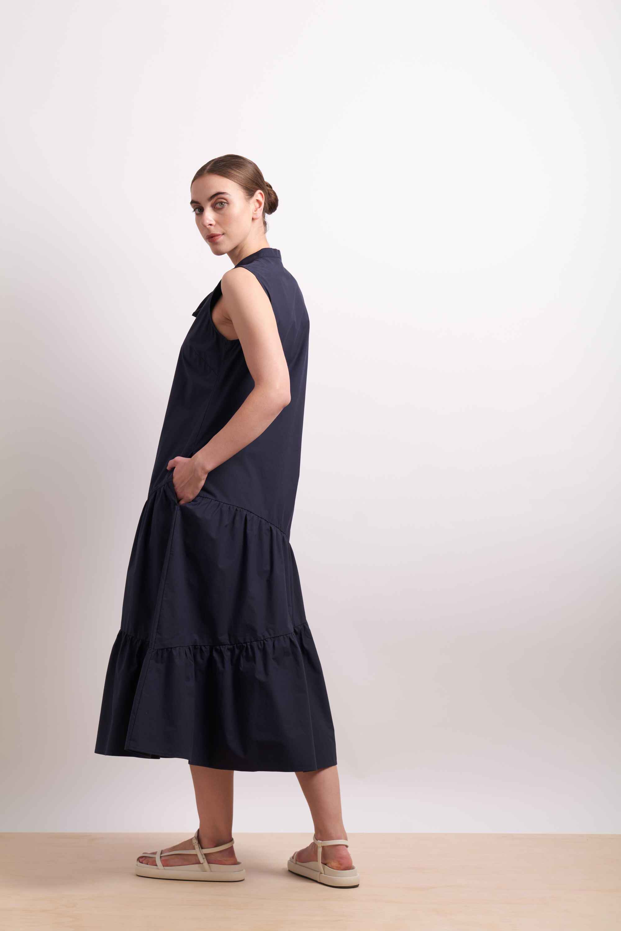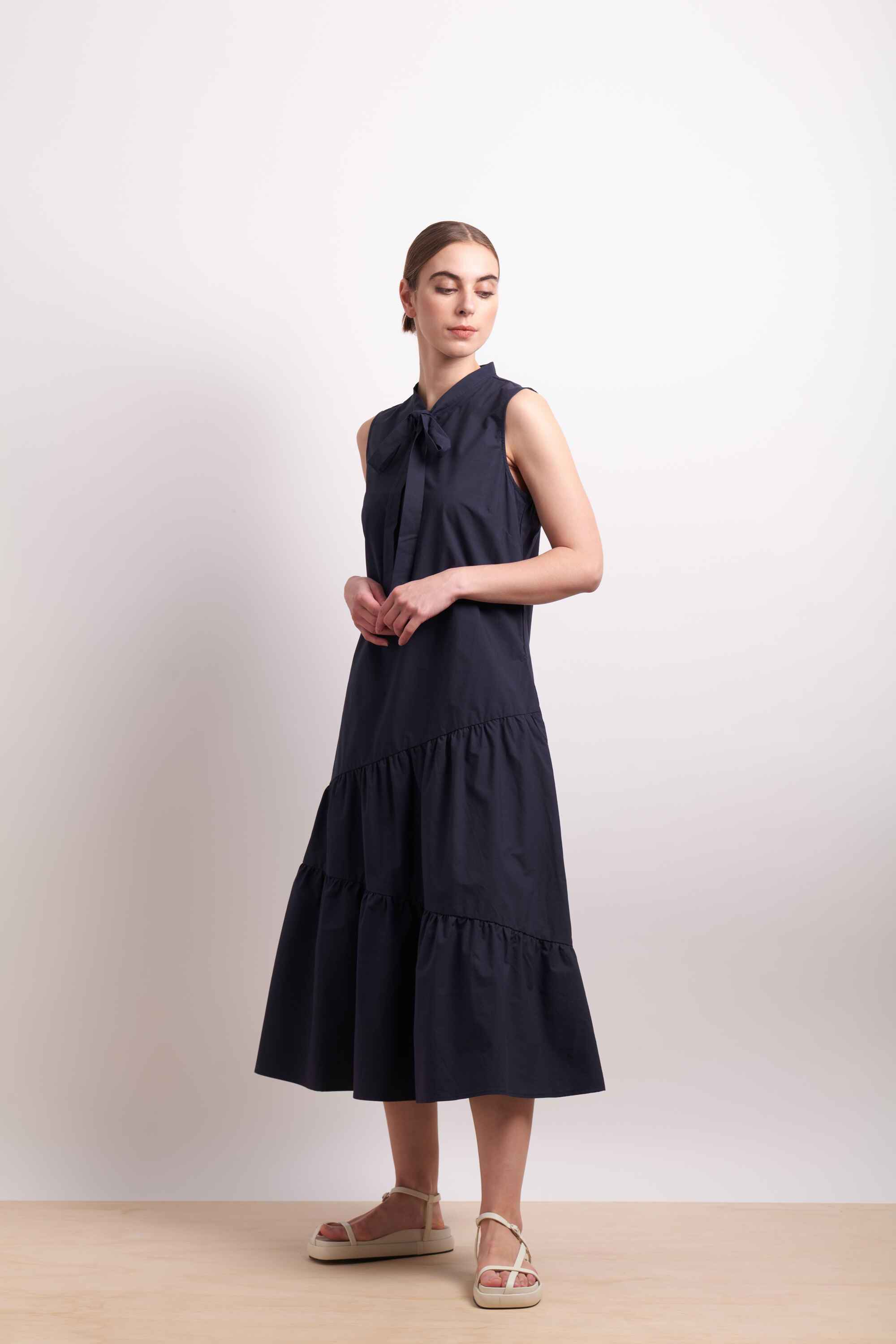 A modern yet romantic style, the Paper Trail Dress is crafted from crisp 100% cotton poplin. A sleeveless midi with a fitted bodice, it features a front tie on the neck and cascading diagonal tiers through the skirt. A feminine A-line shape with pockets, it is designed   for movement and charm. Designed in Christchurch, New Zealand.