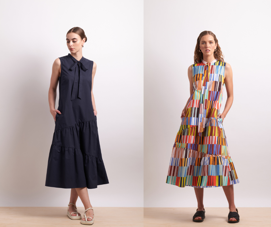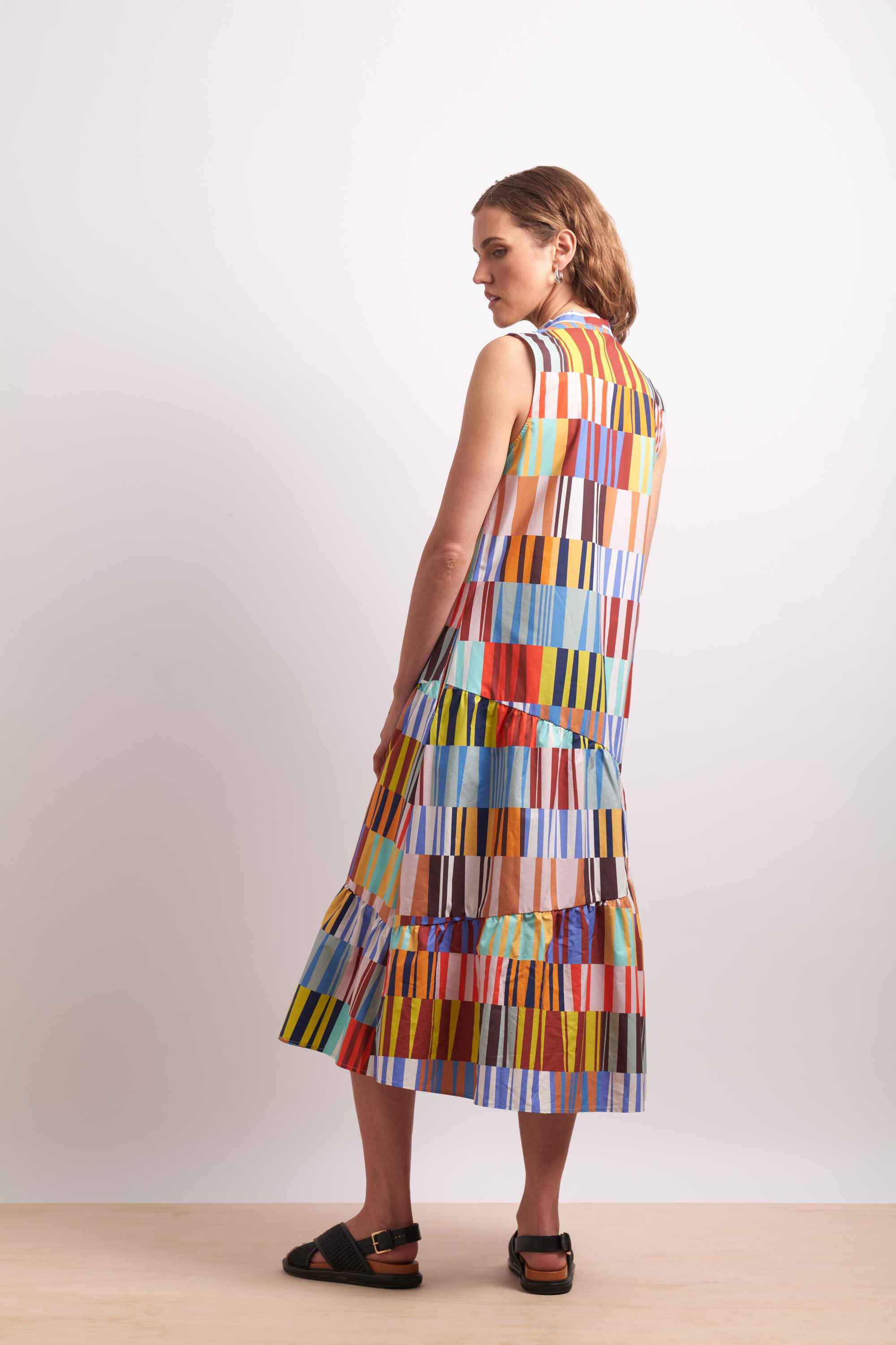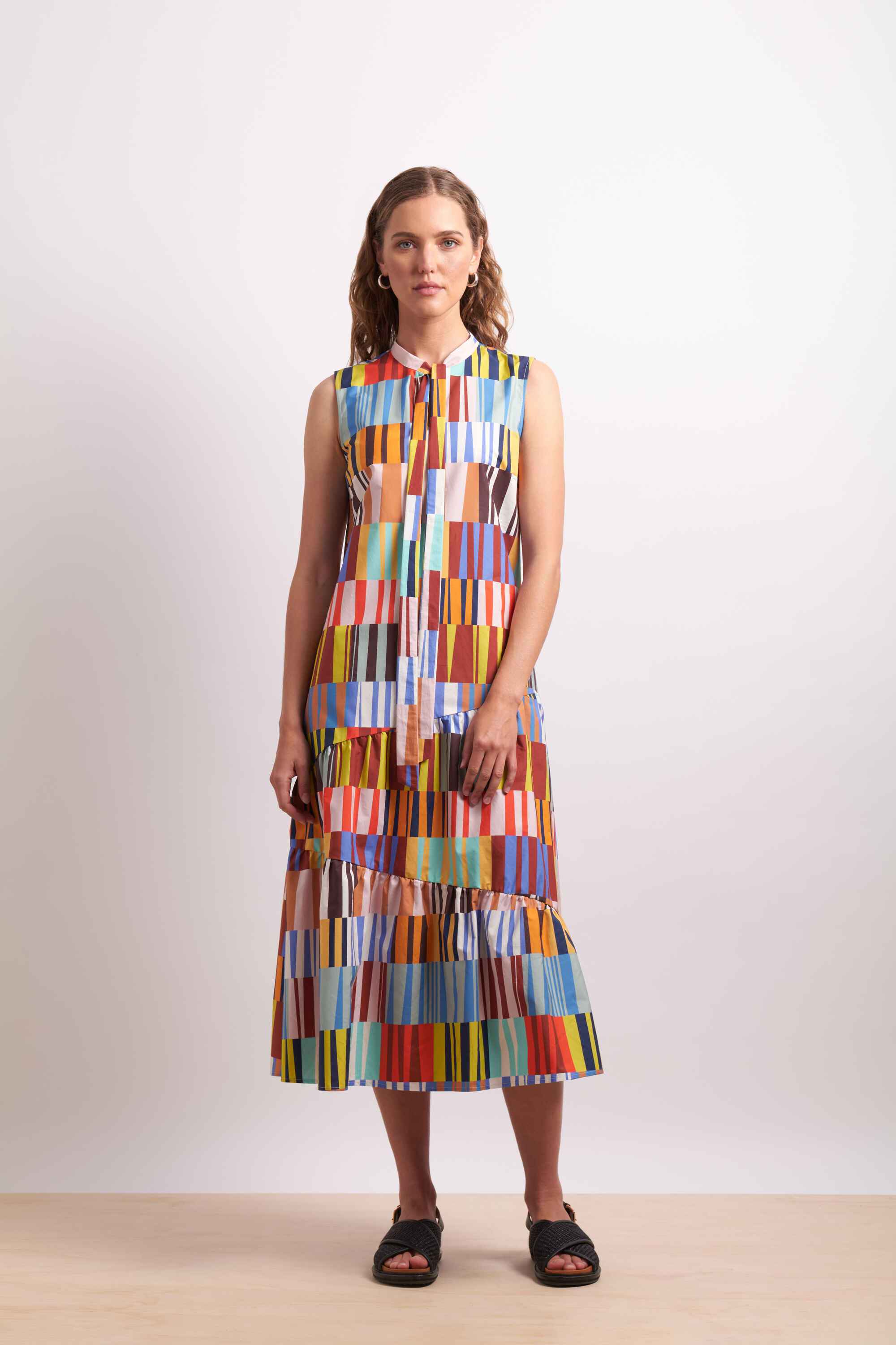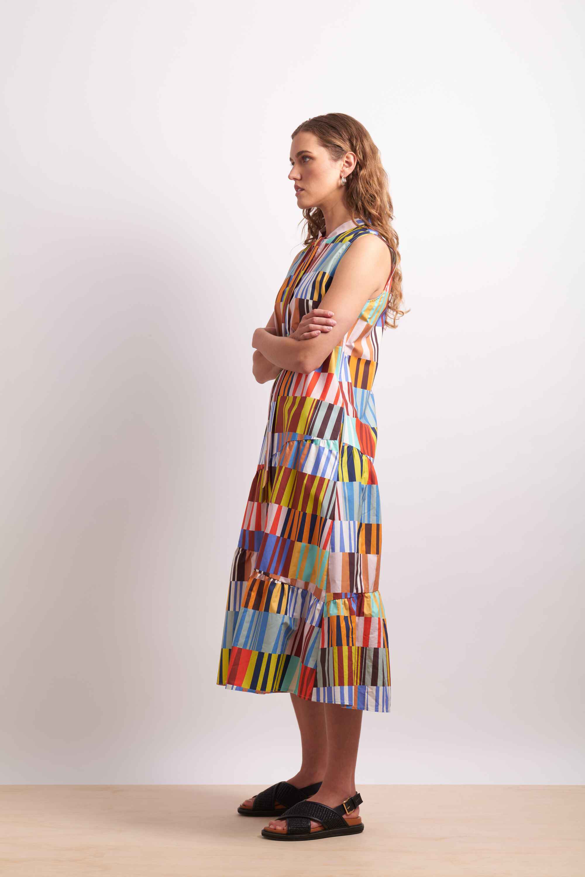 A modern yet romantic style, the Paper Trail Dress is crafted from crisp 100% cotton poplin. A sleeveless midi with a fitted bodice, it features a front tie on the neck and cascading diagonal tiers through the skirt. A feminine A-line shape with pockets, it is designed   for movement and charm. Designed in Christchurch, New Zealand.