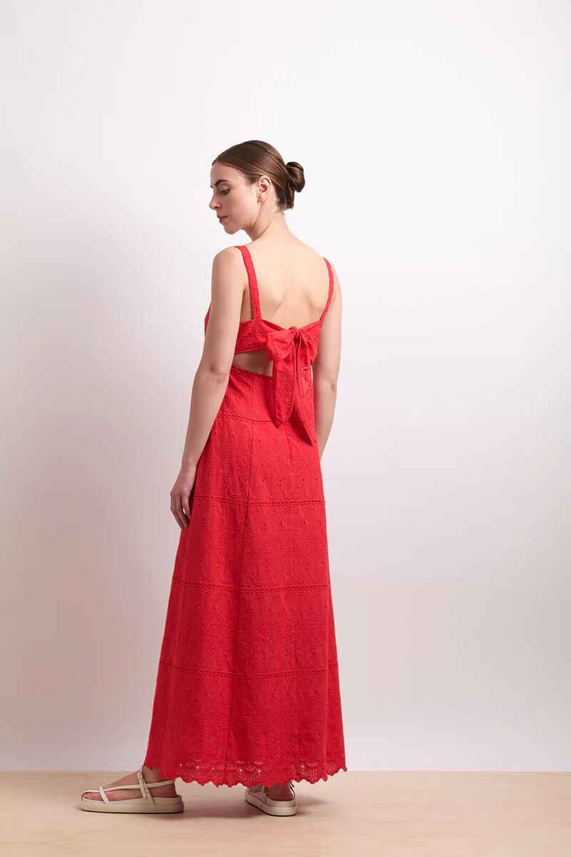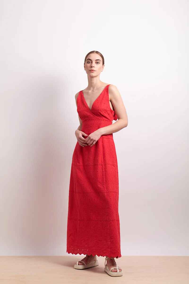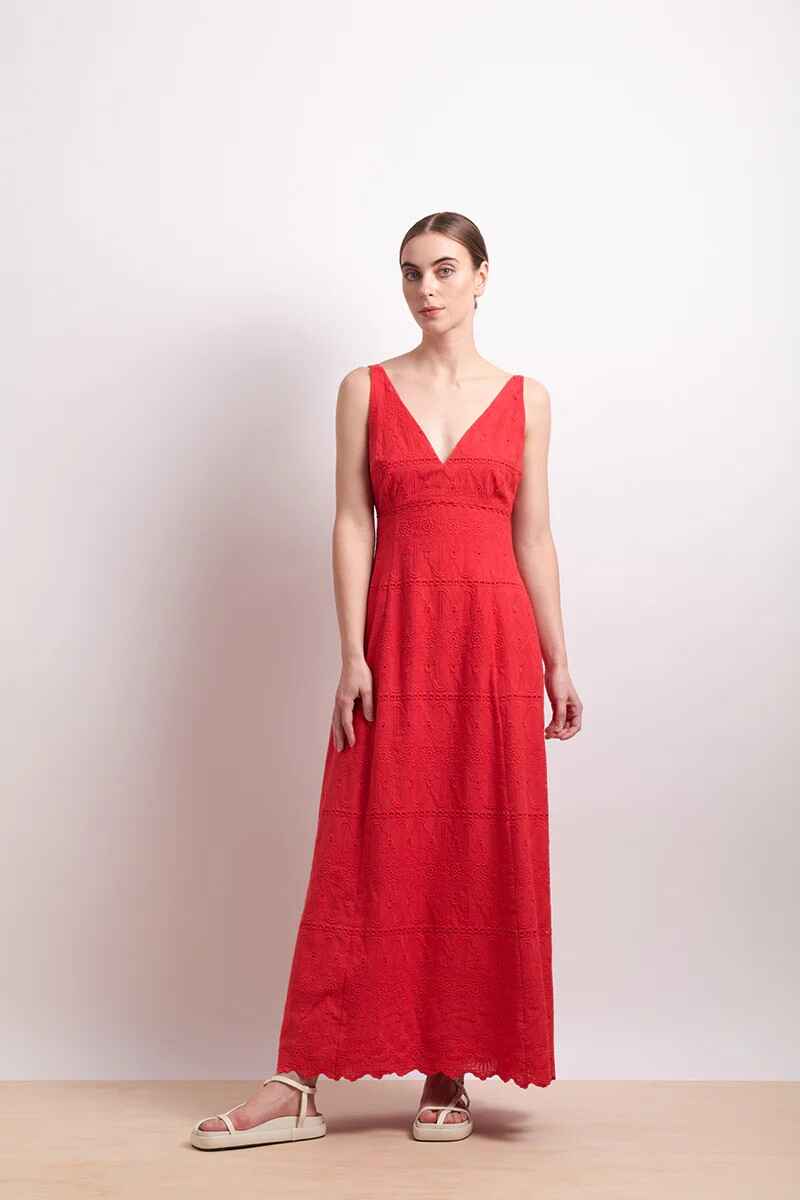 Crafted from 100% embroidered cotton, The Beau Dress is a romantic silhouette with modern structure. A low V neckline and wide shoulder straps frame the fitted bodice, while a scalloped hem and tie-back cut-out add playful detail. Full-length and effortlessly elegant. Designed in Christchurch, New Zealand.