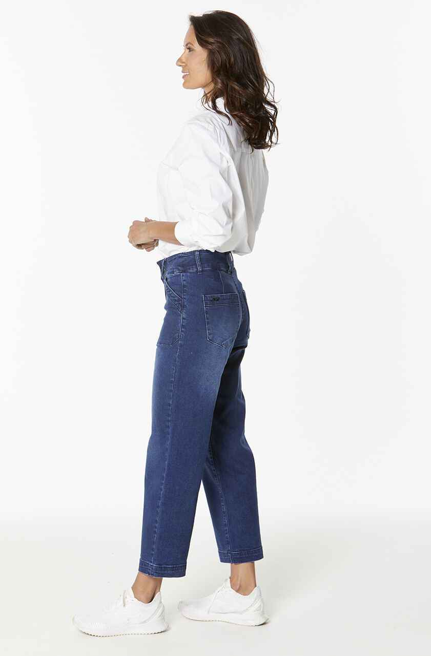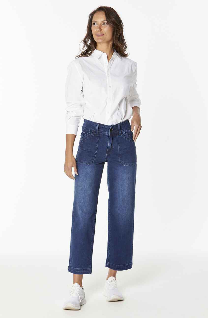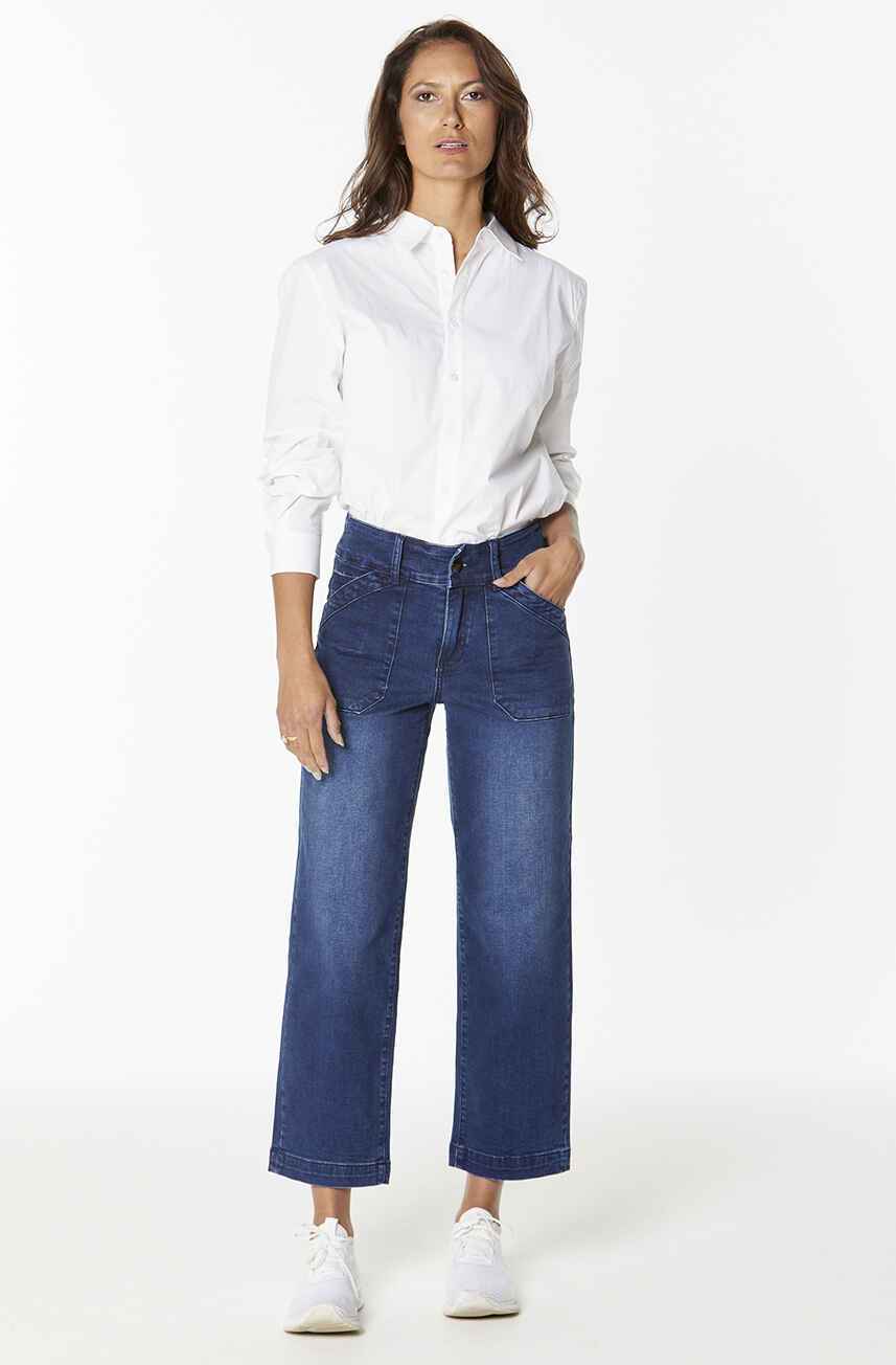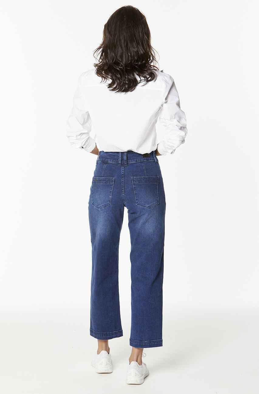 On trend wide leg ankle length jean in a lovely soft stretch dark wash denim. 28cm rise and 27inch inseam. 46cm circumference at hem.