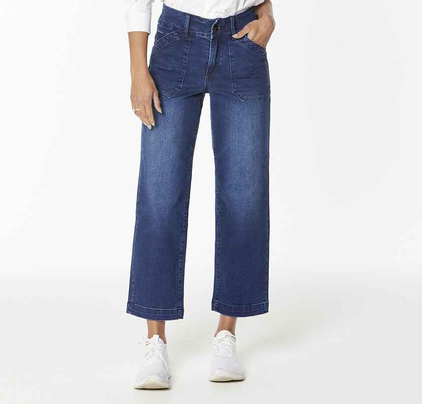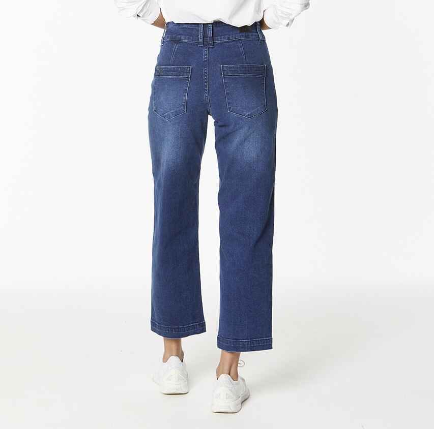 On trend wide leg ankle length jean in a lovely soft stretch dark wash denim. 28cm rise and 27inch inseam. 46cm circumference at hem.98% Cotton 2% Spandex Care Instructions:Wash inside out, cold gentle wash with similar colours. Do not soak or bleach. Line dry in shade, do not tumble dry. Dry cleanable. Always check the label.