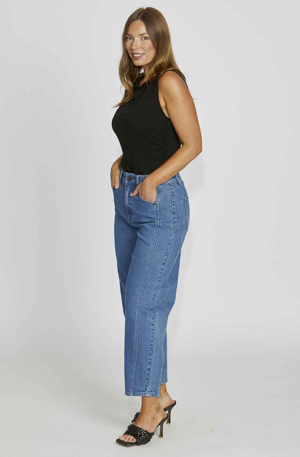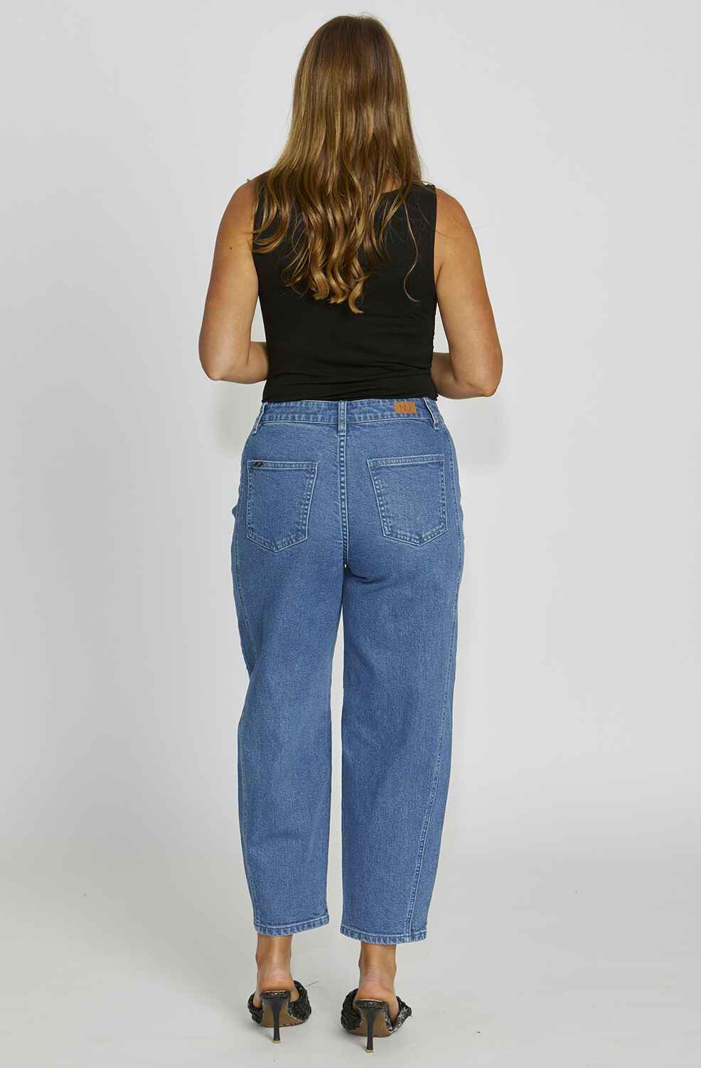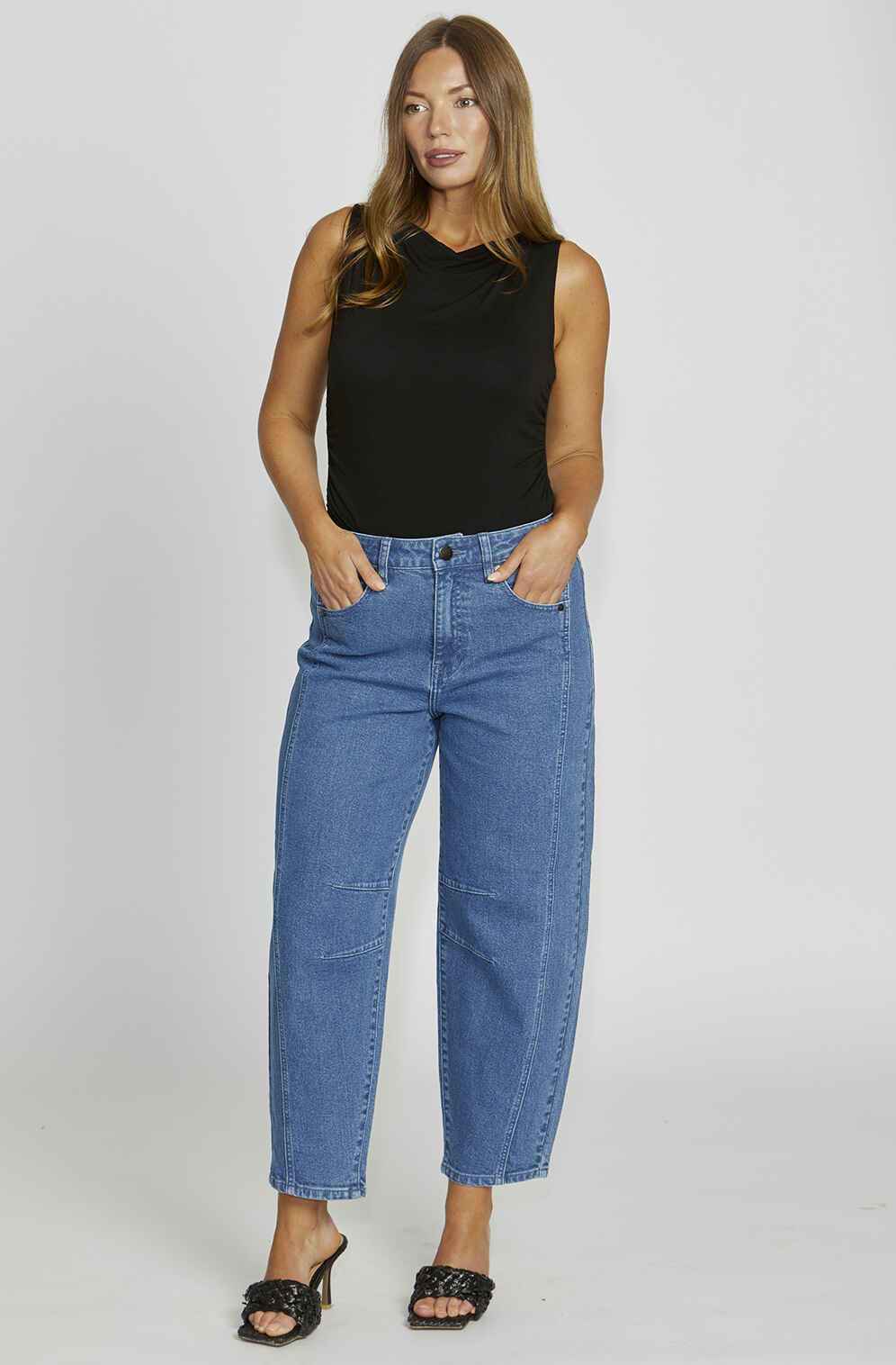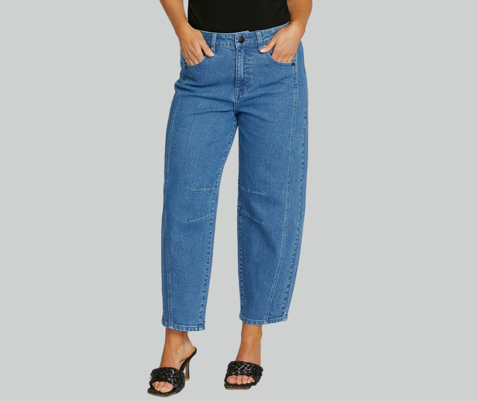 On trend Barrel Jean. Relaxed curved leg jeans which are fitted at the waist, have a flared out shape around the mid thigh and a tapered silhouette at the bottom. High rise. 27inch inseam.99% Cotton 1% Spandex Care Instructions:Wash inside out, cold gentle wash with similar colours. Do not soak or bleach. Line dry in shade, do not tumble dry. Dry cleanable. Always check the label.