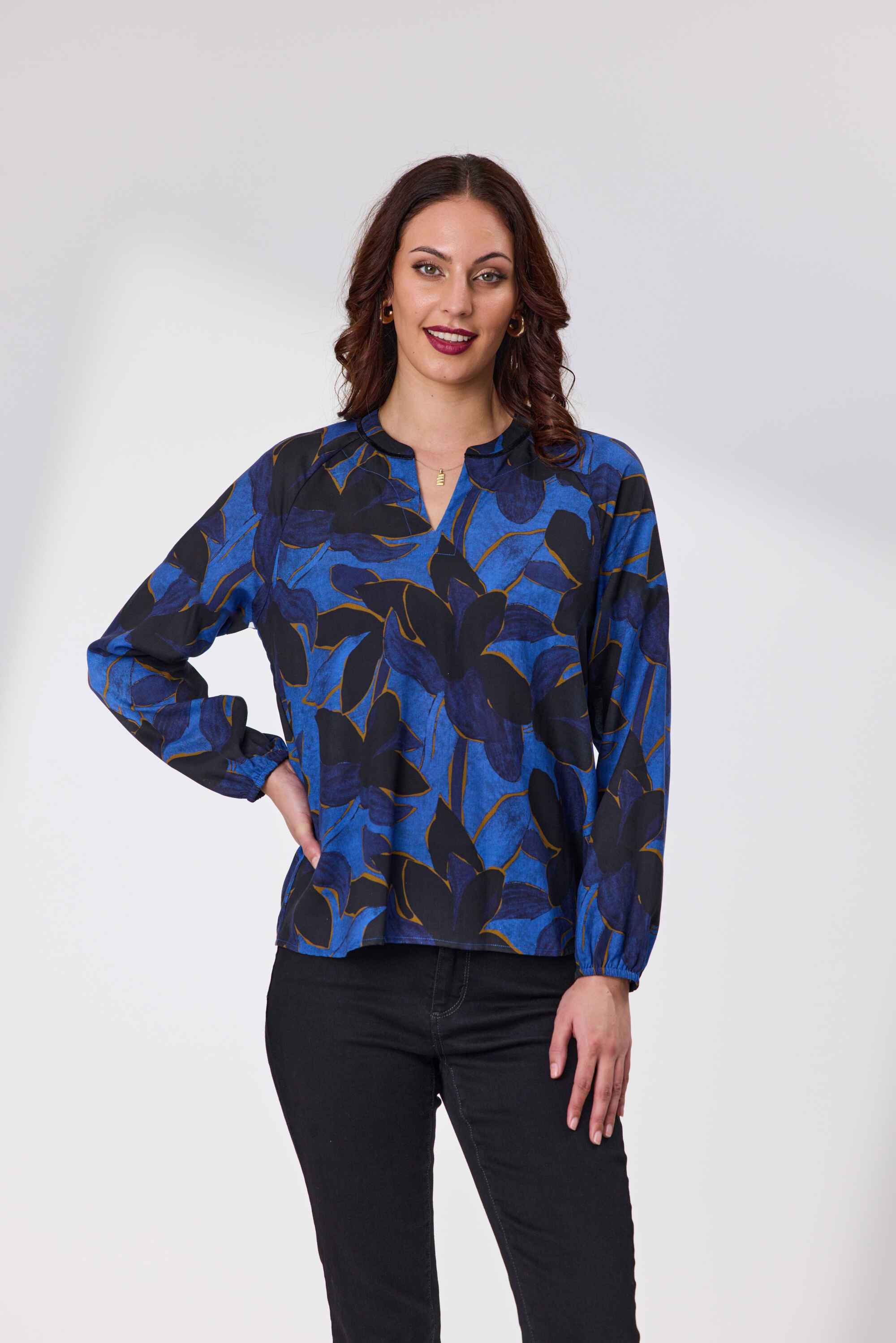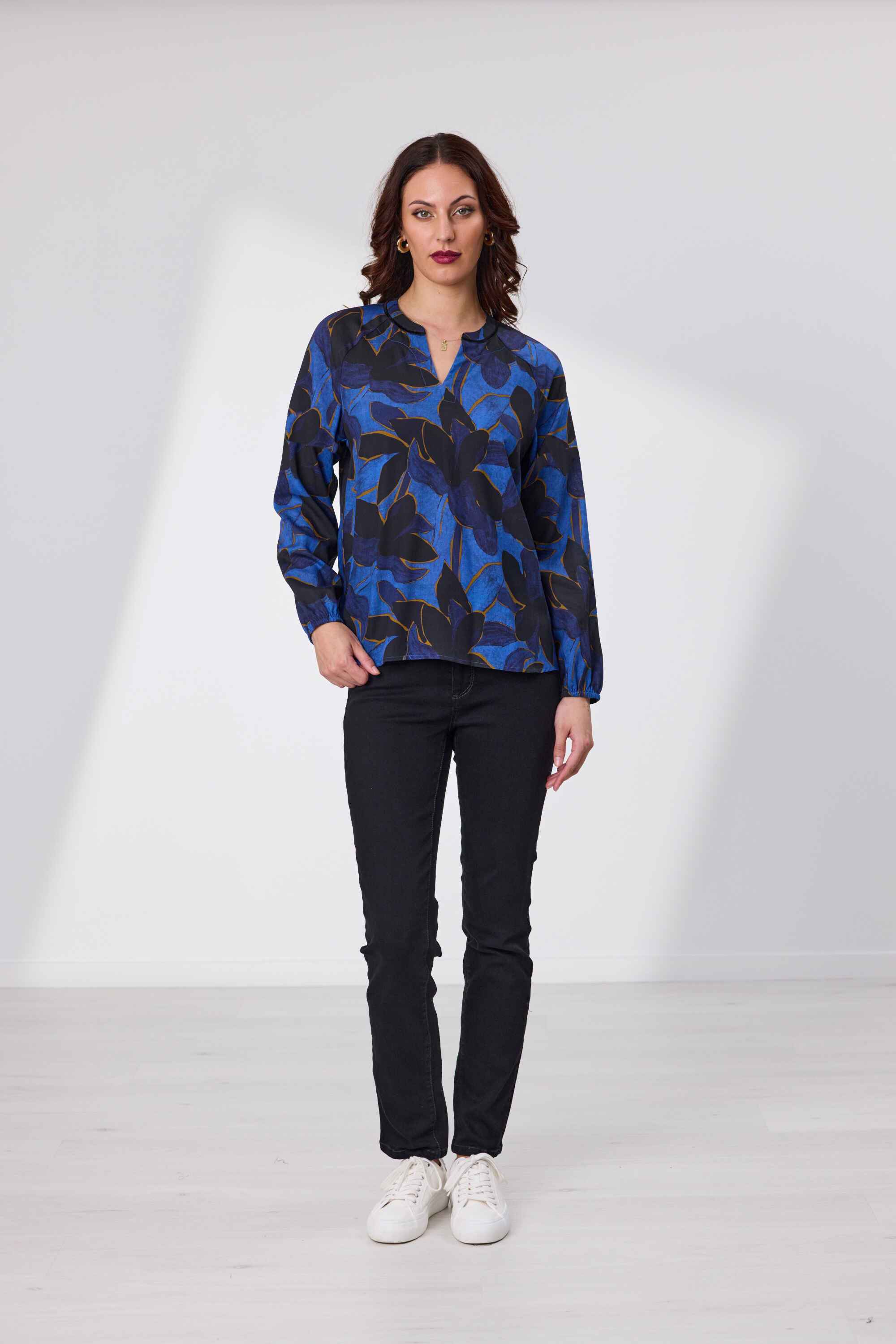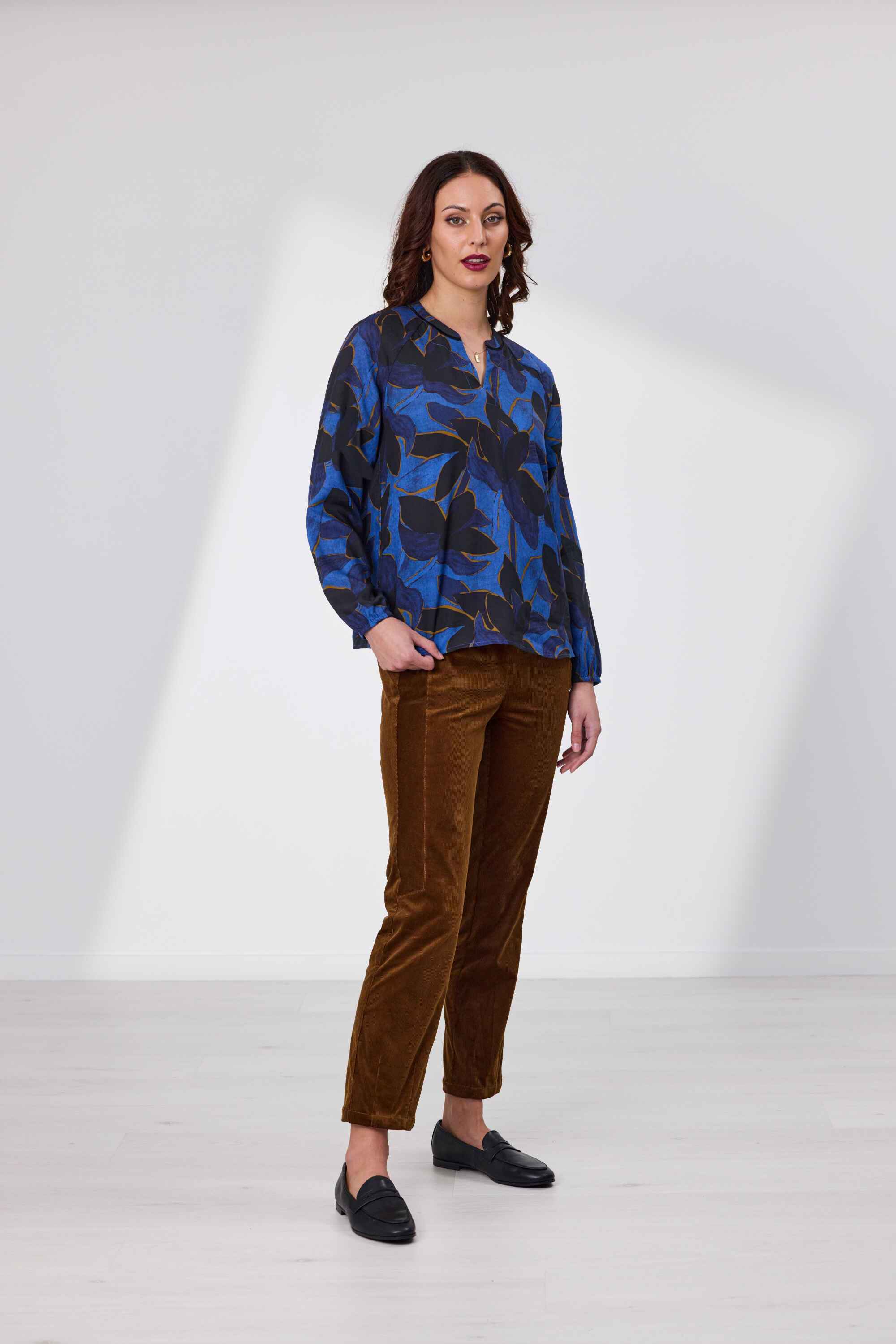 The Azure Print Blouse features a mandarin collar with a notched neckline, accented by a velvet tape trim for a refined finish. Raglan sleeves and elasticated cuffs lend ease and softness to its elegant silhouette.