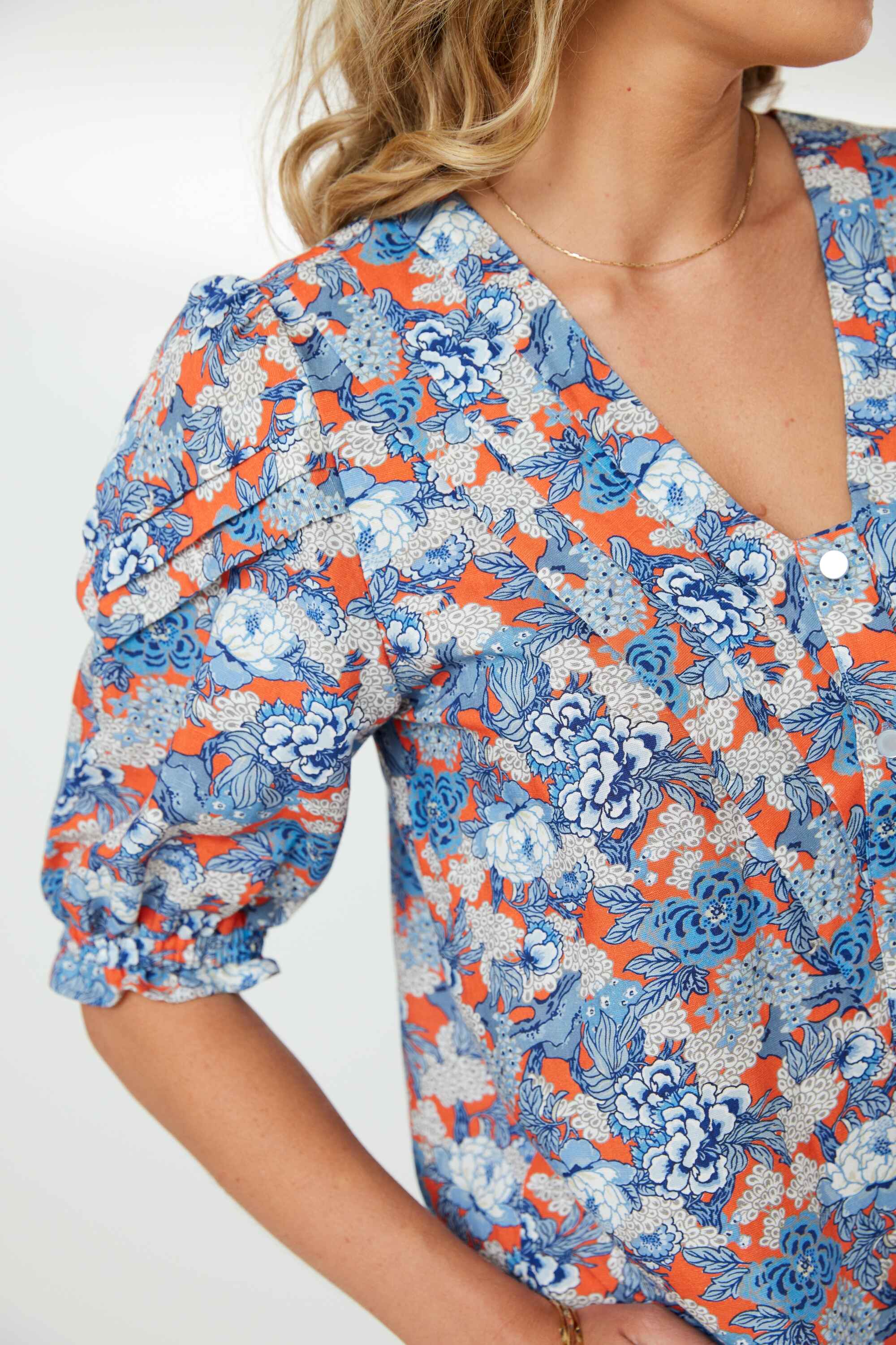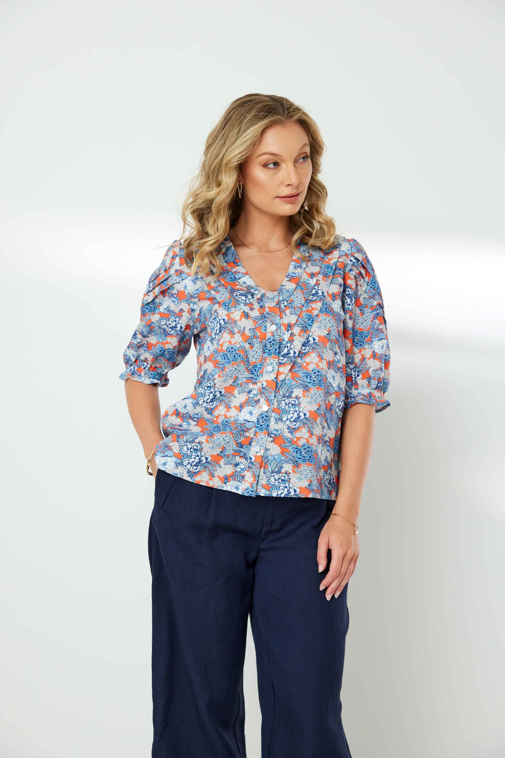 Lyocell/Linen printed blouse. Wide pleat detail at front neck & sleeves. Front button through placket. Set in sleeves with elasticated cuff & frill. Back yoke with box pleat. Hem has side splits.