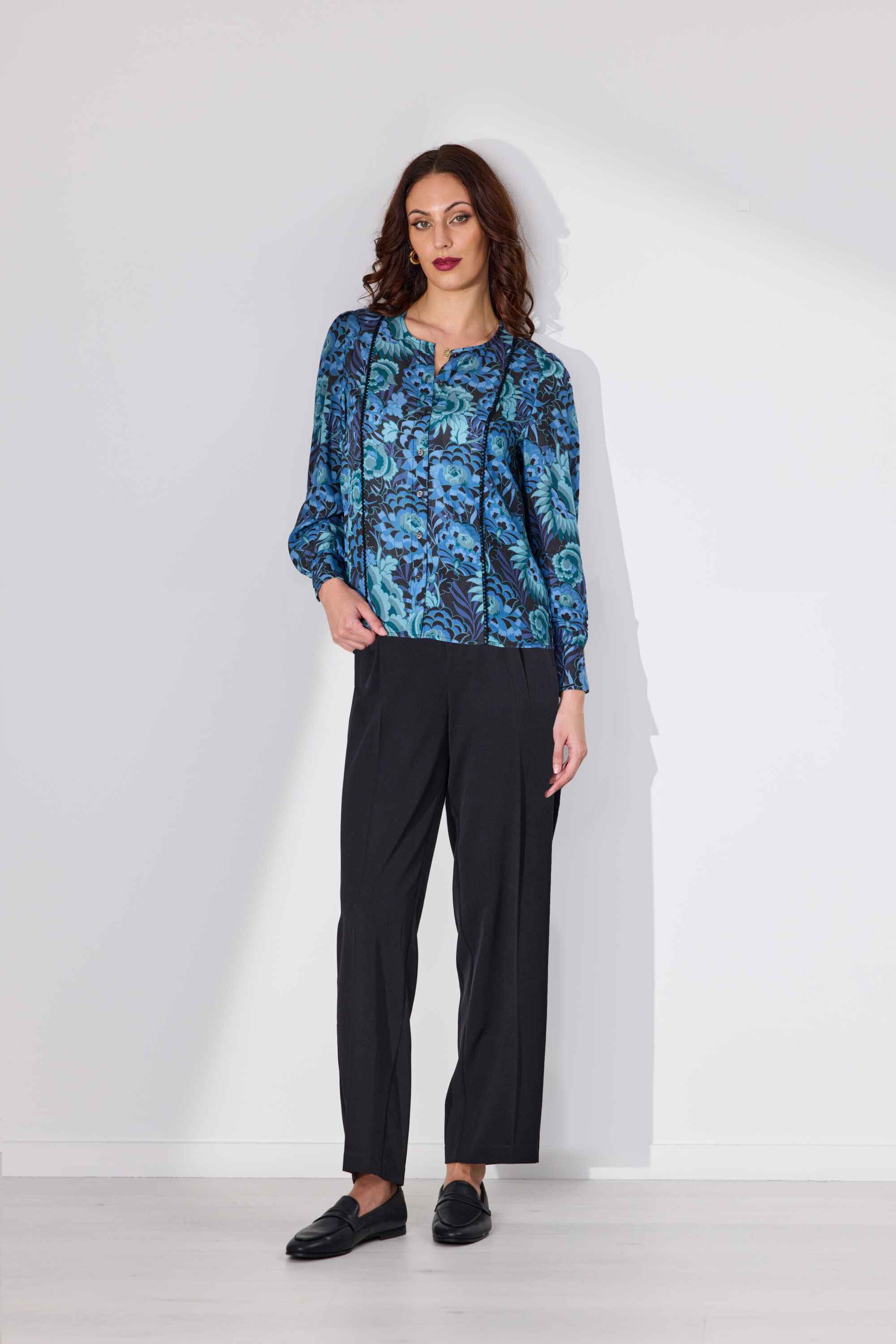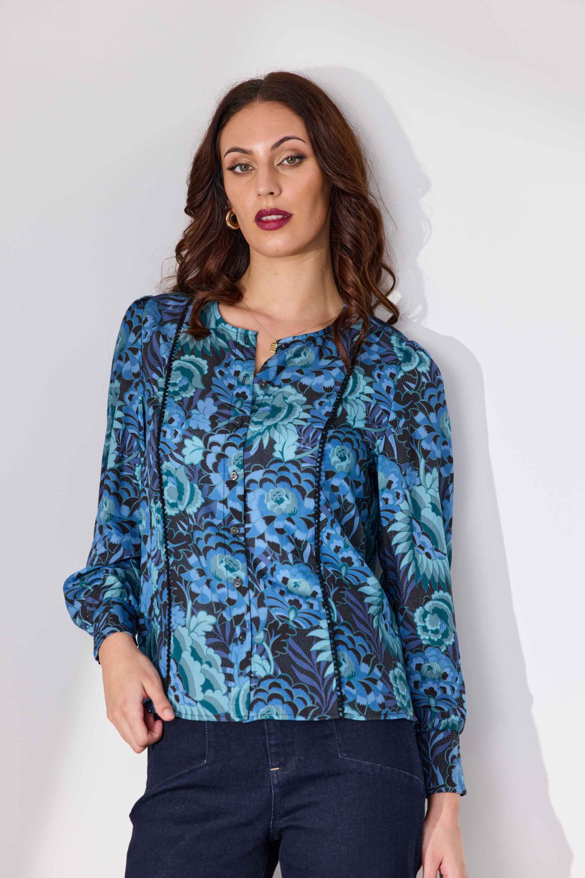 Crafted from a breathable lyocell-linen blend, this blouse features delicate lace-trimmed panels and a soft floral print. The round neckline and shirred back cuffs add subtle structure to its relaxed silhouette