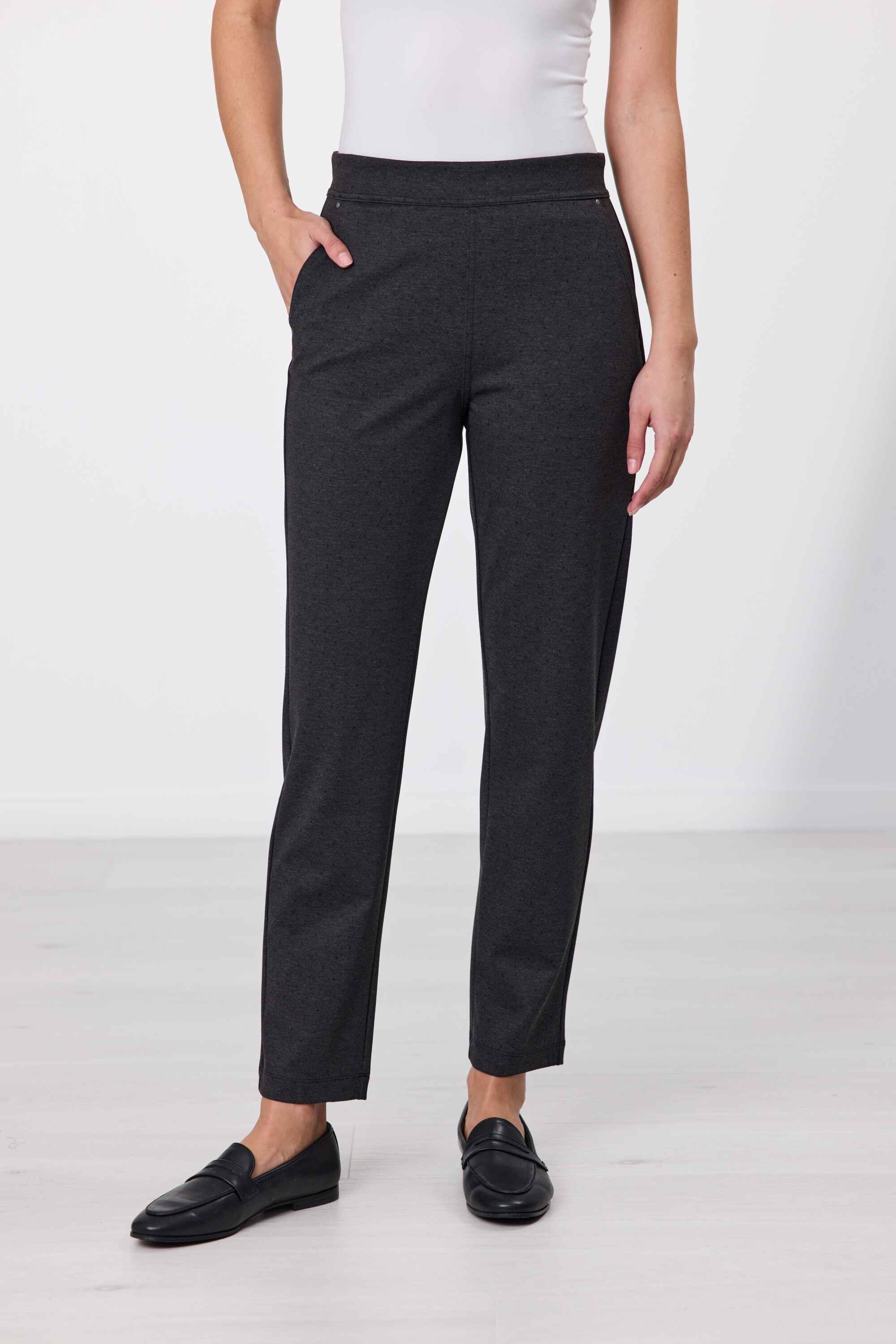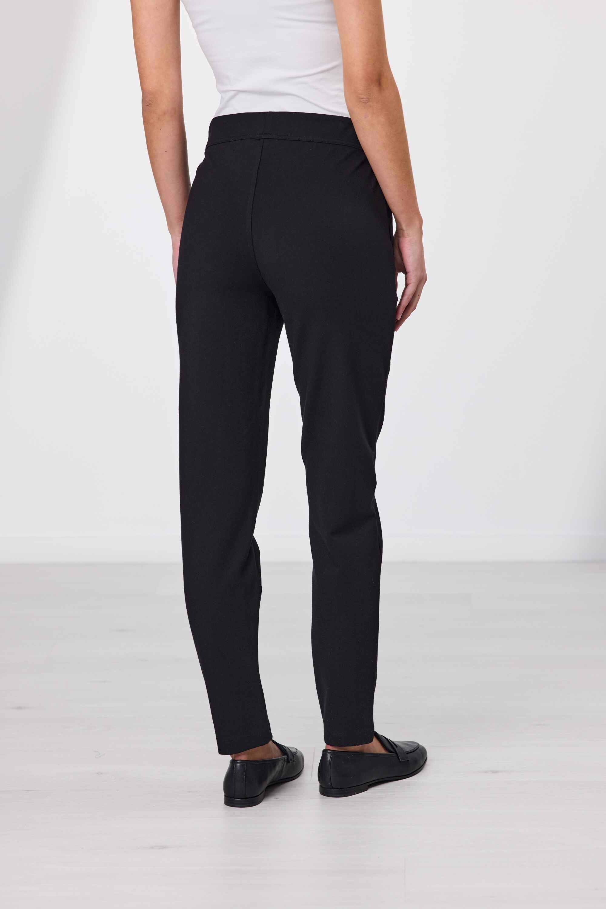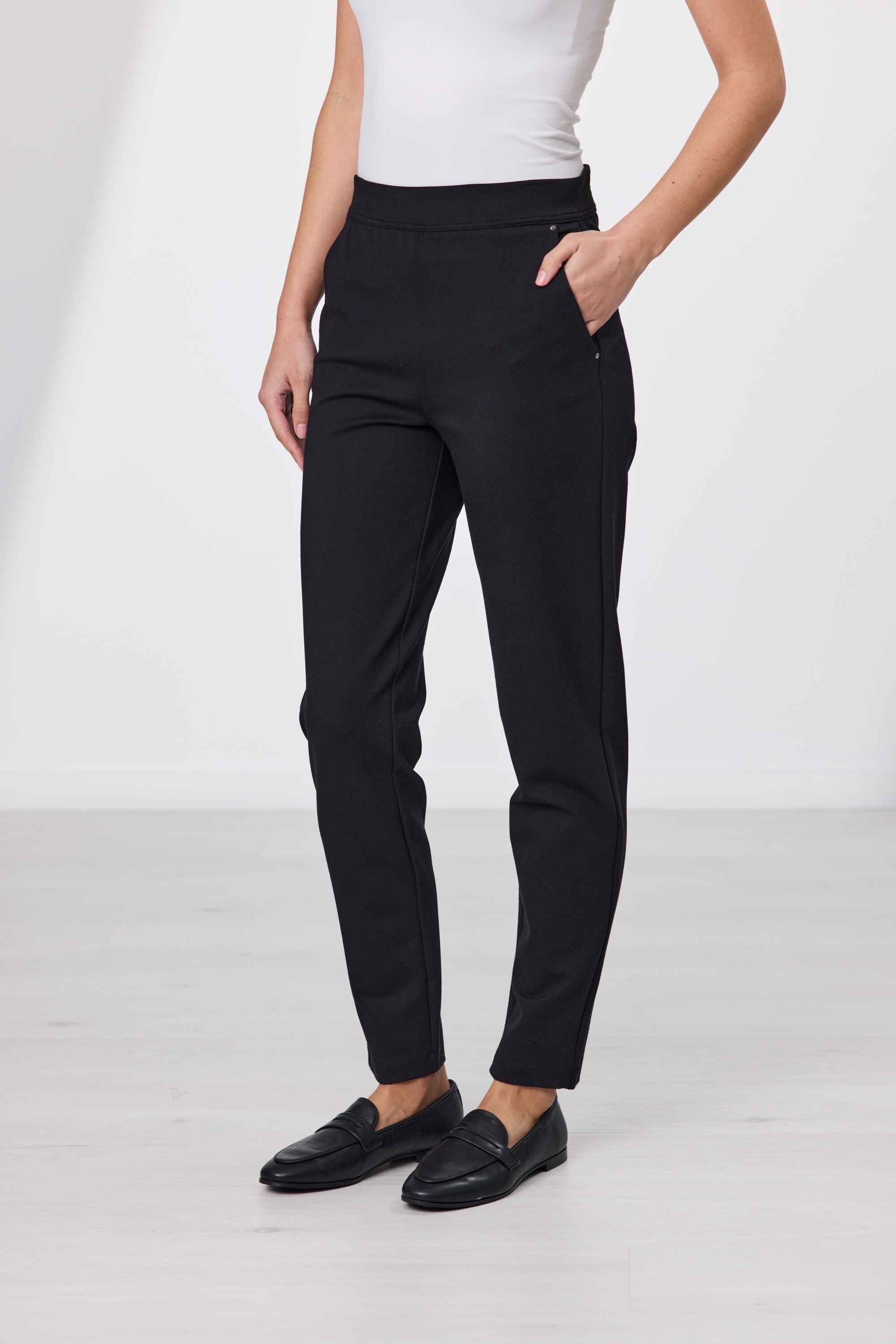 Your go-to pant this winter. The fully elasticated waistband provides a secure and adjustable fit, while the slim leg design adds a sleek and stylish touch. With front pockets for added convenience, these full-length Ponti pants are perfect for both casual and formal occasions
