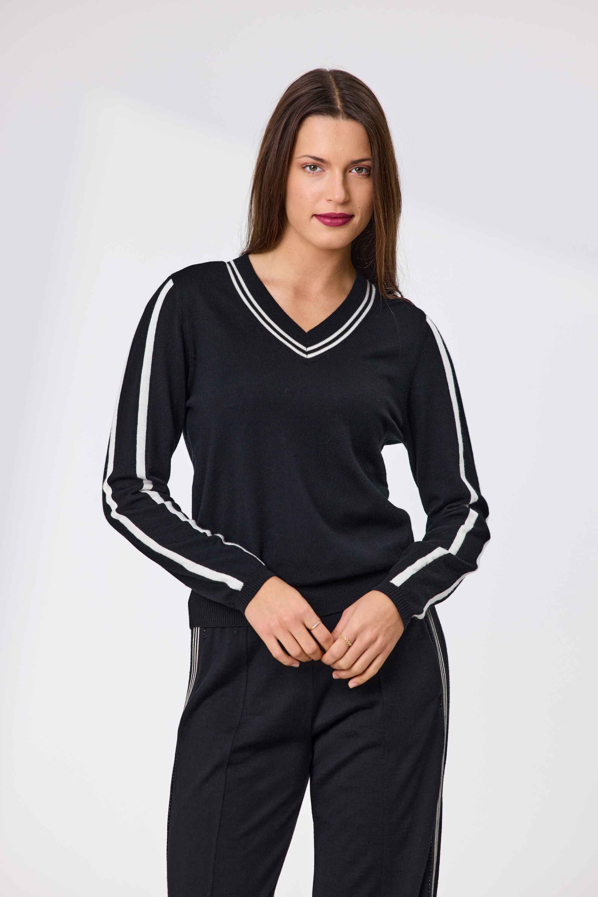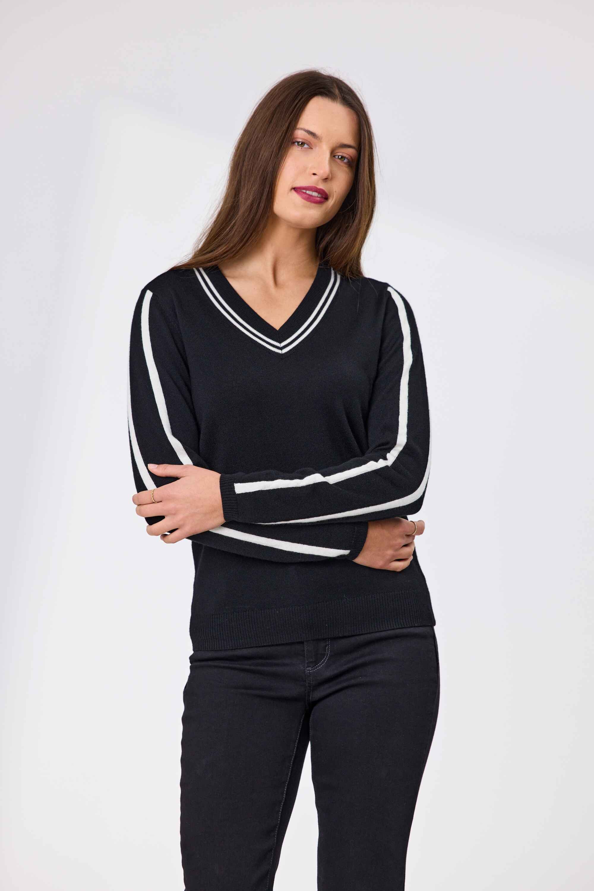 A modern twist on classic knitwear, this 100% Merino wool jumper blends sporty edge with refined comfort. Featuring a flattering V-neckline and bold contrast stripe detailing at the neckline and sleeves, it’s designed to stand out while staying effortlessly wearable. 100% Merino Wool WASH SEPARATELY BEFORE USEWASH ONLY WITH WOOL FRIENDLY DETERGENTCOLD GENTLE MACHINE WASHWASH INSIDE OUT WITH SIMILAR COLOURSDO NOT BLEACHDO NOT SOAK IN OR USE OXIDATIVE STAIN REMOVERSDO NOT TUMBLE DRYDRY FLAT IN SHADEWARM IRON OVER WET CLOTH DRY CLEANABLE