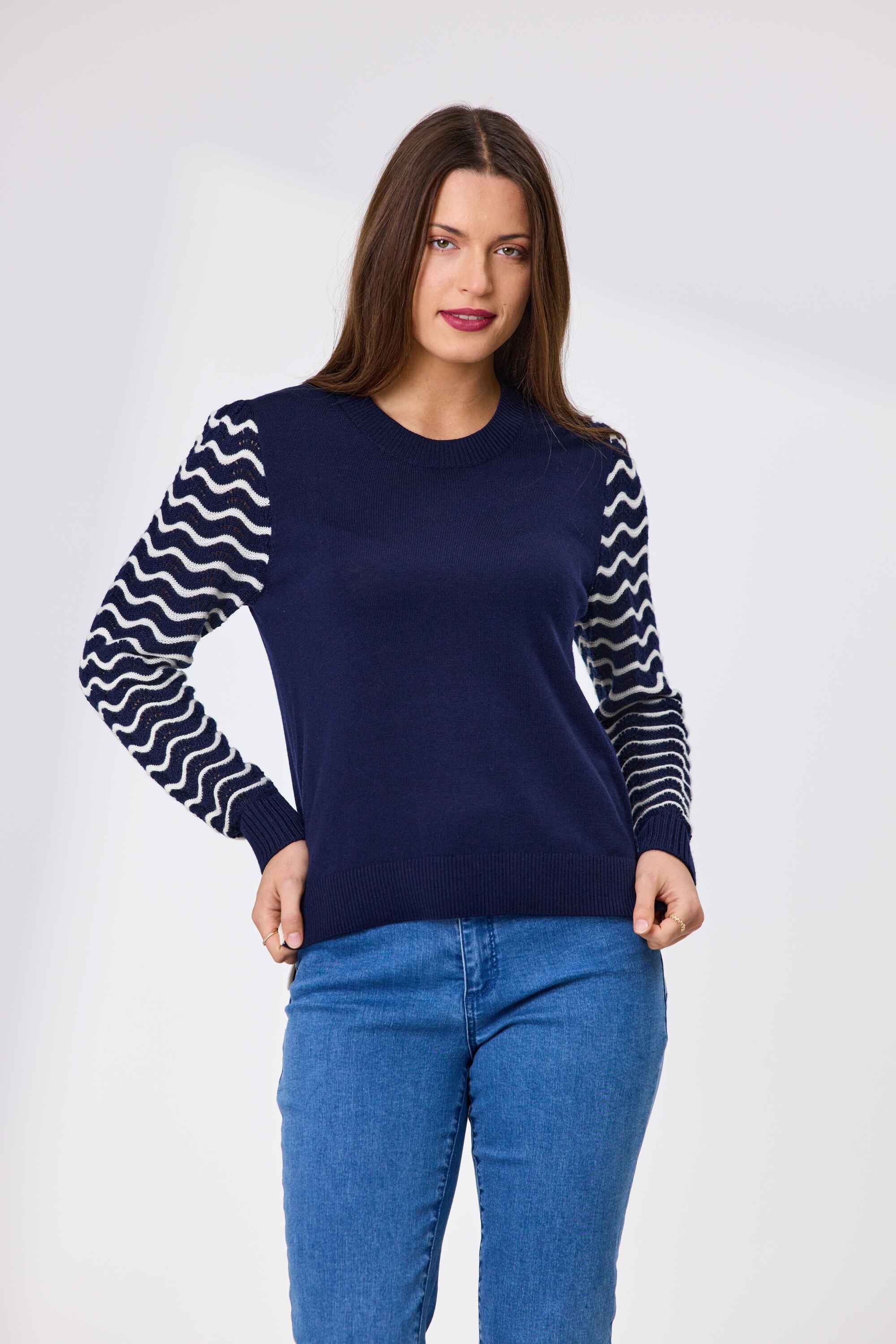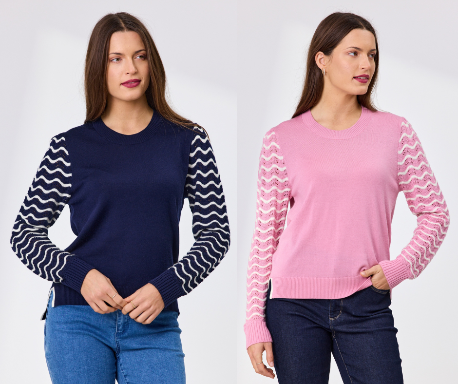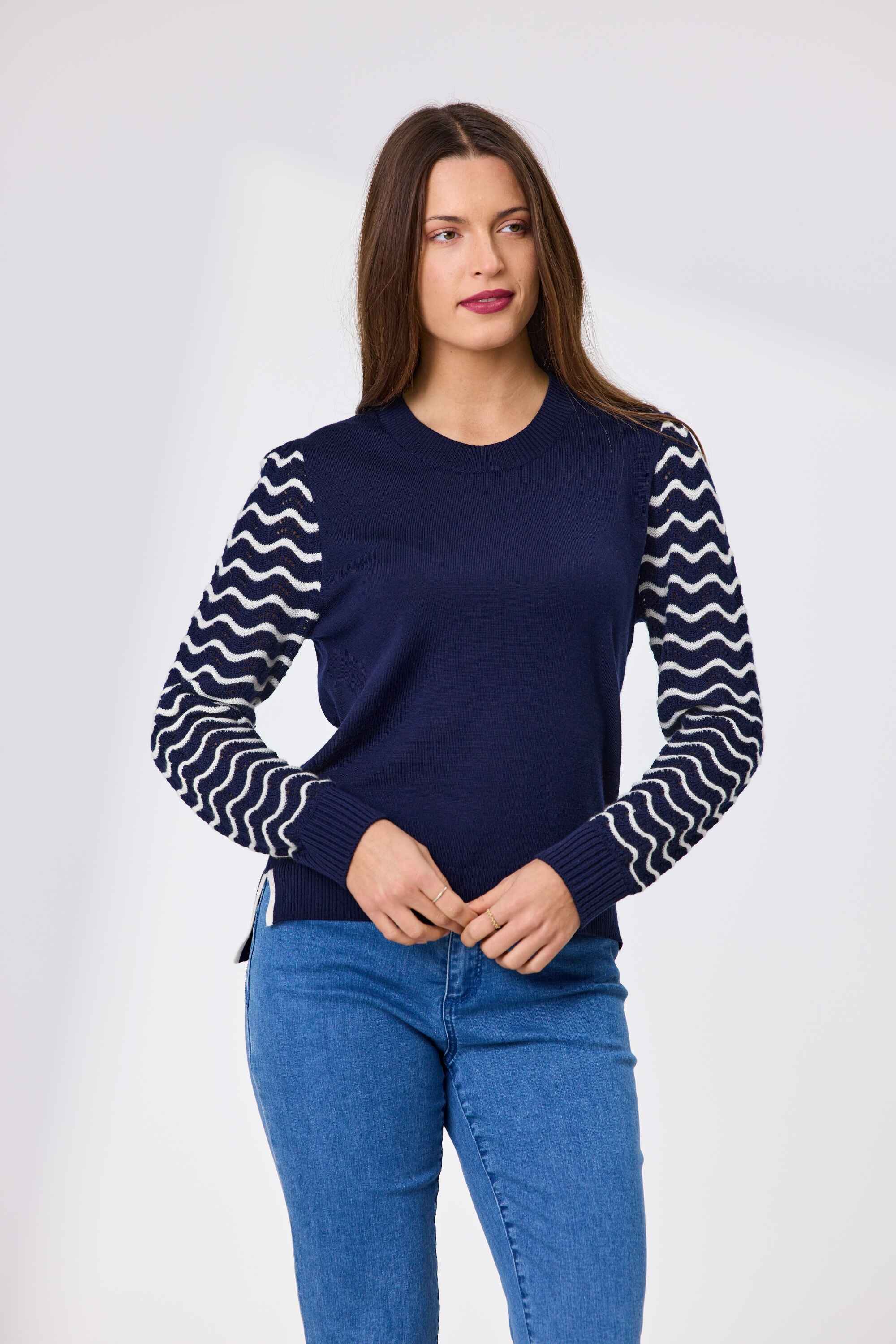 This 100% Merino wool jumper features a classic crew neckline and standout raised jacquard stripes along the sleeves for added texture and interest. Side splits with contrast detailing at the hem lend a modern edge and ease of movement. This versatile piece balances comfort & style with ease.