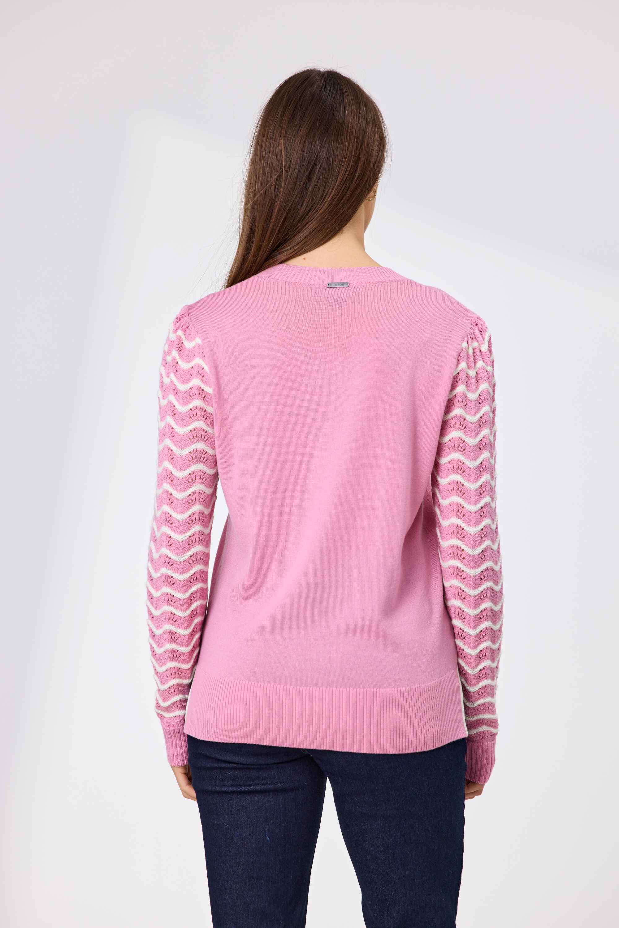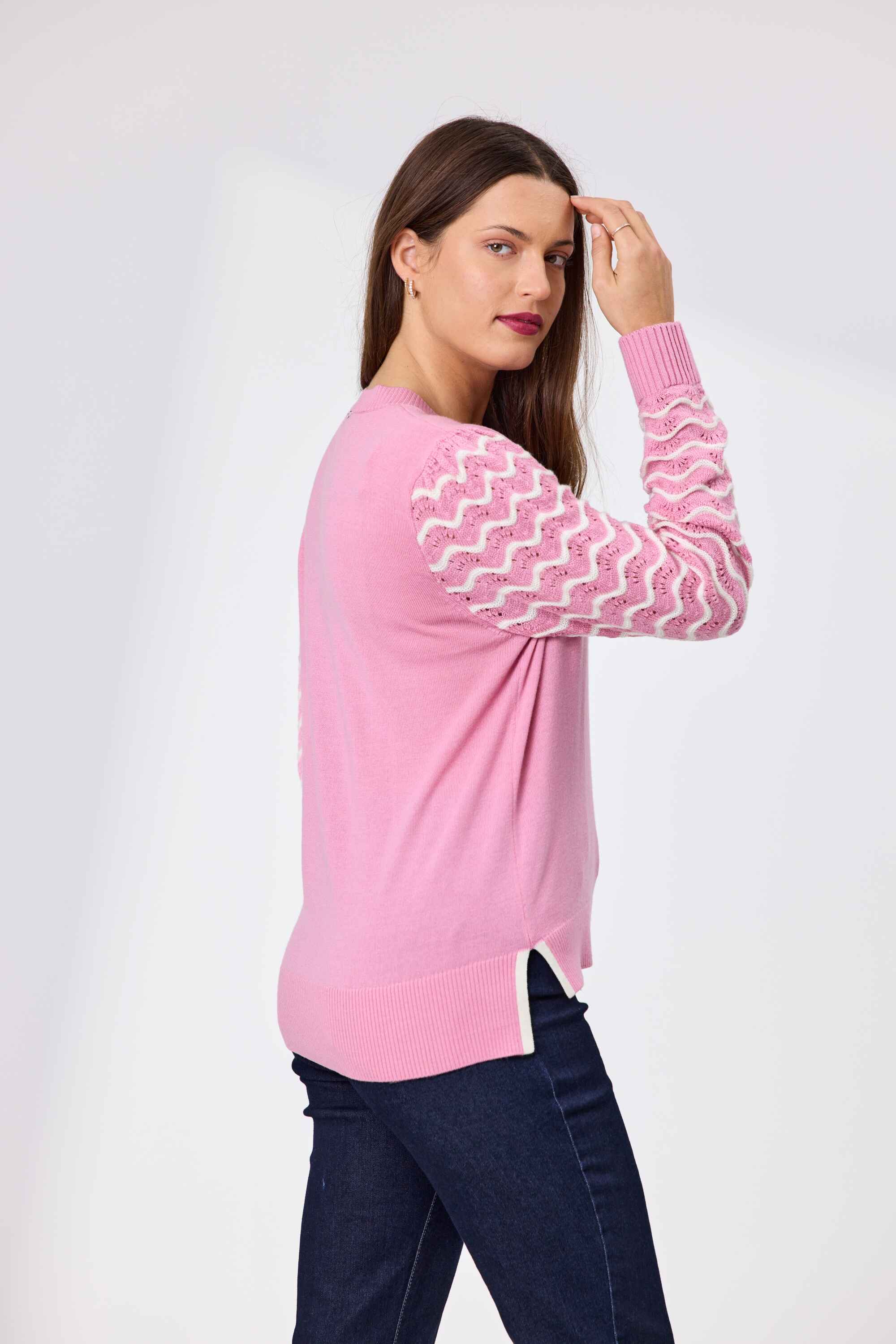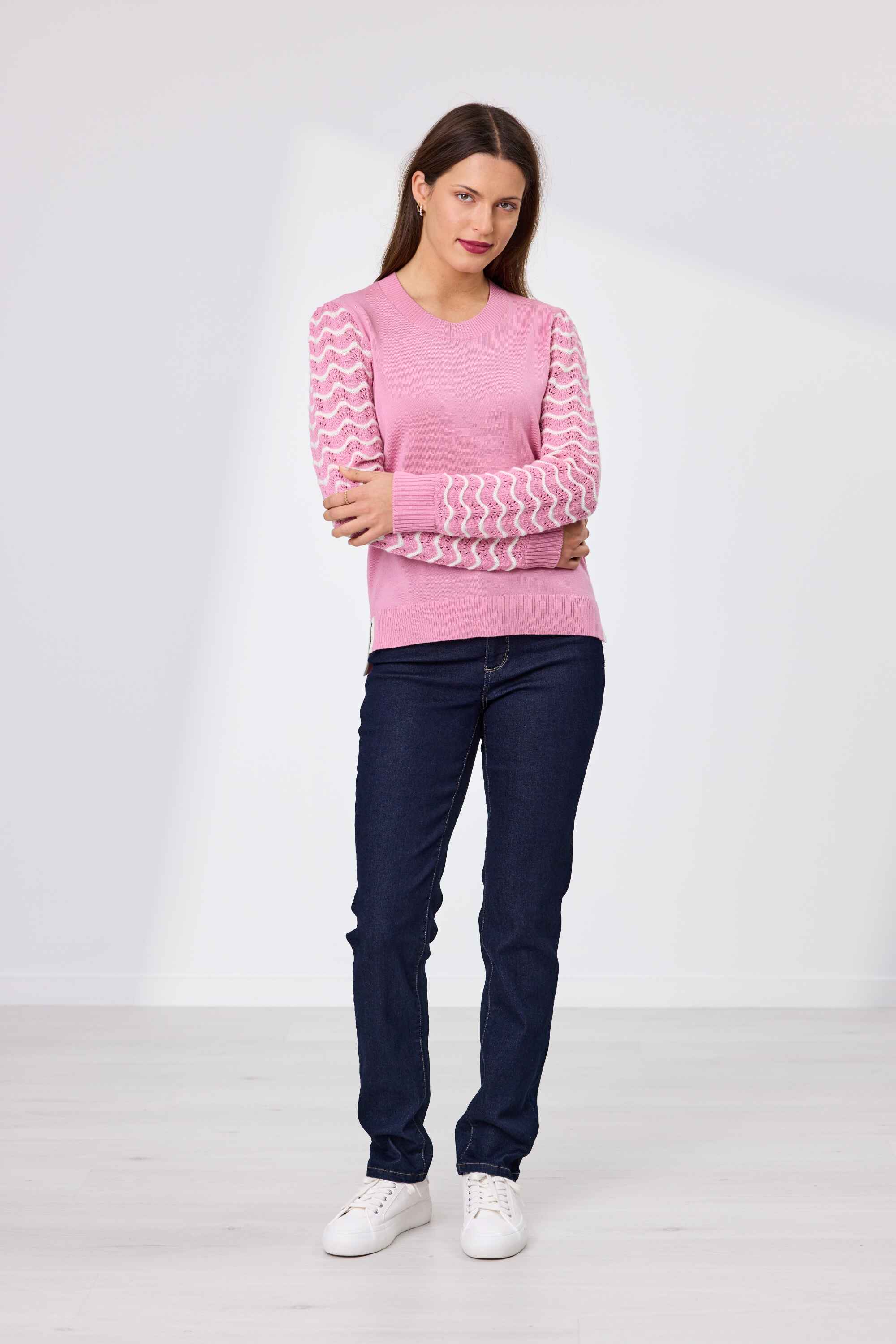 This 100% Merino wool jumper features a classic crew neckline and standout raised jacquard stripes along the sleeves for added texture and interest. Side splits with contrast detailing at the hem lend a modern edge and ease of movement. This versatile piece balances comfort & style with ease.
