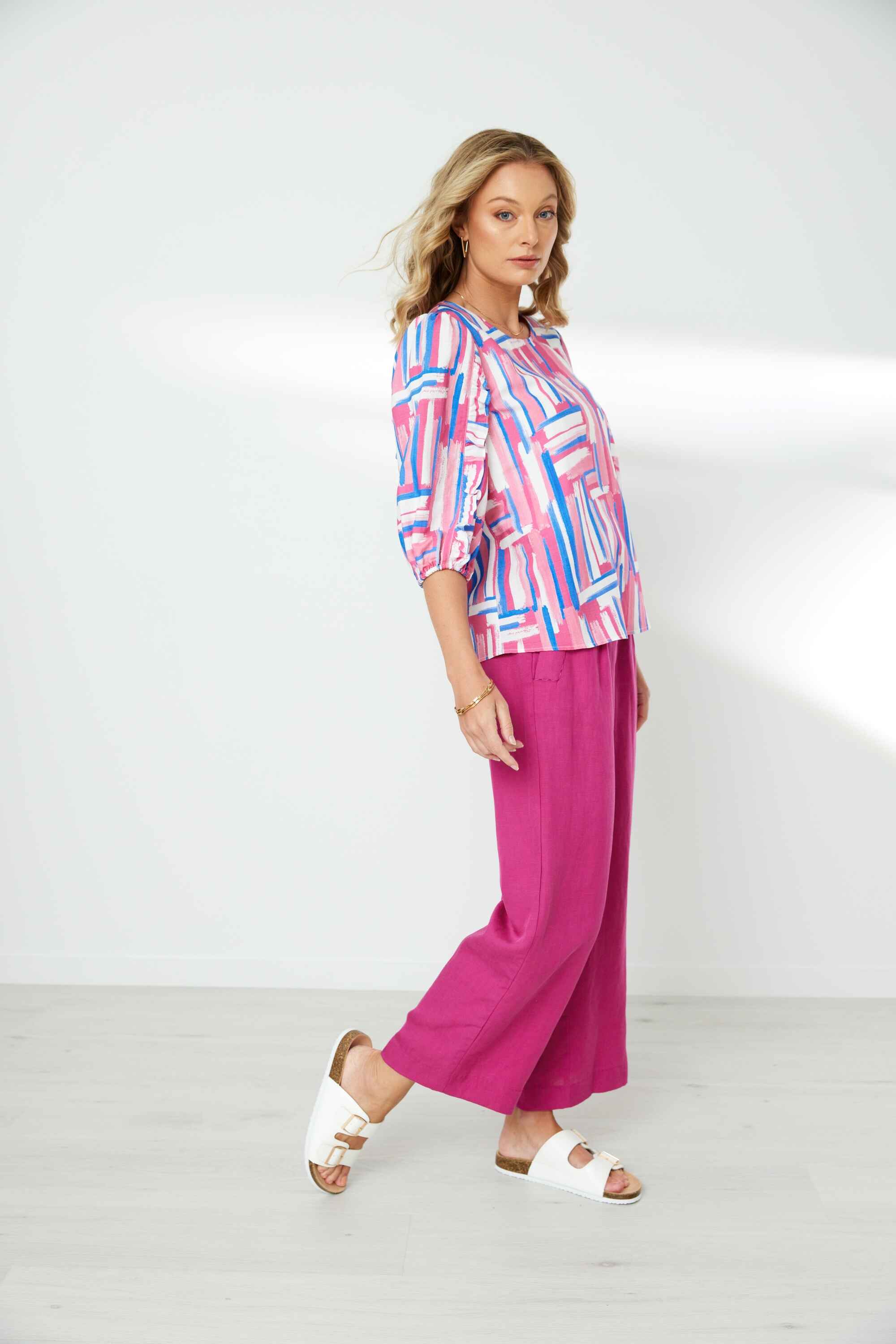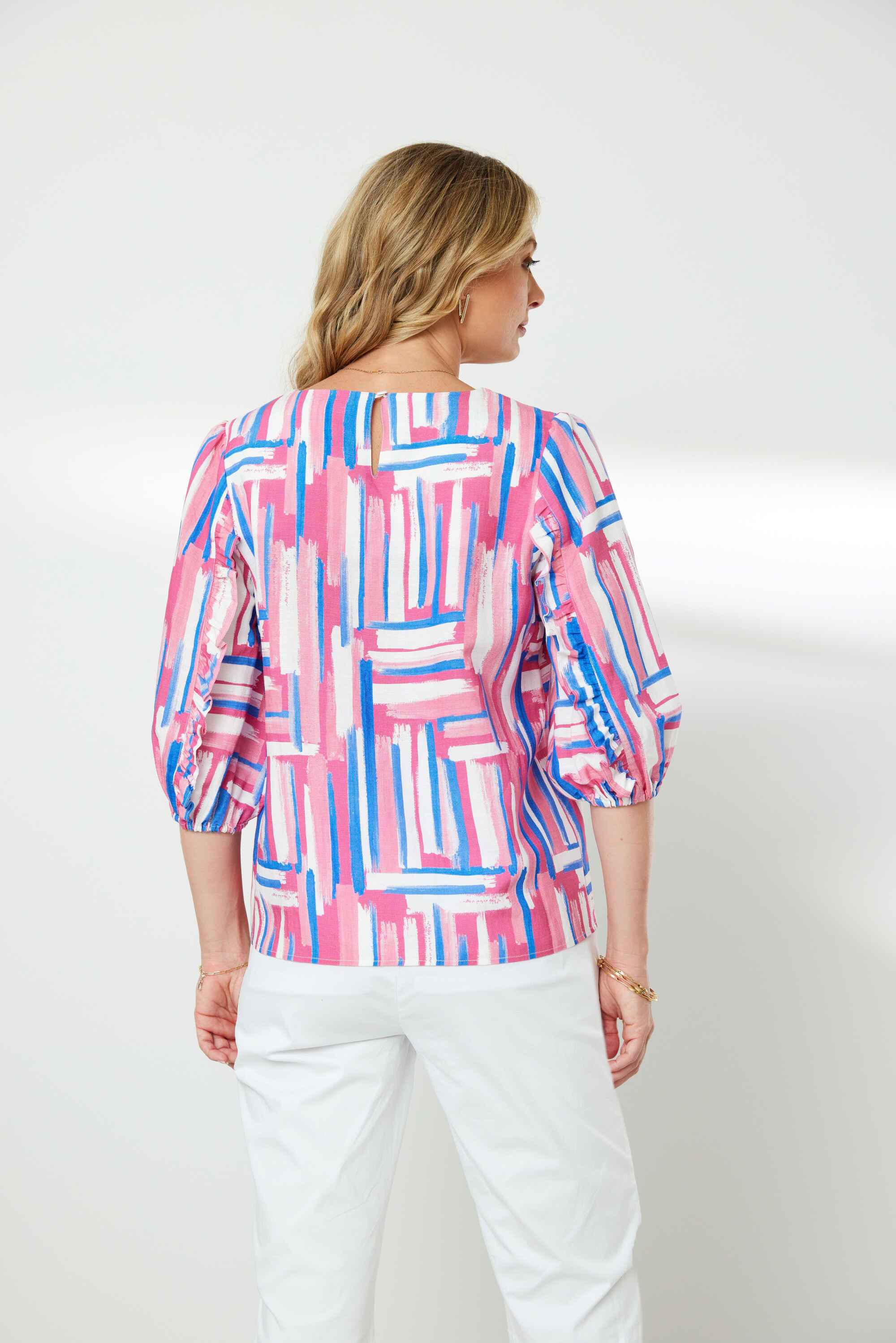 Fresh summer printed top with scoop neck & keyhole detail at back neck. Mid length sleeves with frill at front and back of sleeve. Elasticated cuffs.