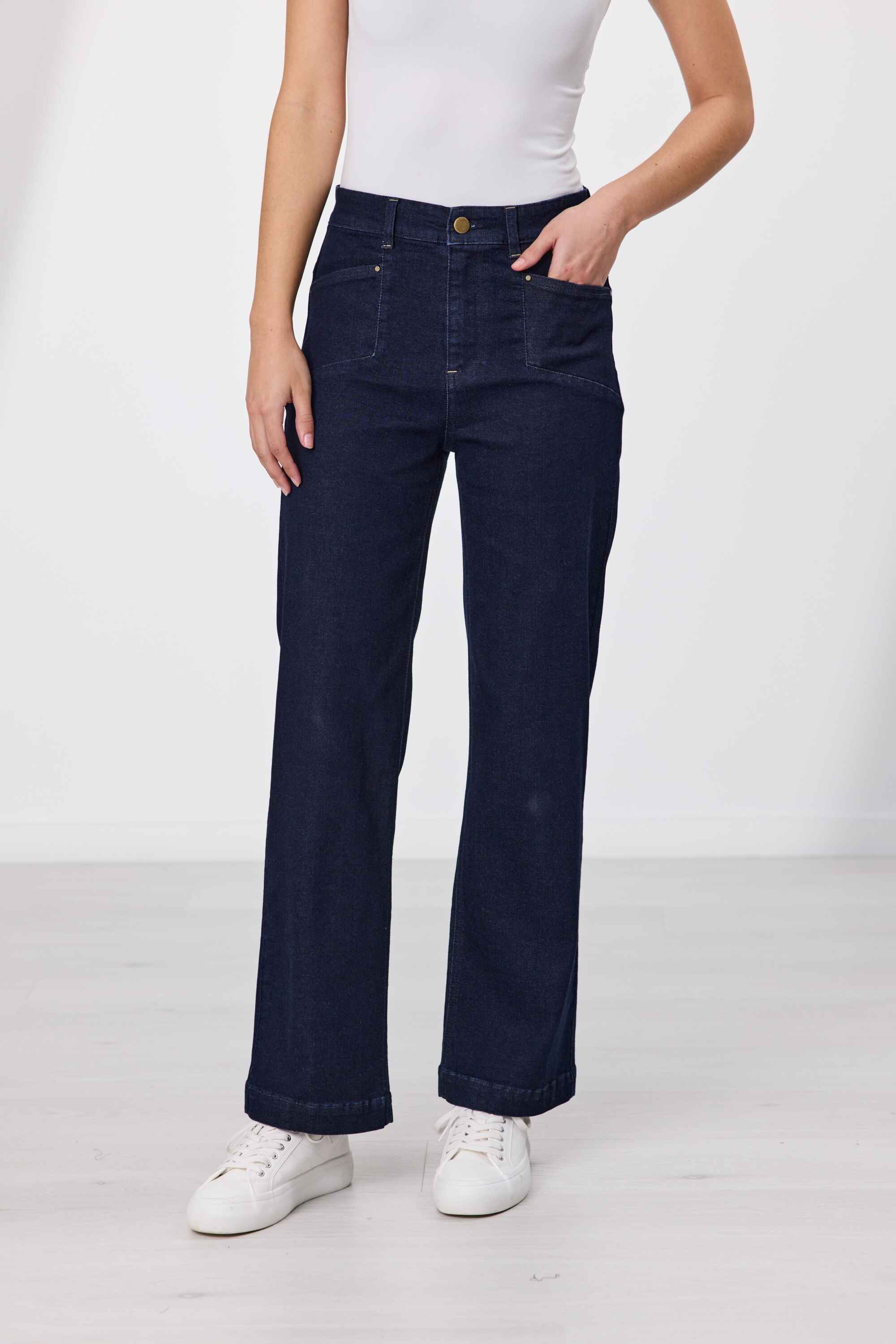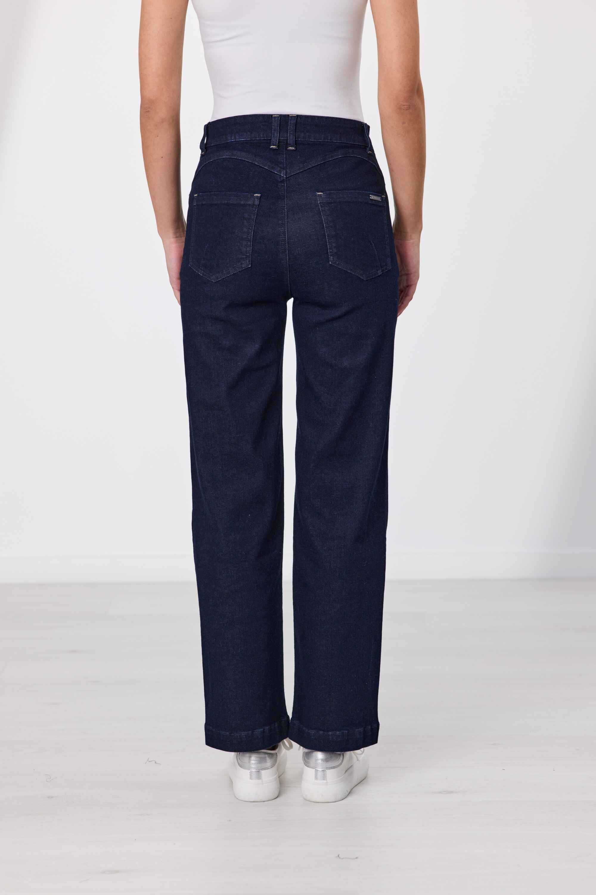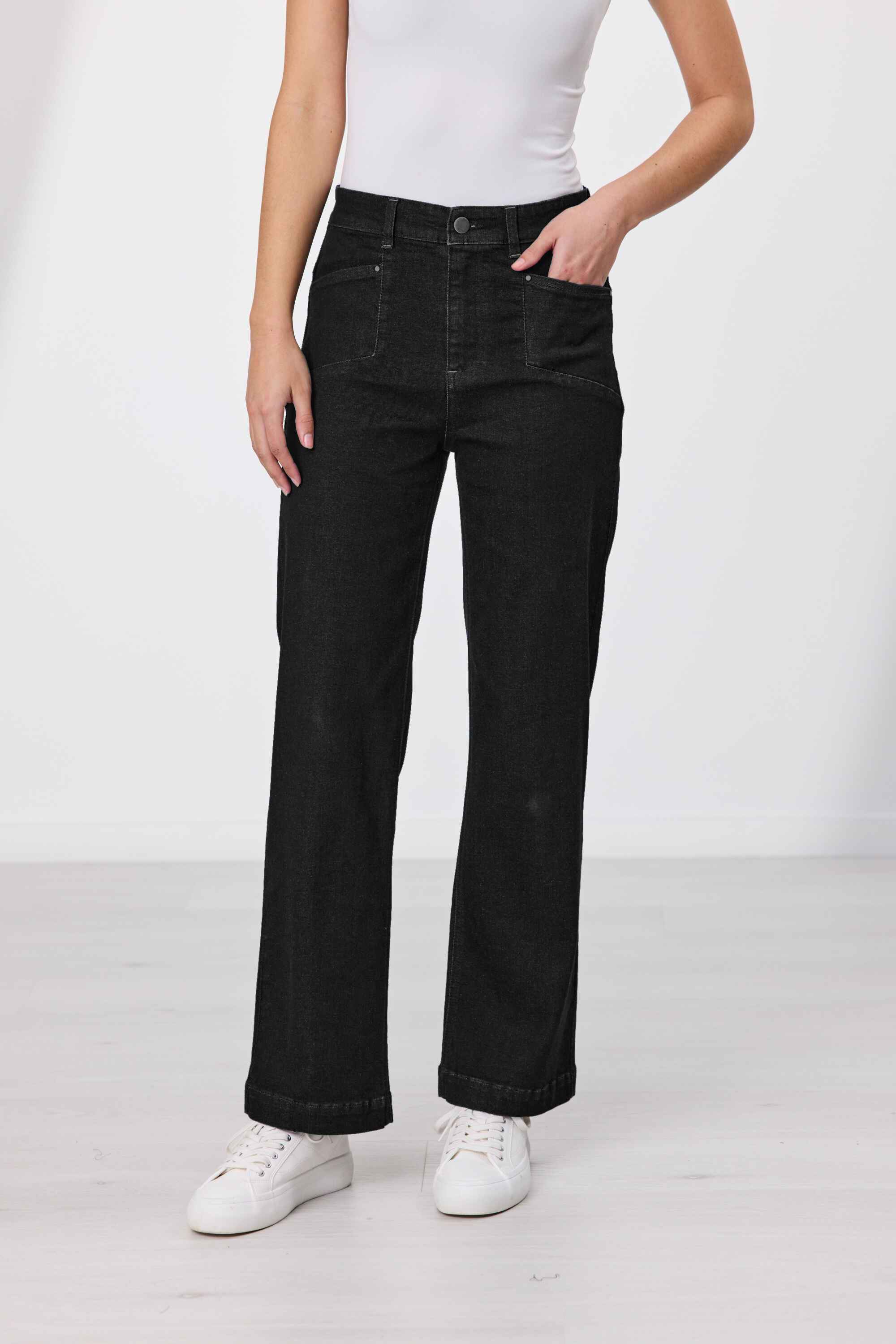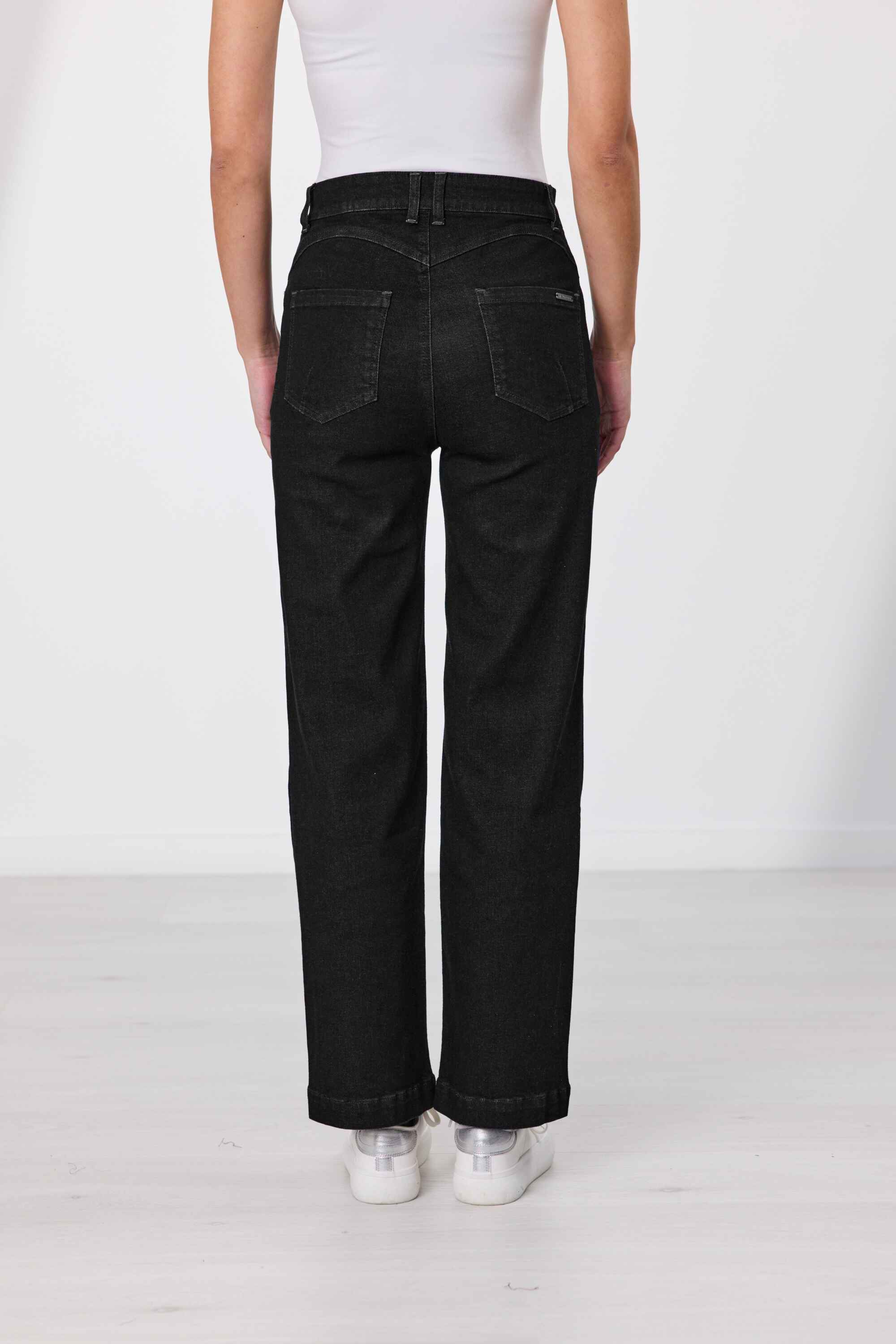 On trend, wide leg jean with four-pocket styling and shaped back yoke. Full length with a high rise waist and fly front.