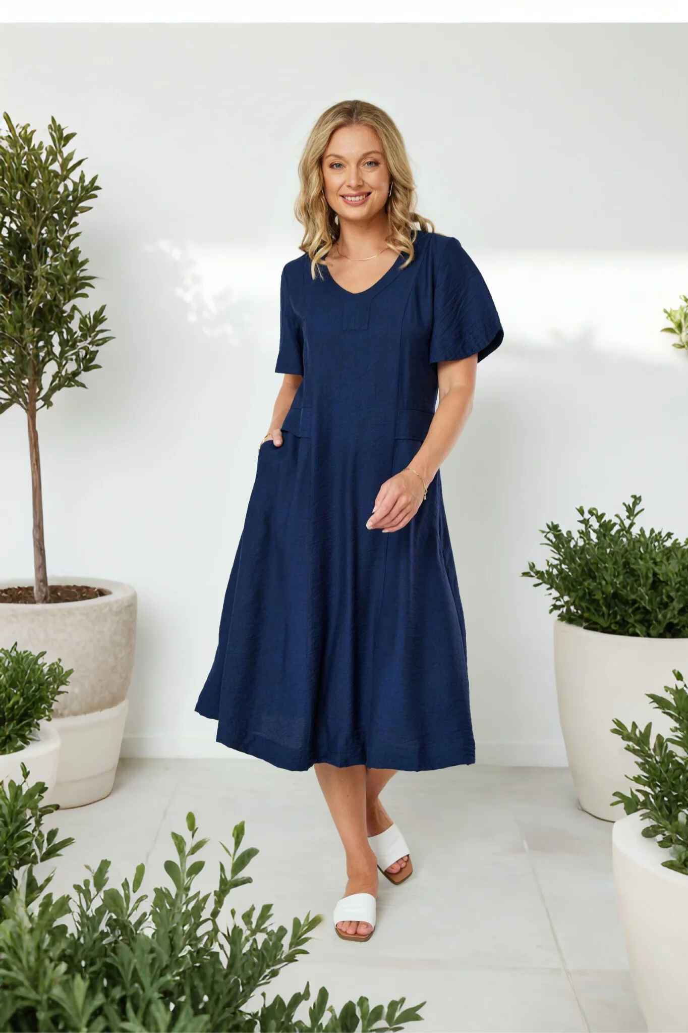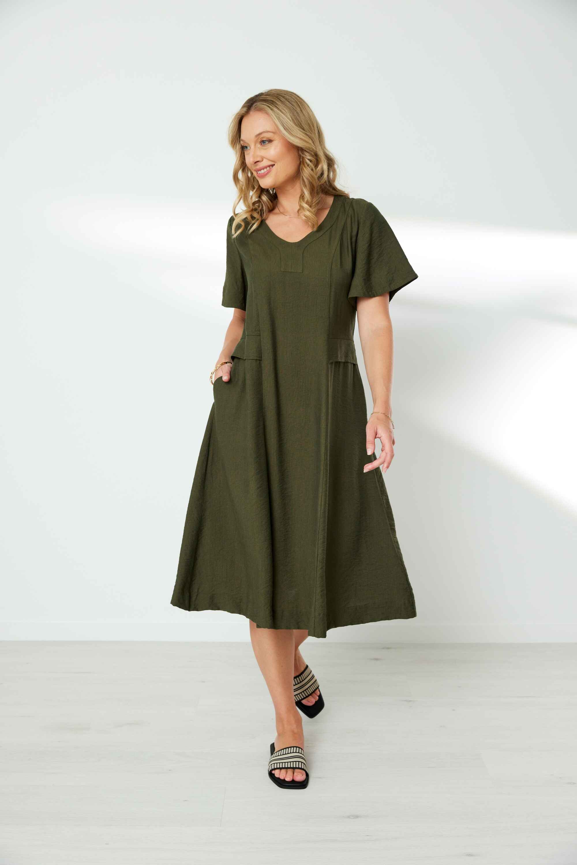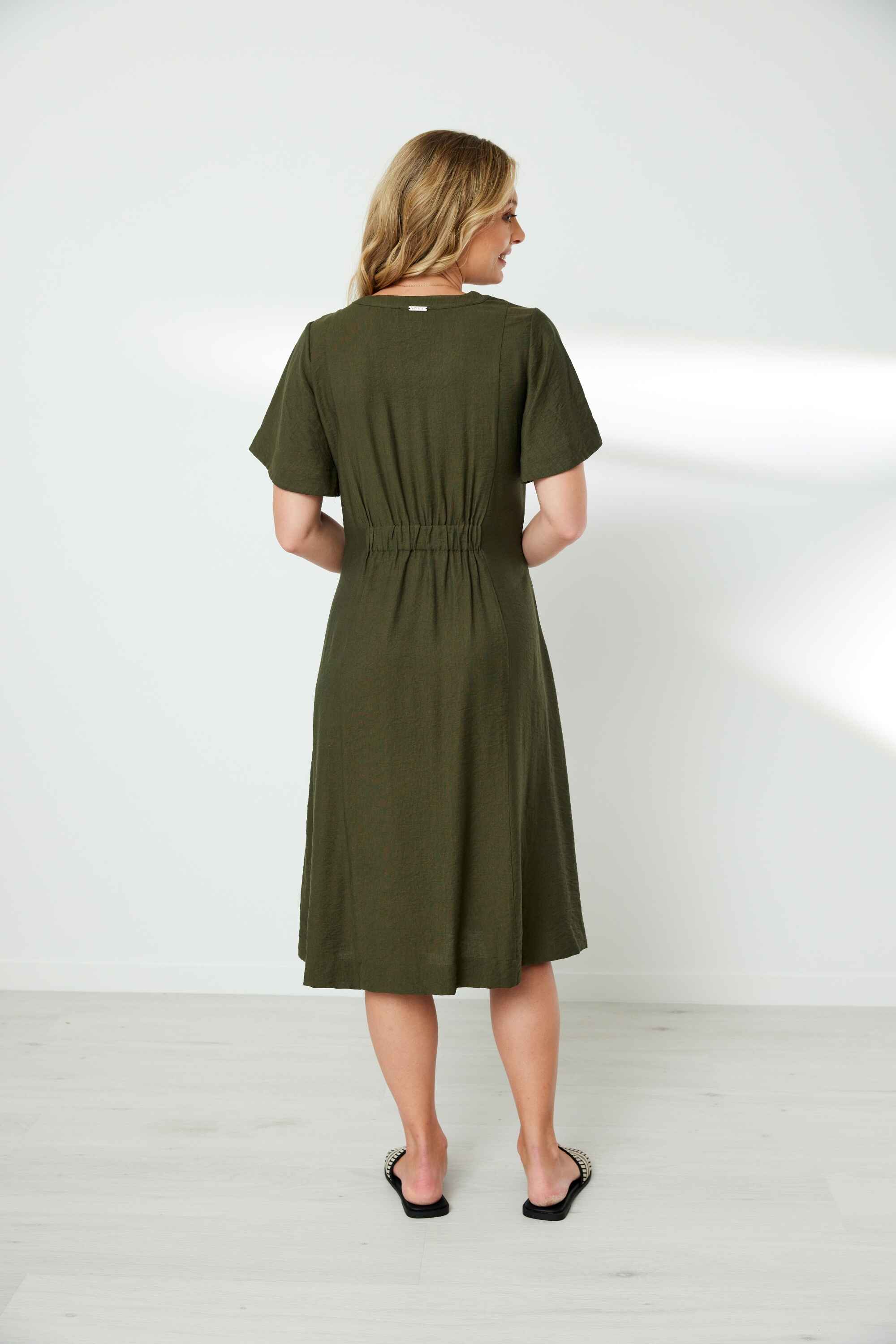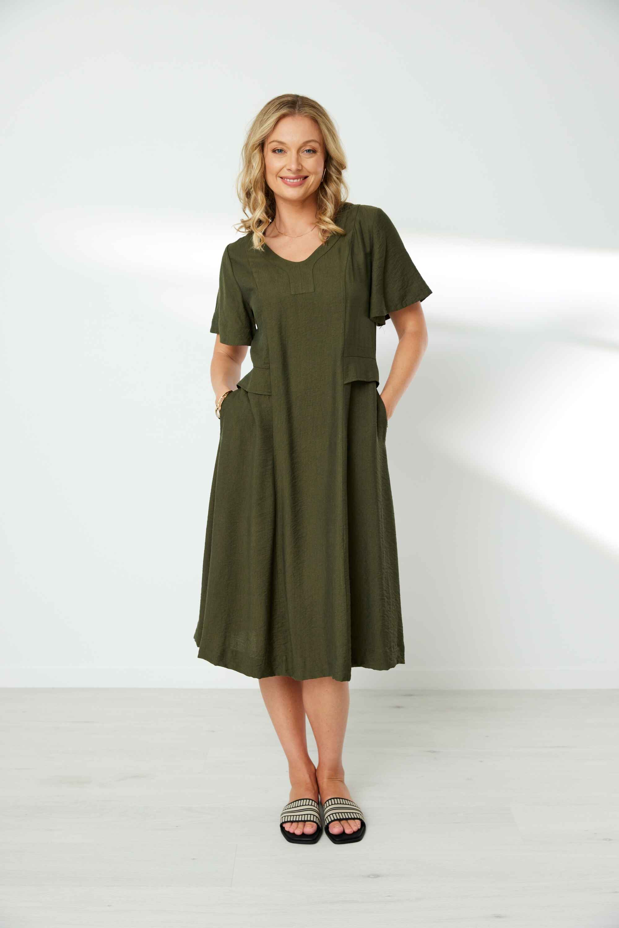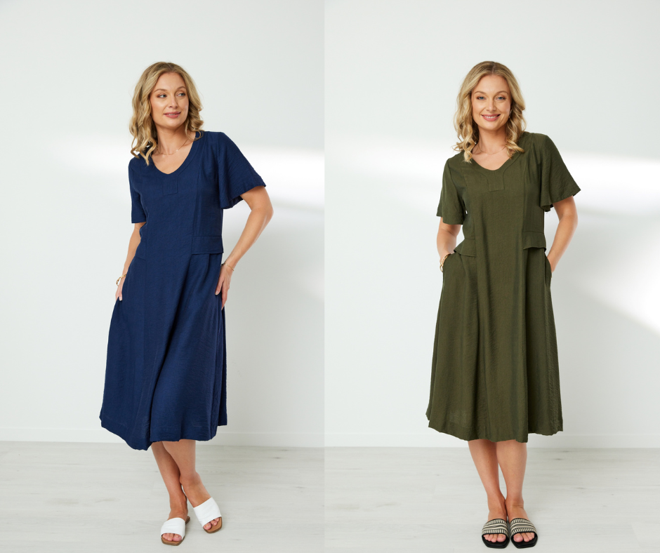 Shaped V neck band with front neck panel. Princess panel seams to give shape at front and back body. Overlaid self fabric panel at waist. Inseam pockets. Flutter sleeves. Waist seam at centre back is elasticated to make this an easy pull on dress.