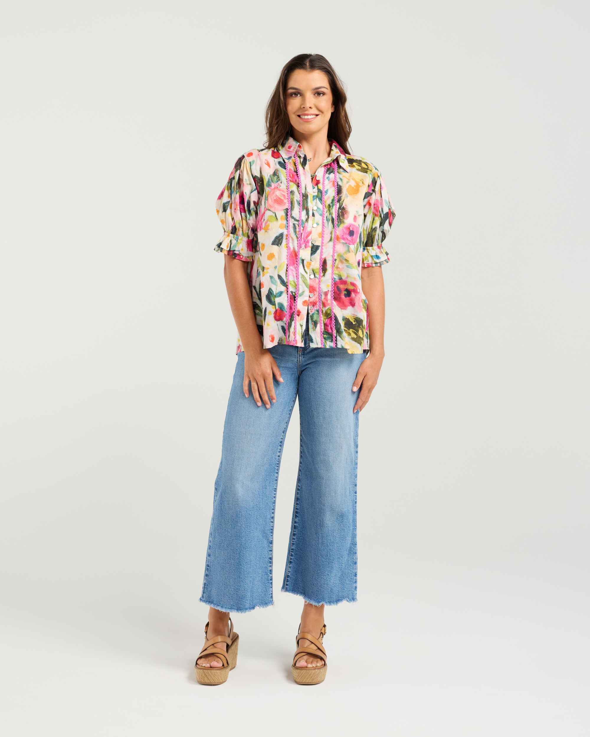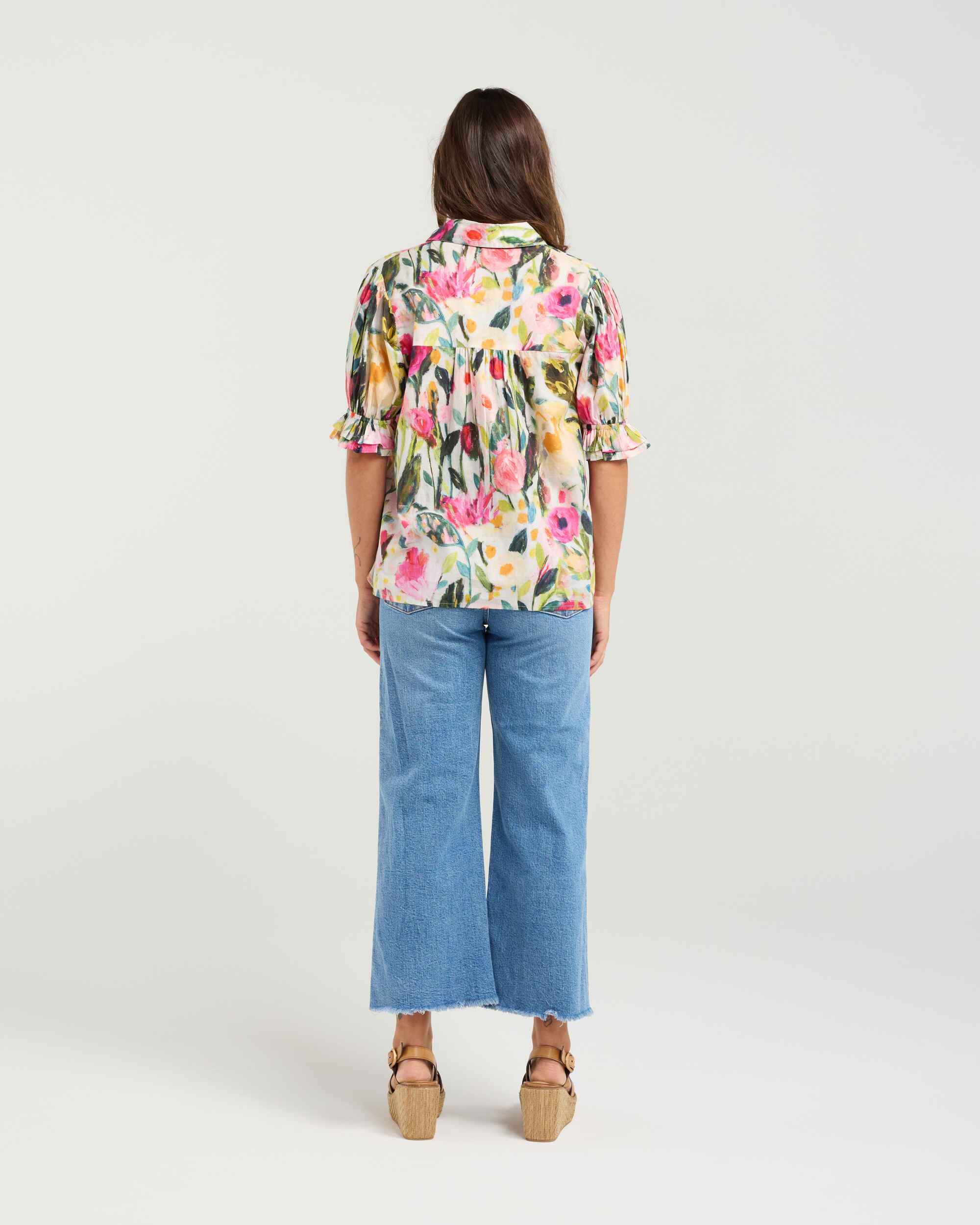 This is a romantic,painterly floral blouse. With a collared neckline, shell buttons and vertical lace trim. The gathered elbow length sleeves with soft ruffles add a touch of charm.Please note: Our garments run one size larger than standard sizing. We recommend selecting one size down for the best fit.100% CottonCare Instructions:Wash inside out, cold gentle wash with similar colours. Do not soak or bleach. Line dry in shade, do not tumble dry. Dry cleanable. Always check the label.