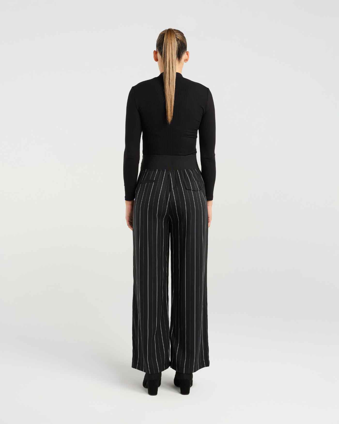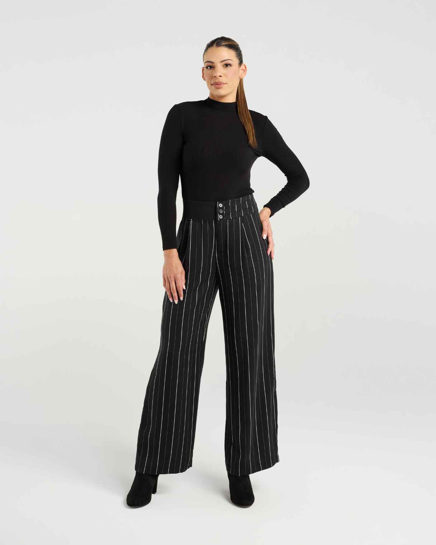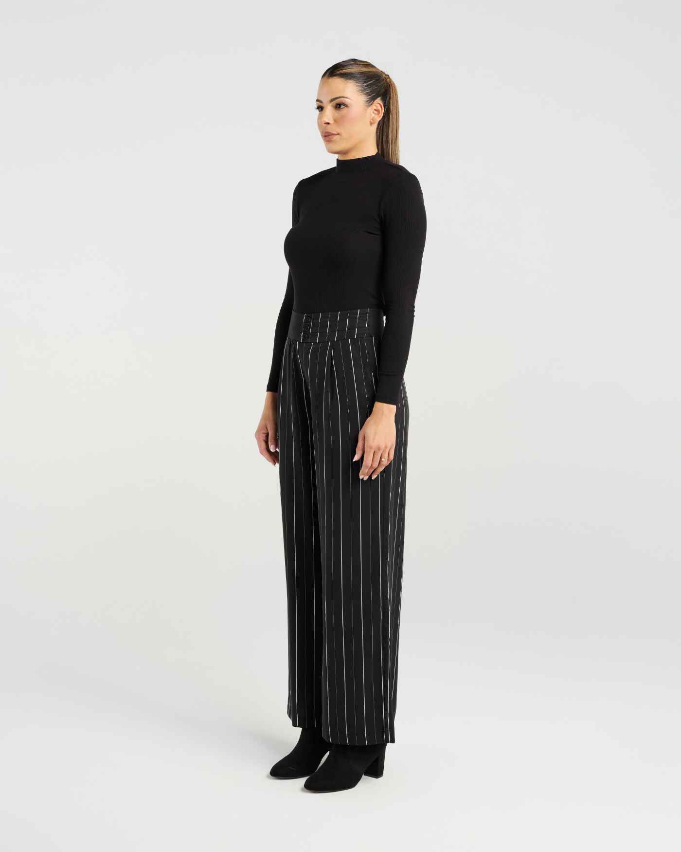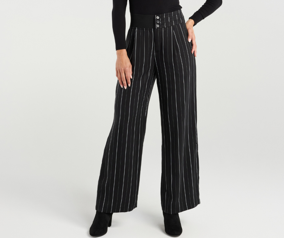 A tailored classic with a modern twist. These black wide-legged pants feature a fine white pinstripe with a thick elasticated waist band with triple buttons for a flattereing enlongated look.98% Tencel 2% Polyester