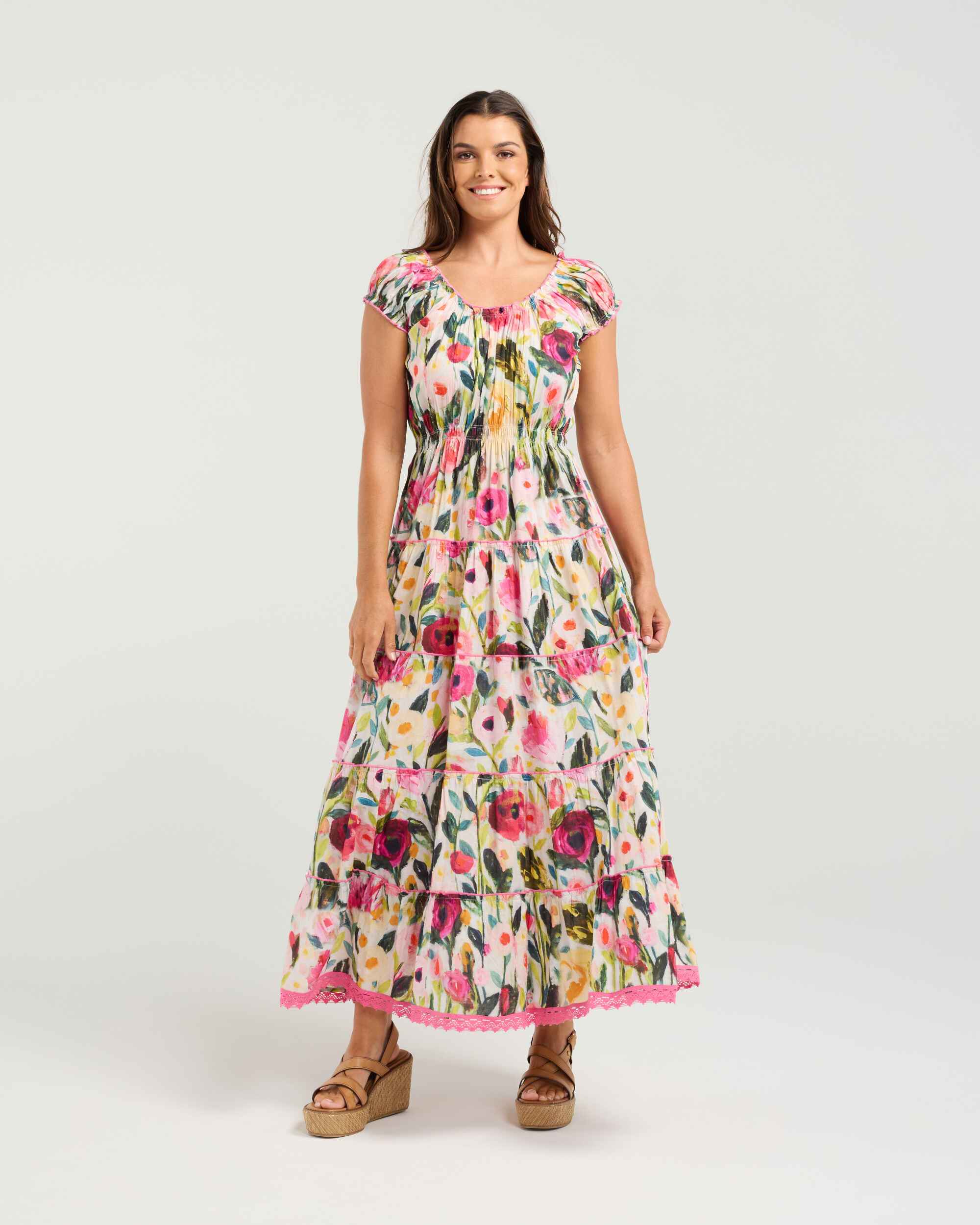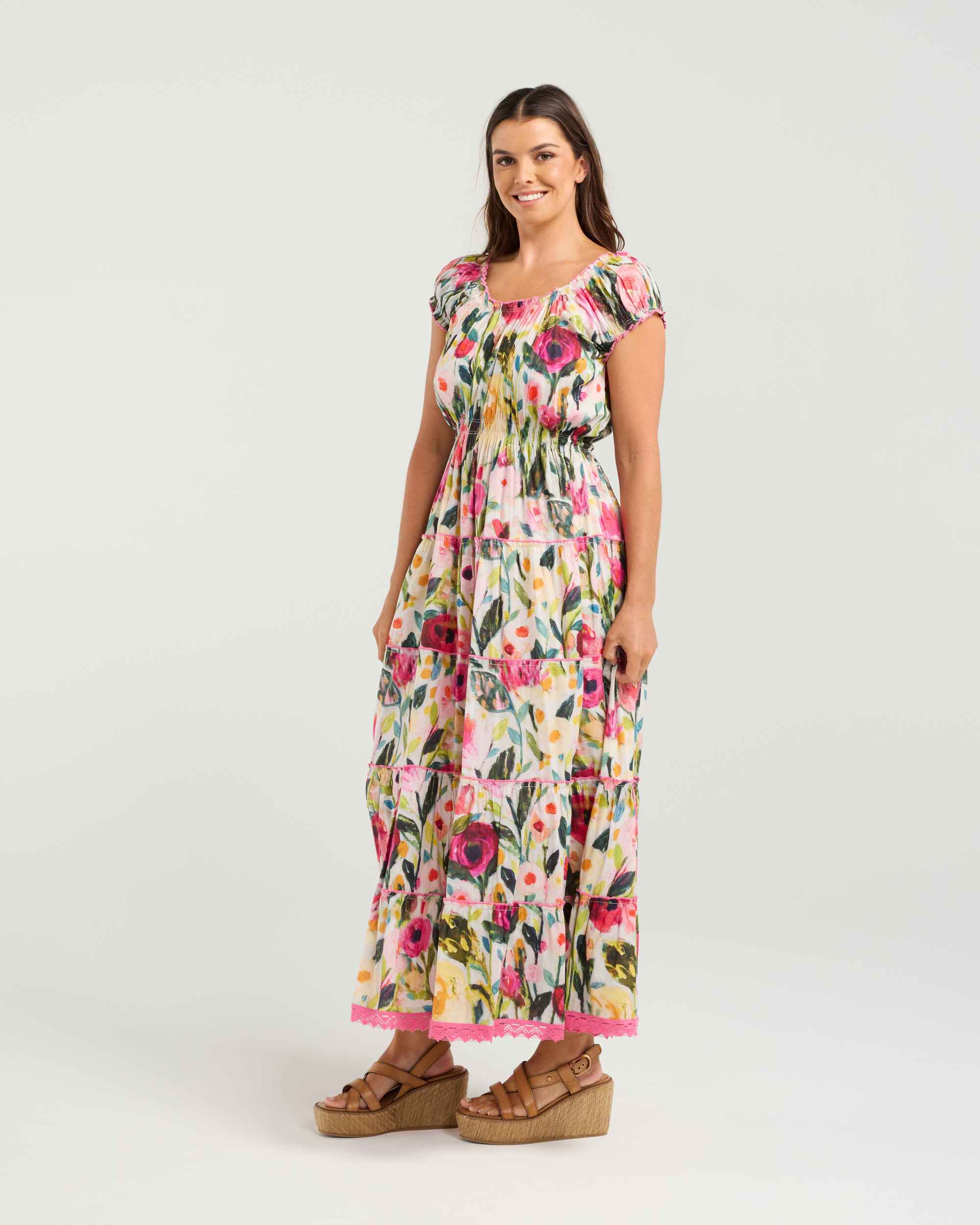 Flowy maxi dress with a romantic painted floral print in pink, green and yellow hues. Designed with flutter sleeves, tired skirt, and a scalloped lace trim for a soft, feminine charm.