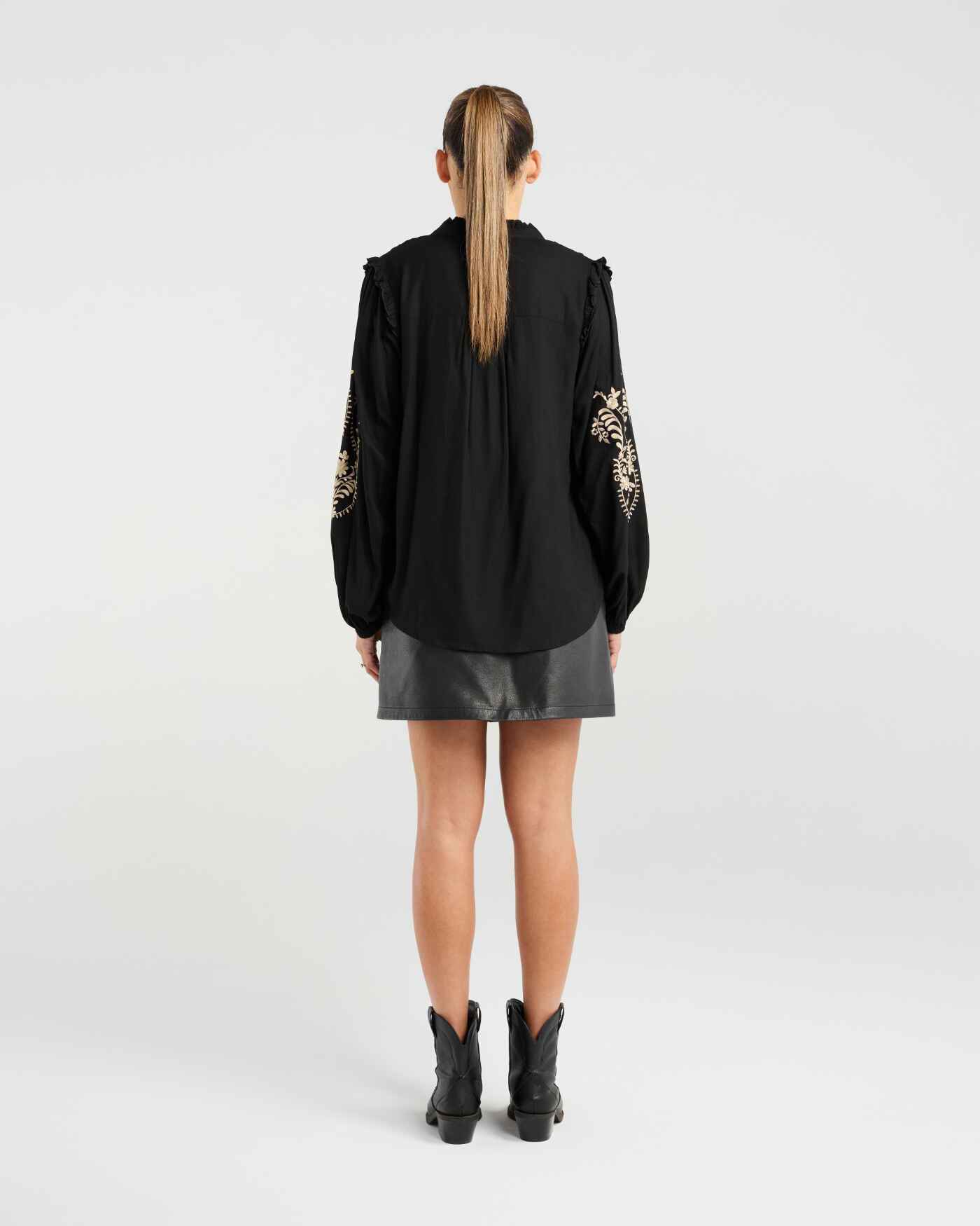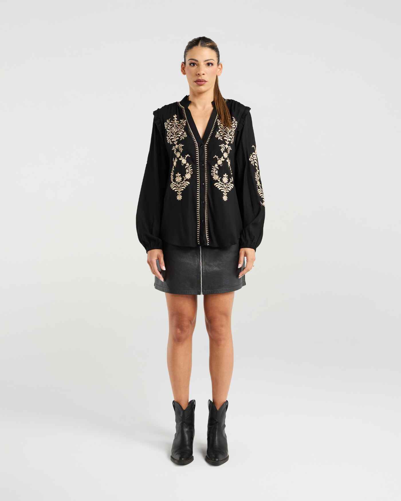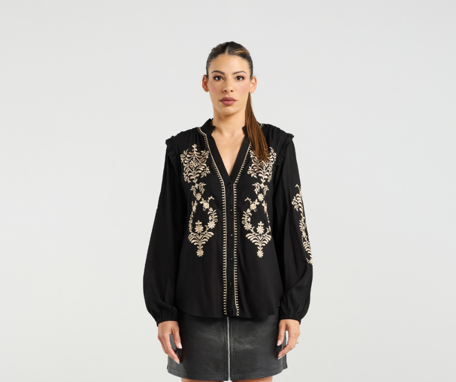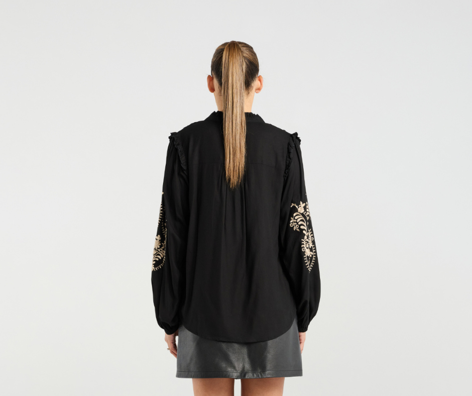 Chic and feminine, this black blouse features a delicate gold embroidery and flattering button front design. Finished with subtle ruffle details on the sleeves.