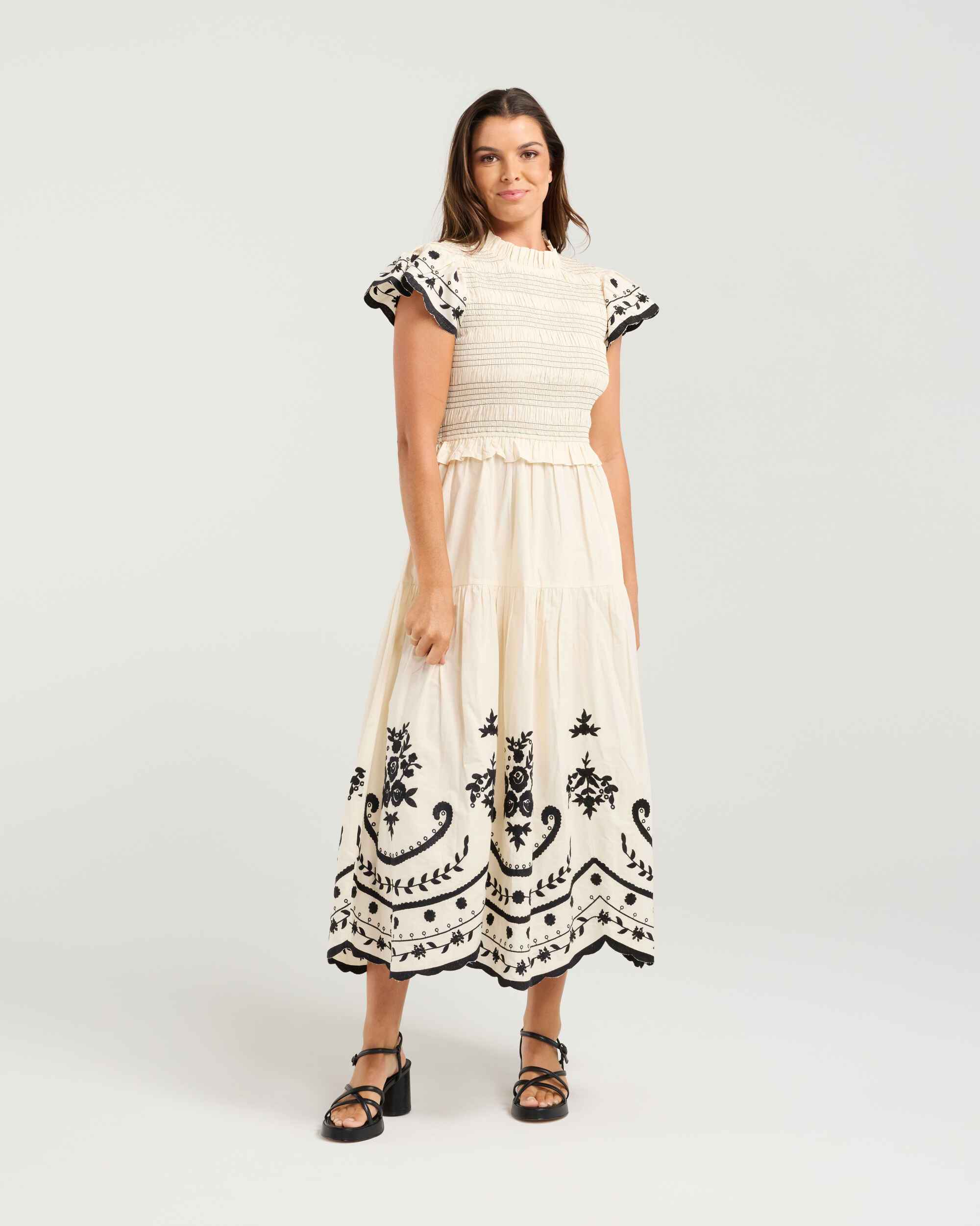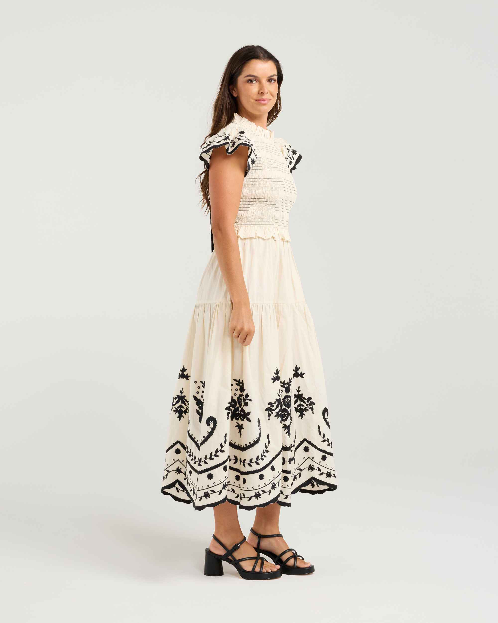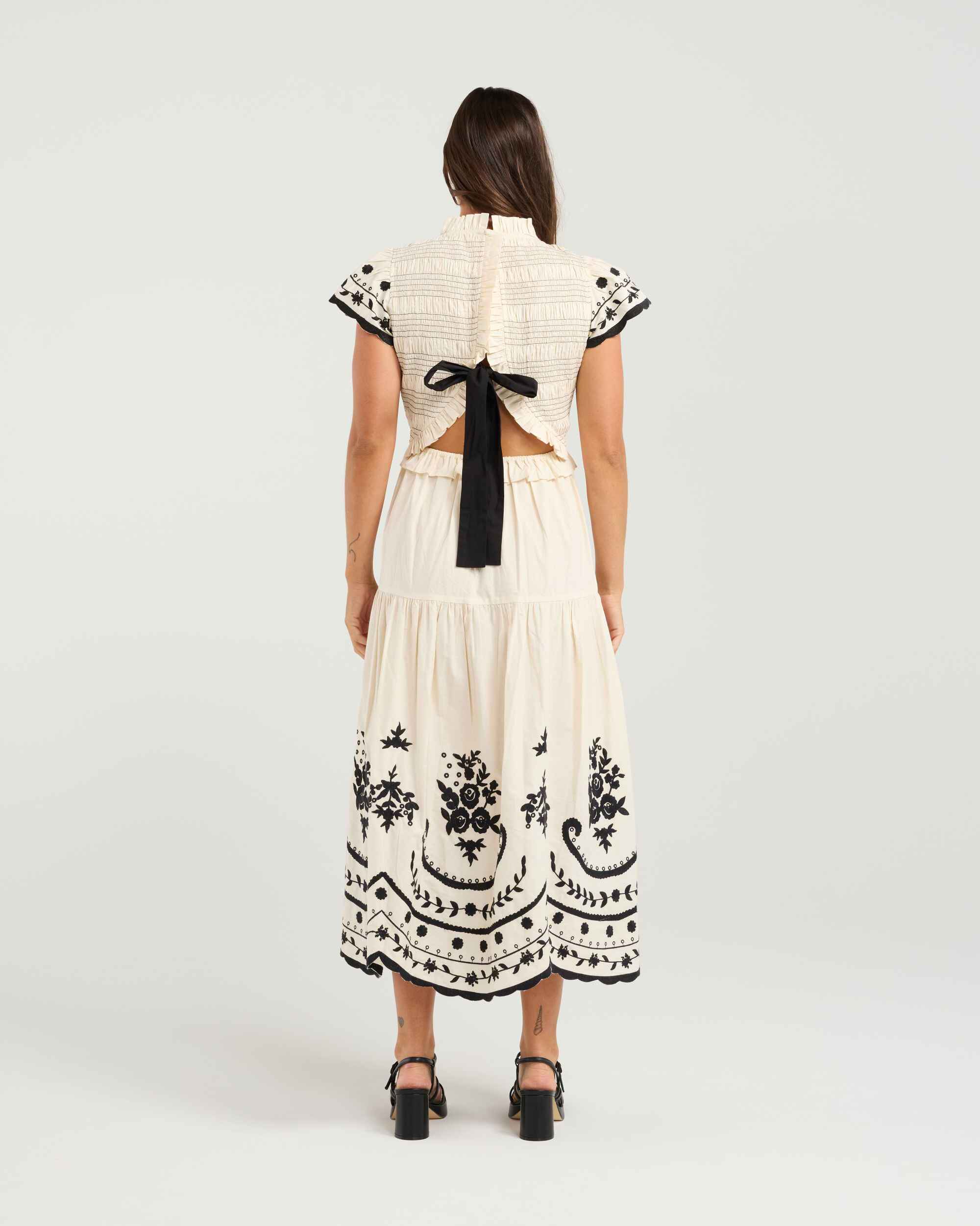 This romantic cream maxi dress blends vintage charm with a modern flair. The bodice features horizontal ruching and delicate ruffle trim around the neckline and waist. The full skirt is tiered and embellished with black floral embroidery. The standout feature is the open back, fastened with a soft black tie. 100% Cotton Please note: Our garments run one size larger than standard sizing. We recommend selecting one size down for the best fit.