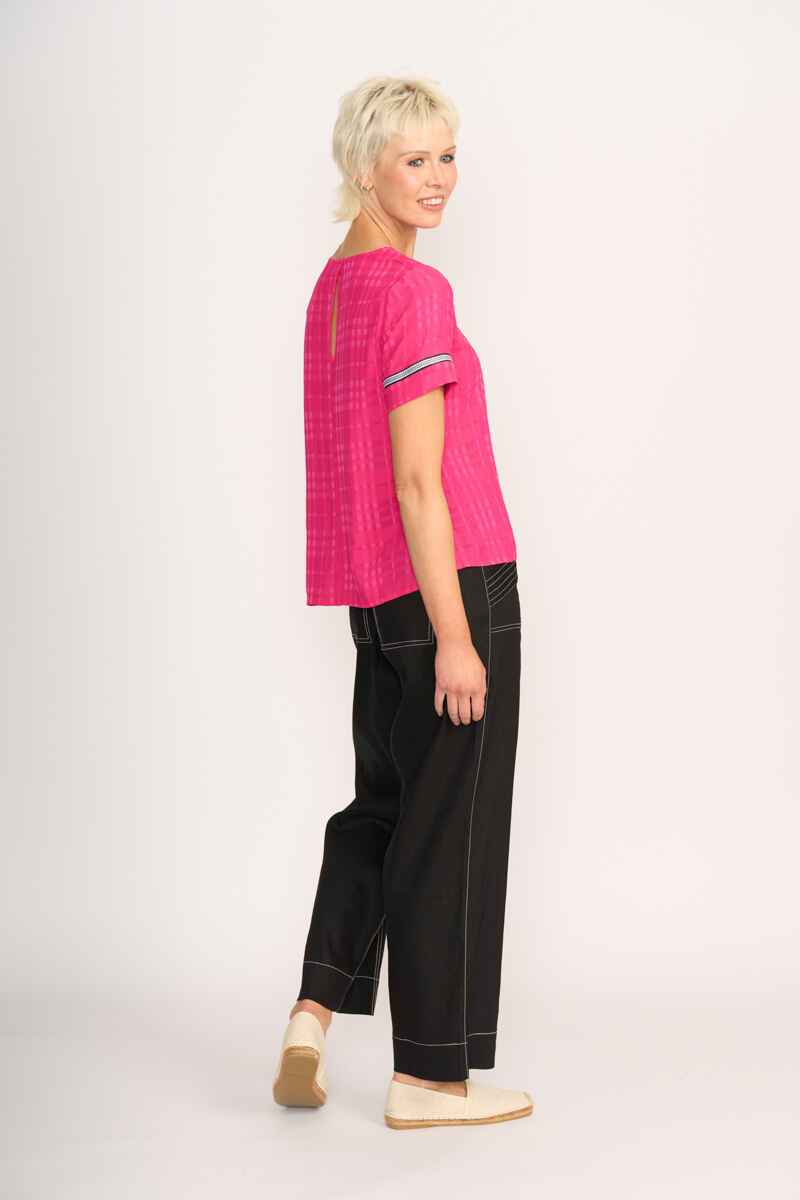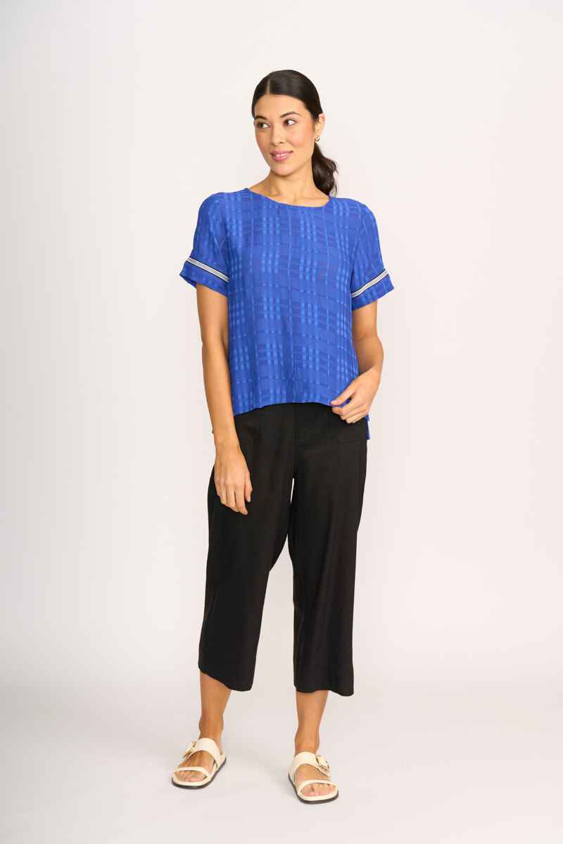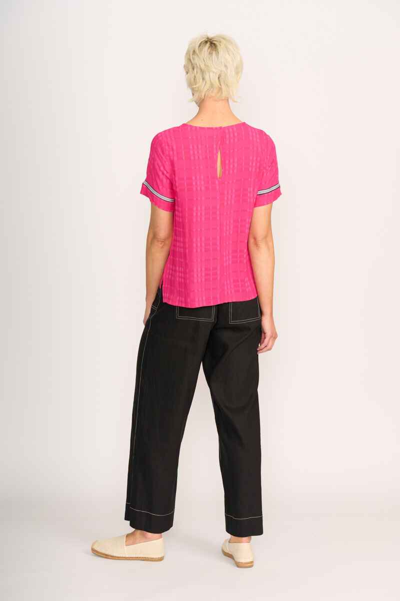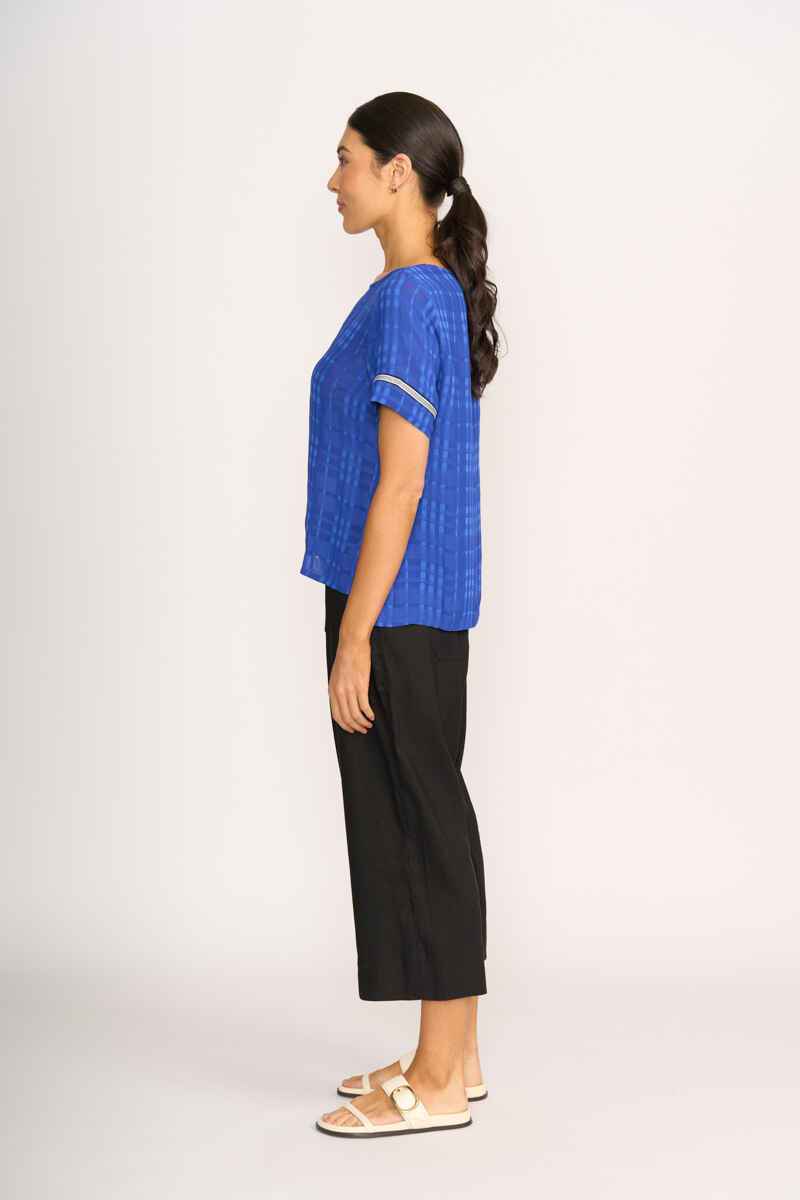 A relaxed fit textured check top with a crossover back keyhole detail. Contrast  trim panel in the cuffs. Step hem with small splits at the side seams. Body length measurement is approx. 61cm for the front and 64.5cm for the back (size 12)
